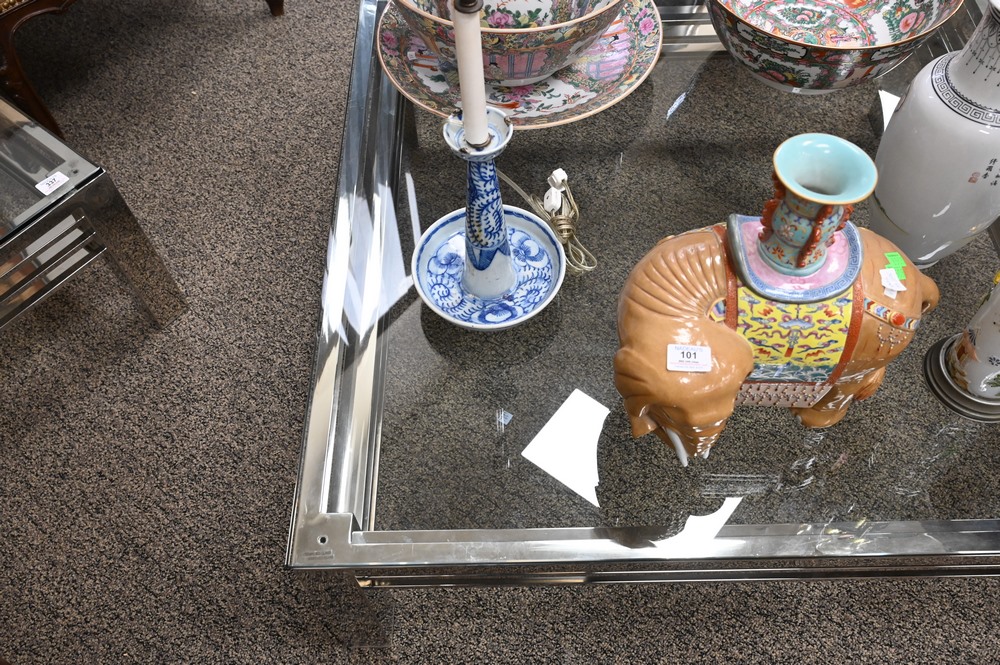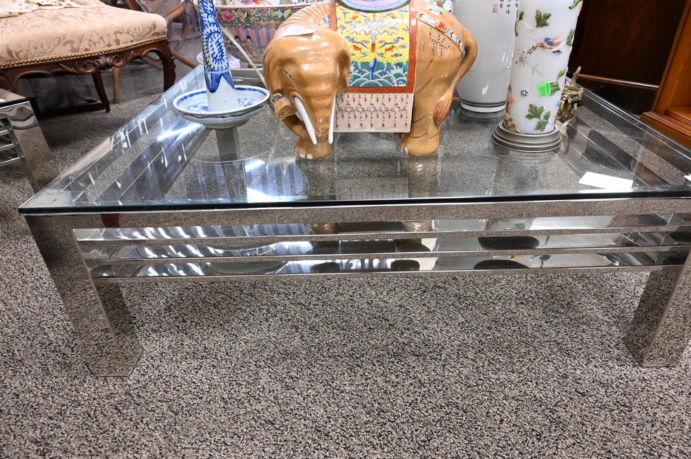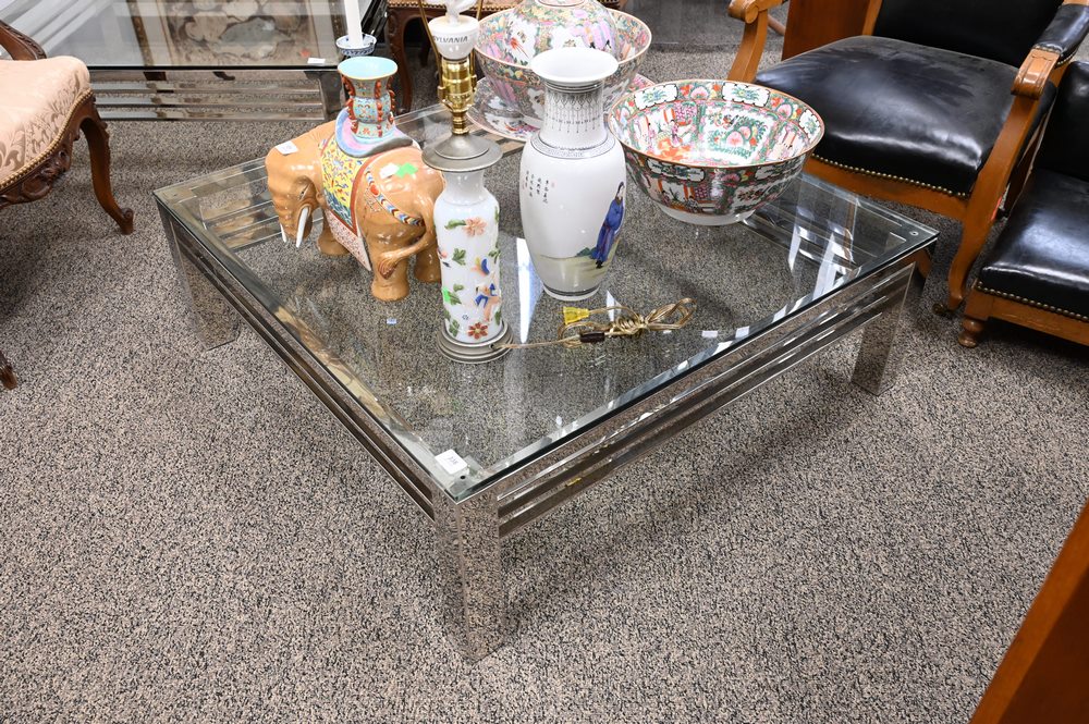 Chrome and Glass Coffee Table, height 13 inches, top 39 1/2″ x 39 1/2″.