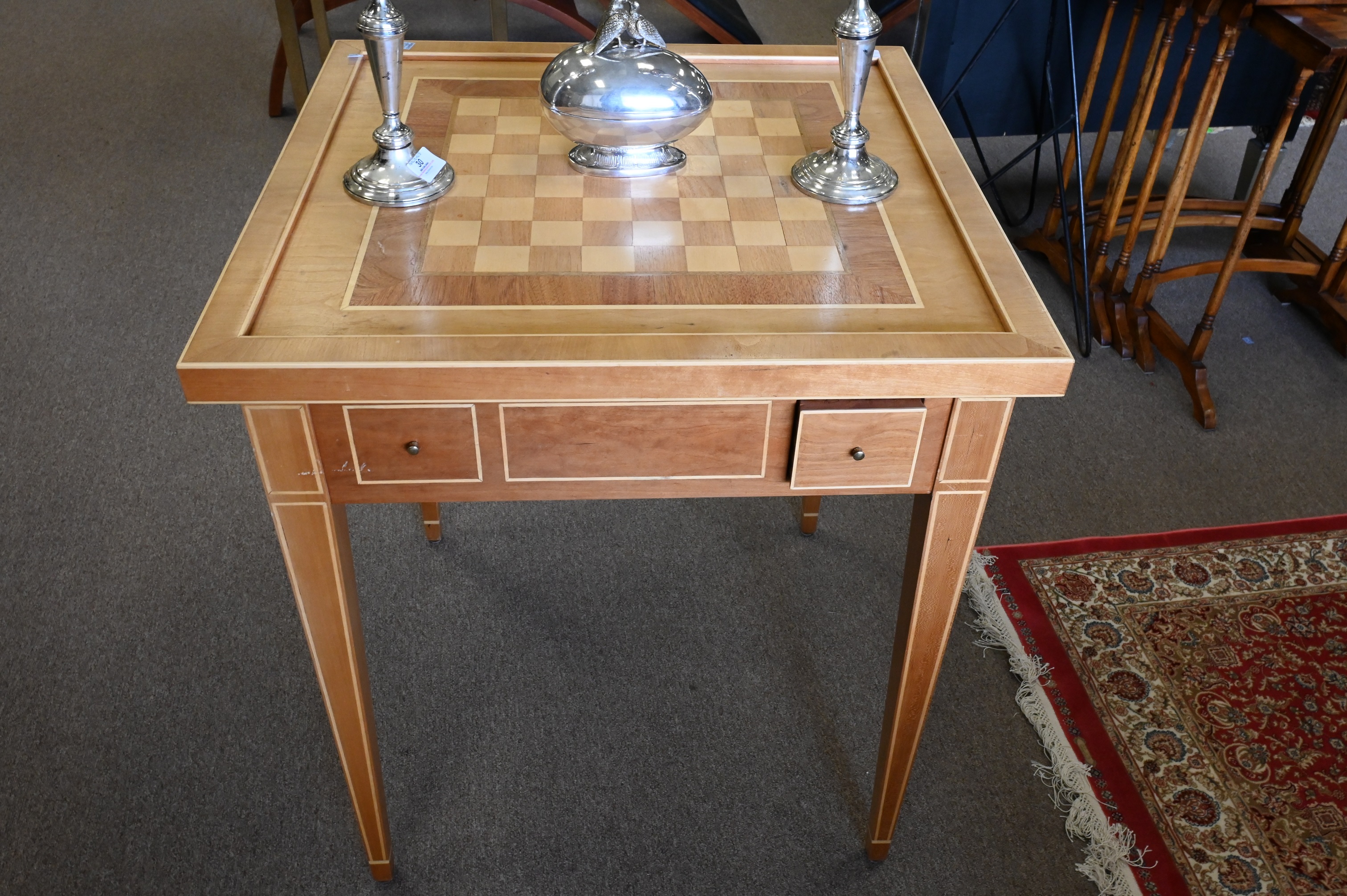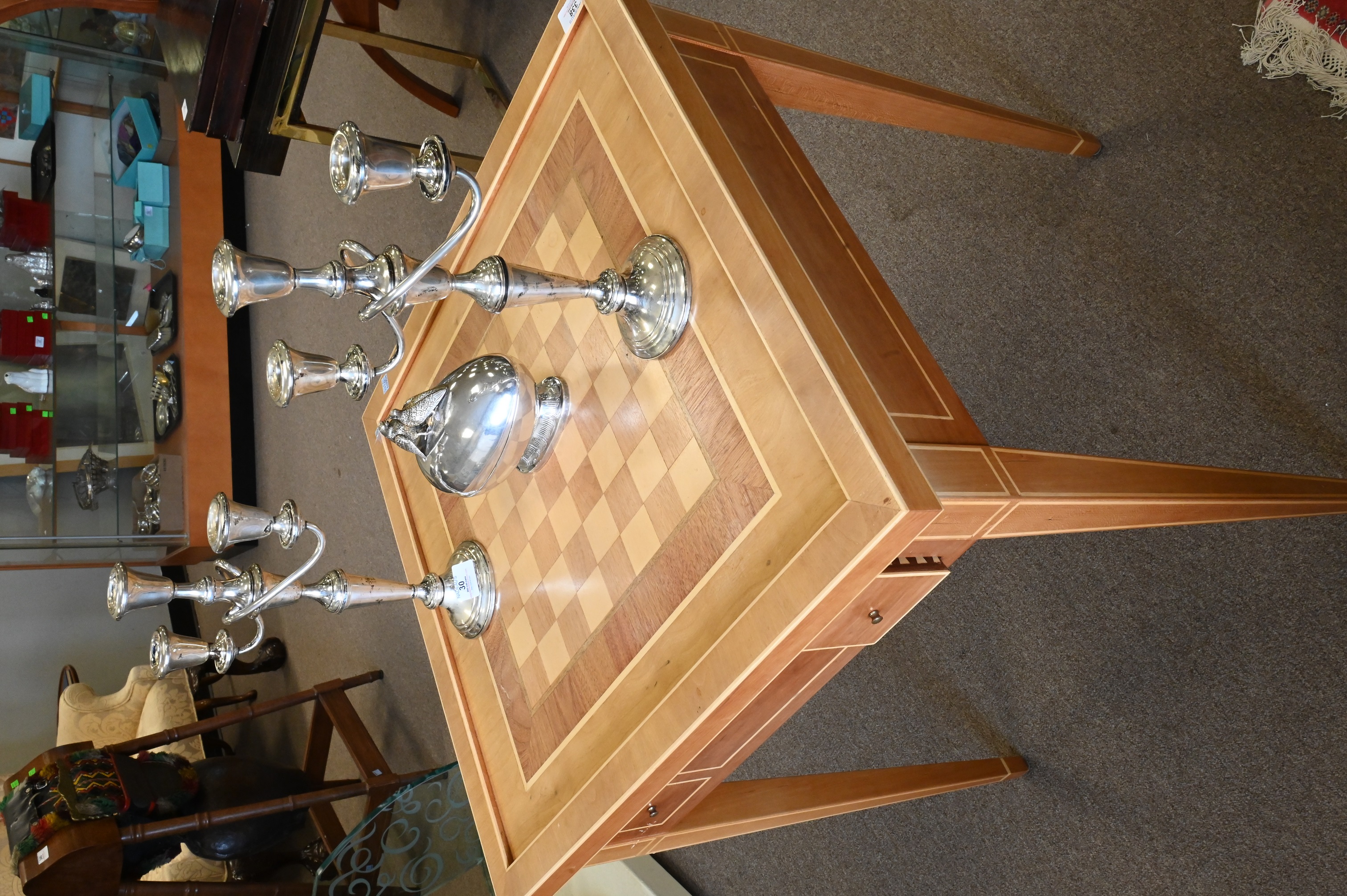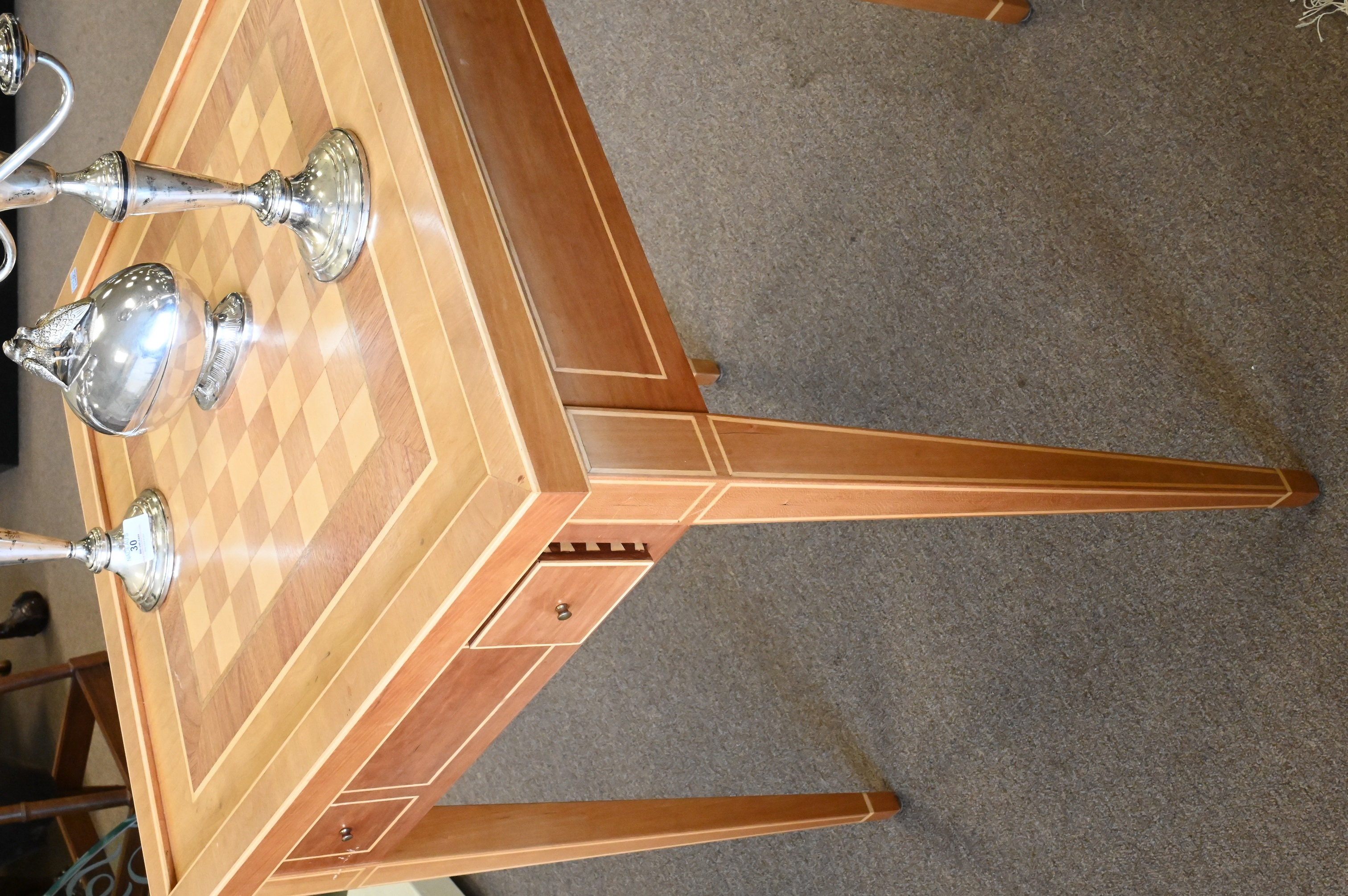 Lot 338: Custom Inlaid Chess/Checkerboard Flip Top Solid and Backgammon Table