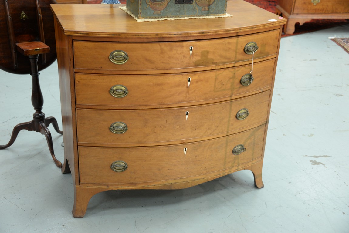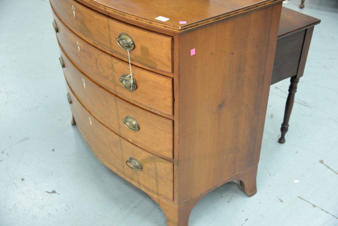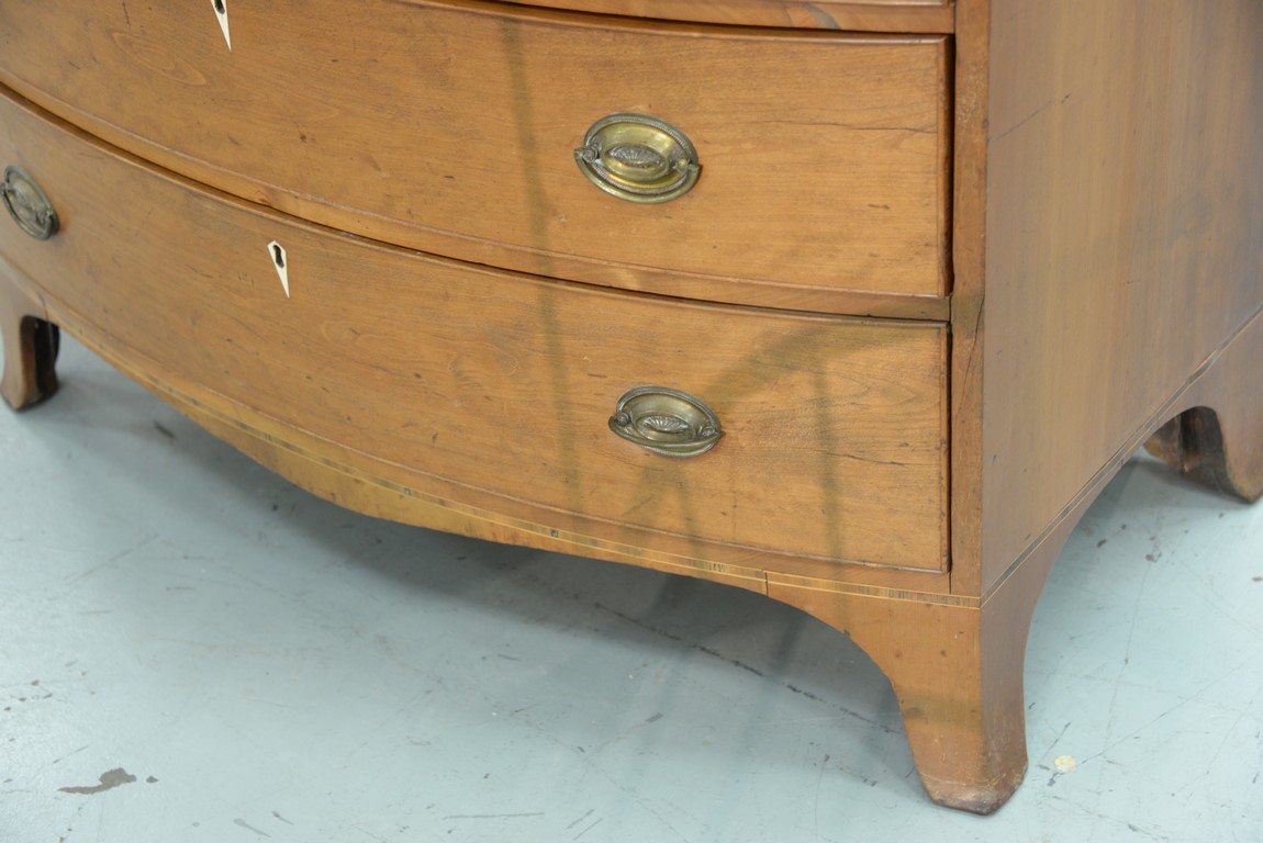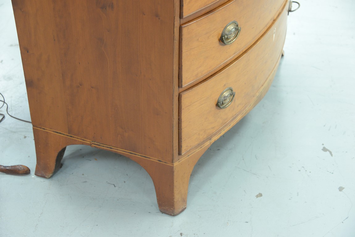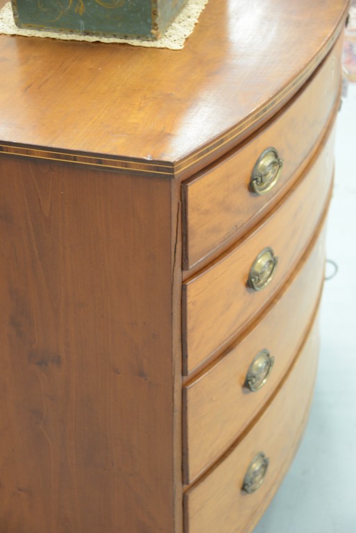 Lot 338: Federal cherry bowed front chest of four drawers on flared French feet and original oval brasses, circa 1790-1810. ht. 37 1/4 in. wd. 40 3/4 in. dp. 23 in.