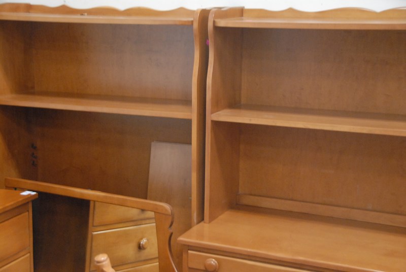 Five piece maple bedroom set to include twin bed, bookcase, chest with mirror, and desk.