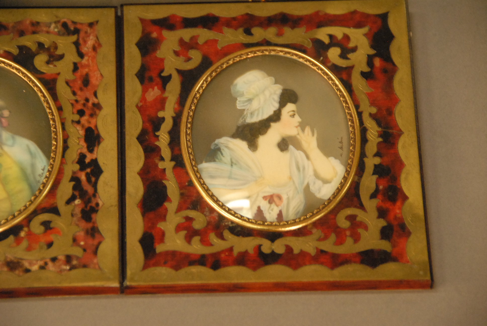 Four framed miniature paintings, three of women and one of a man, two are initialed F. V. and two are signed Serbin.