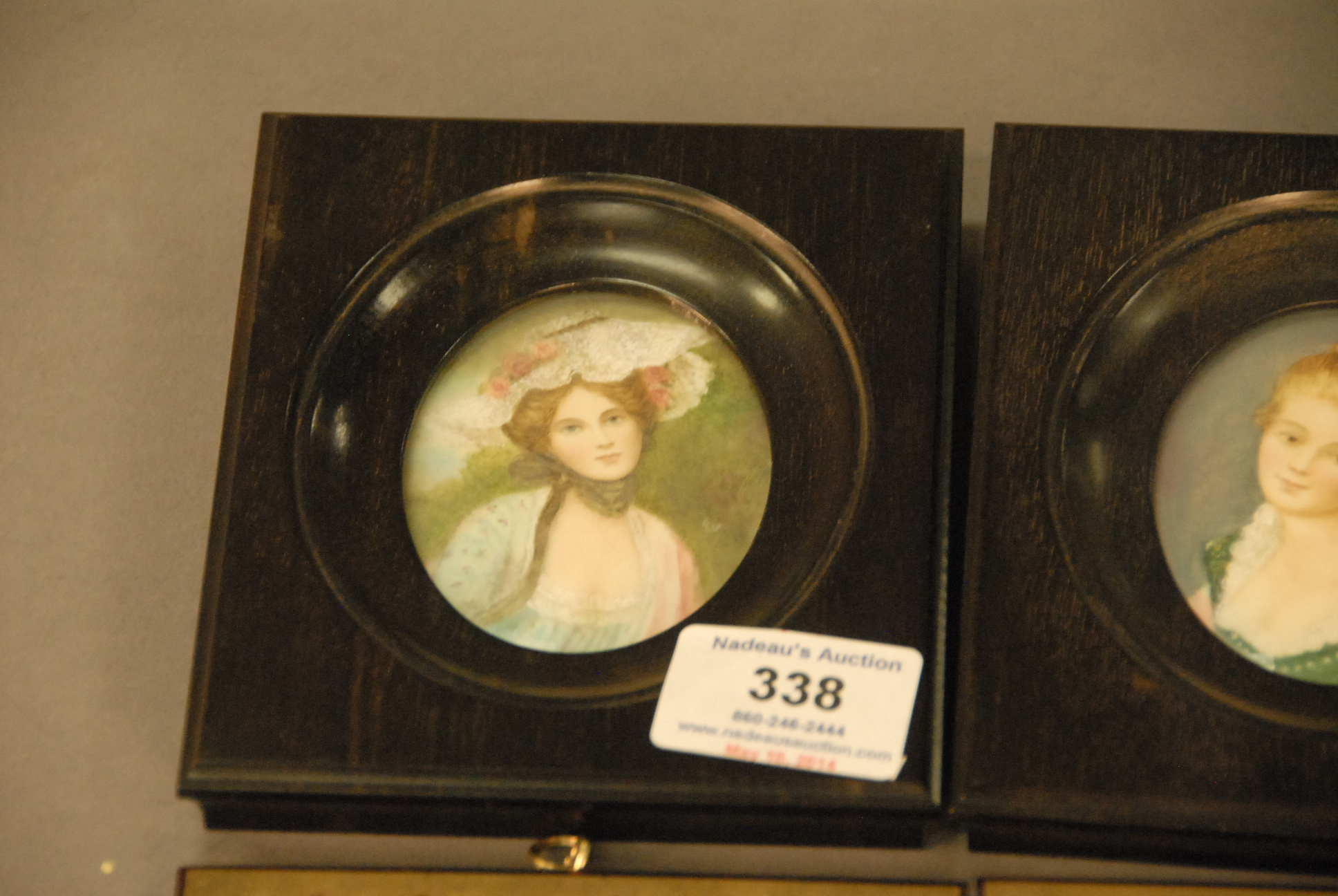 Lot 338: Four framed miniature paintings, three of women and one of a man, two are initialed F. V. and two are signed Serbin.