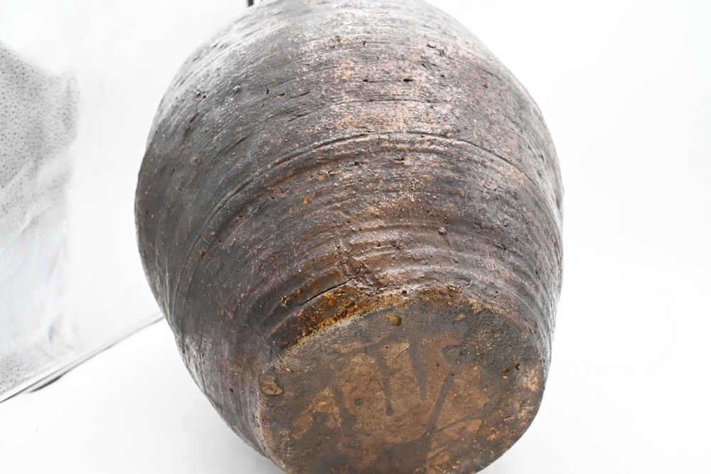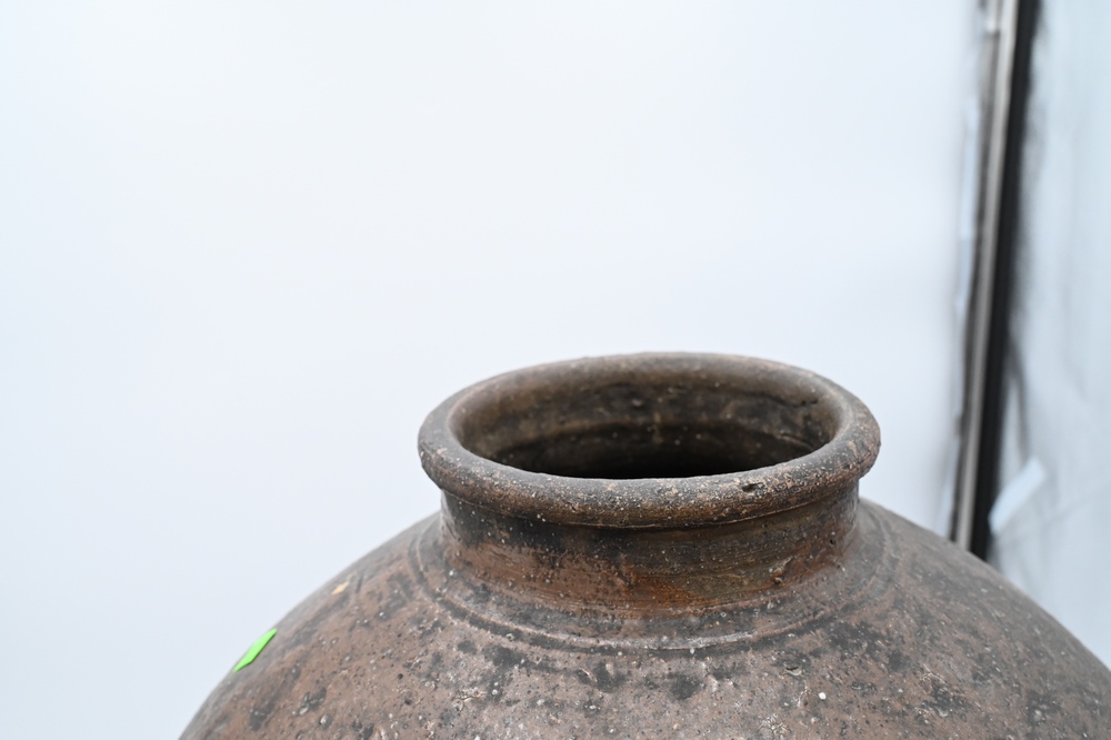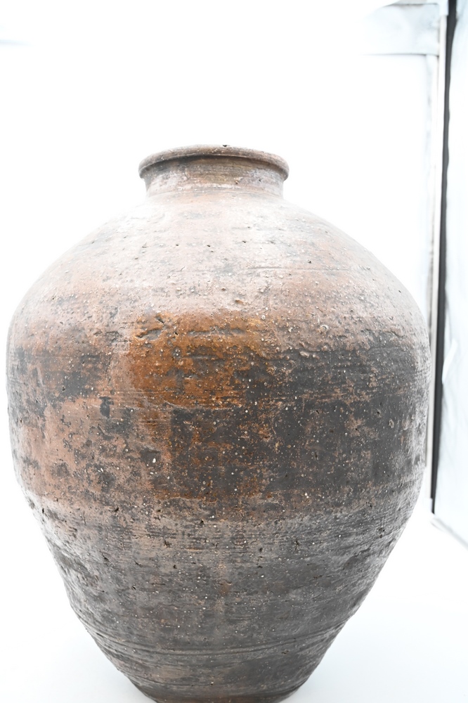 Lot 338: Large Stoneware Urn or Vase, brown glazed in bulbous form, height 22 inches, diameter 16 inches, top diameter 6 1/2 inches.