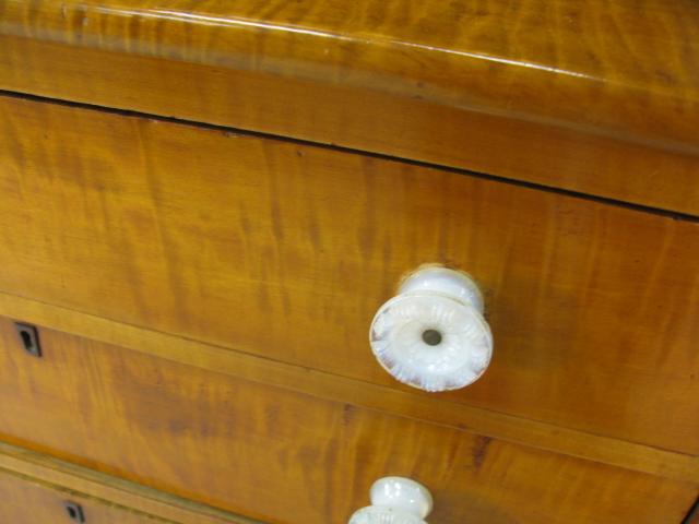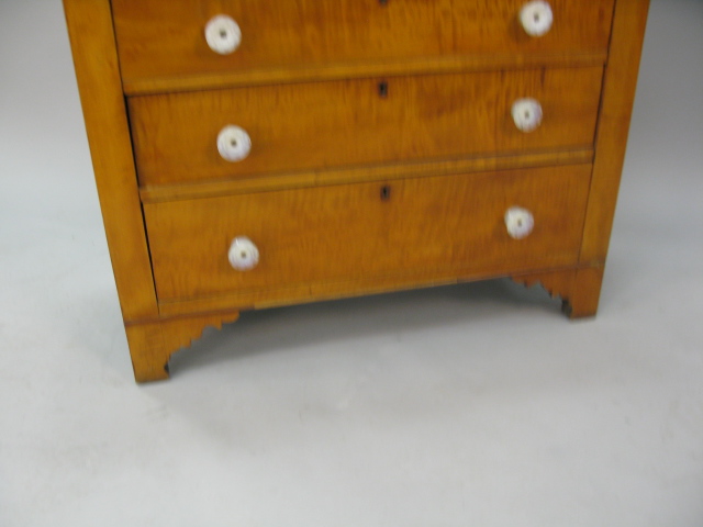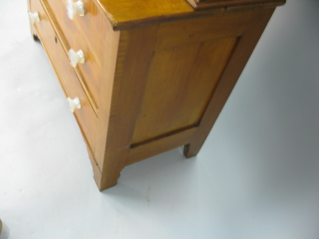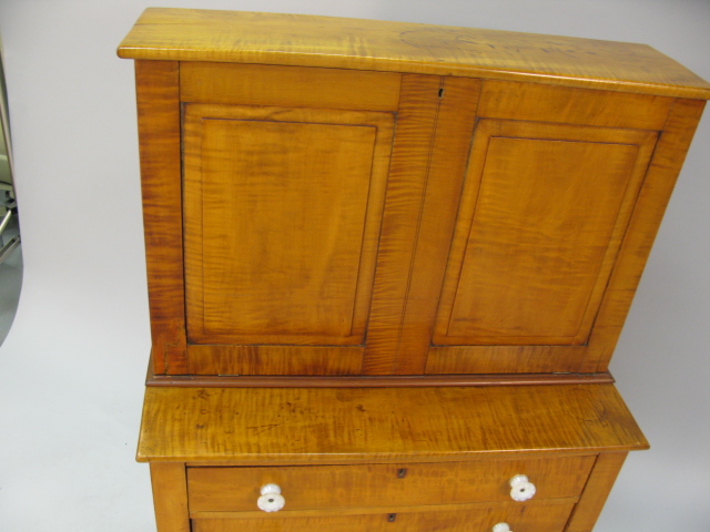 Maple and tiger maple fall front desk in two parts with three drawer base.