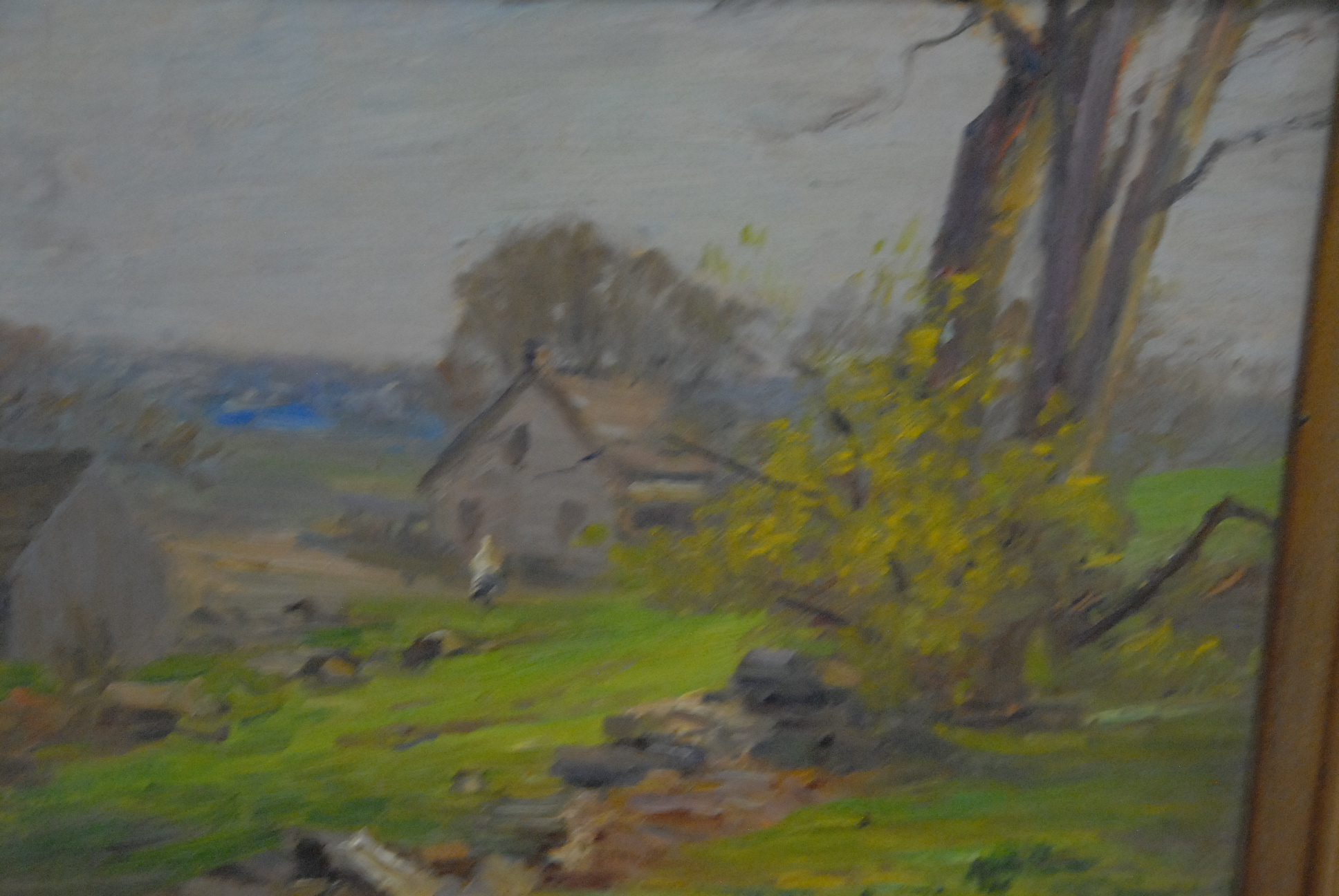 Oil on board country landscape with house, 7 1/4 x 9 1/2.