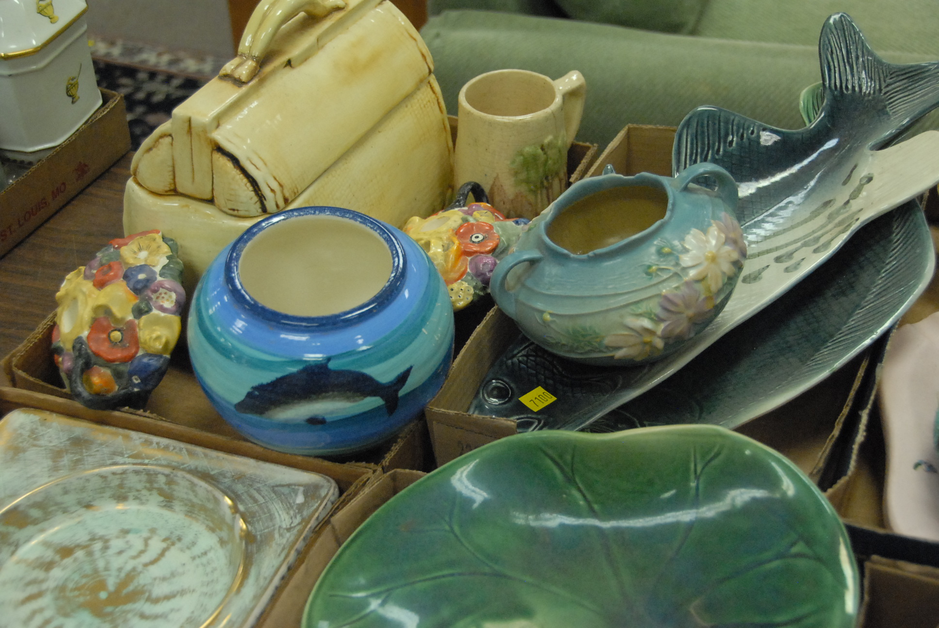 Six box lots of various pottery vases, fish plates, cookie jar, pitcher, etc.