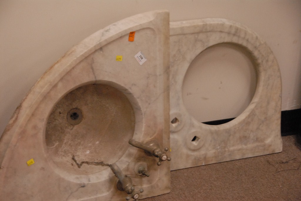 Two Vintage marble corner sinks, one with bowl and faucets.