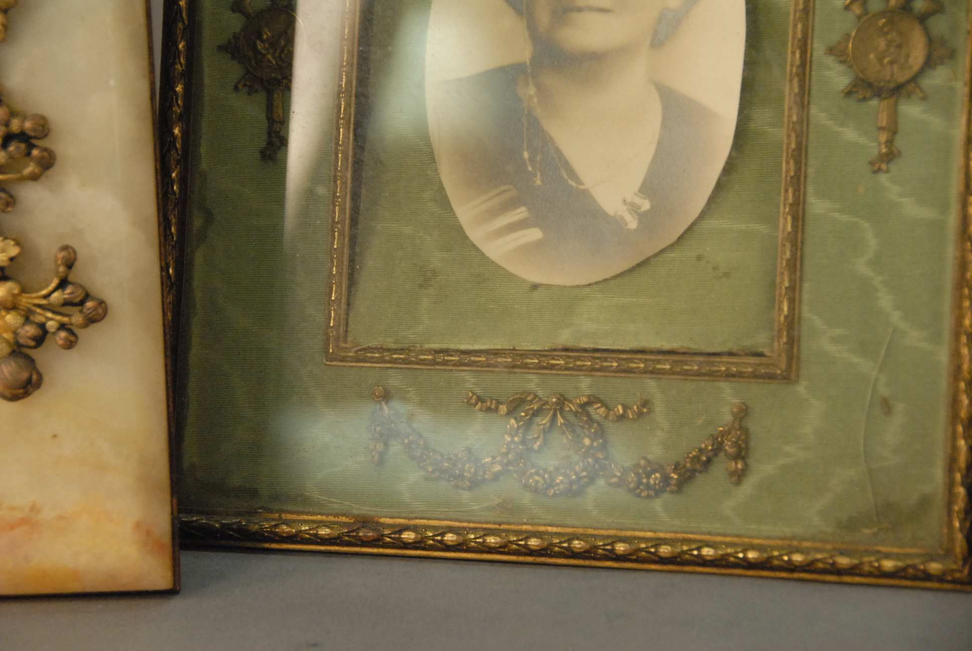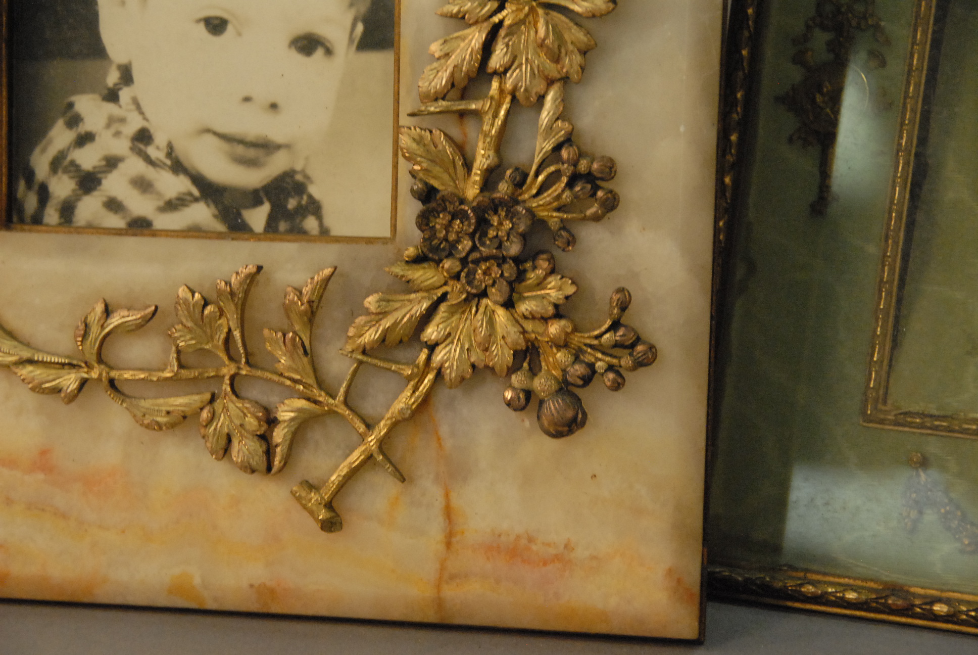 Lot 338A: Two picture frames to include Stern Brothers New York brass ormolu and a alabaster frame with brass mounts.