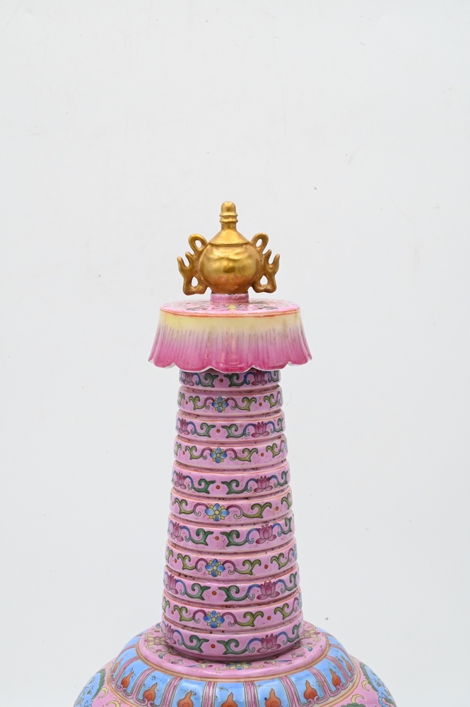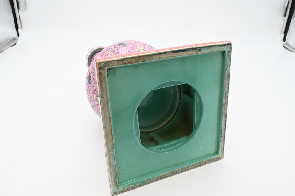 Chinese Famille Rose Porcelain Pagoda Censor, having pink ground with blossoming flower and vine decoration, height 17 inches.