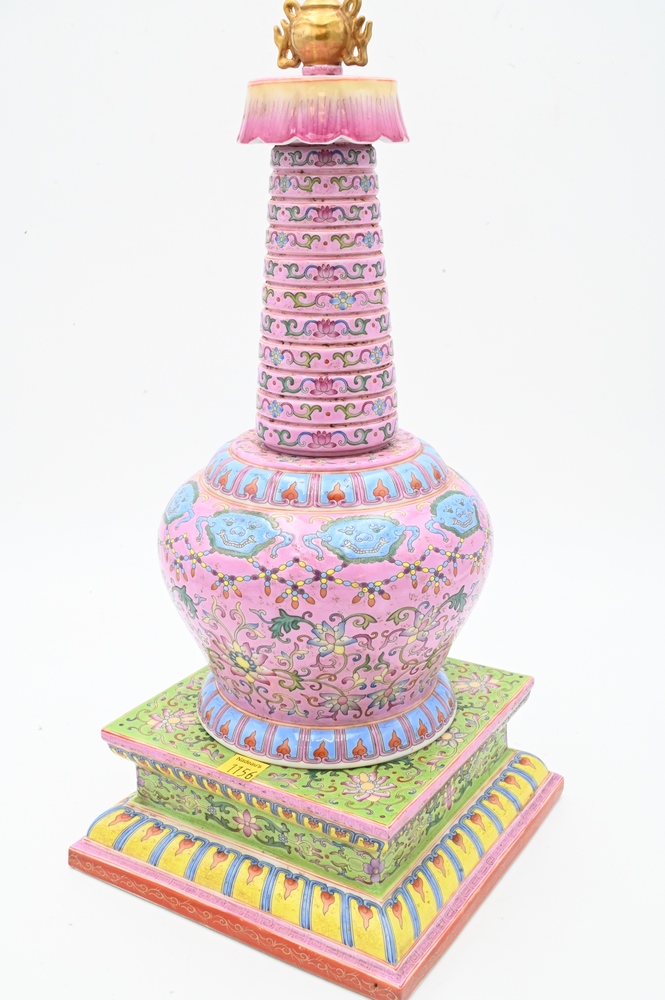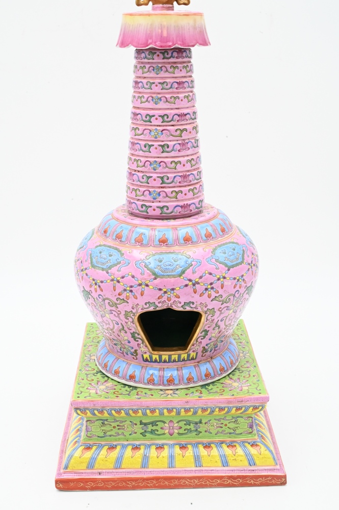 Lot 339: Chinese Famille Rose Porcelain Pagoda Censor, having pink ground with blossoming flower and vine decoration, height 17 inches.