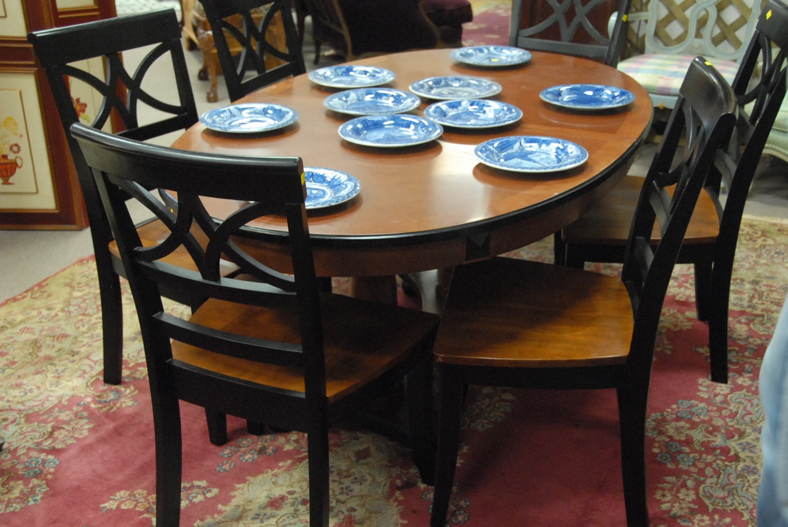 Contemporary oval table with two leaves and six chairs. ht. 30 in.