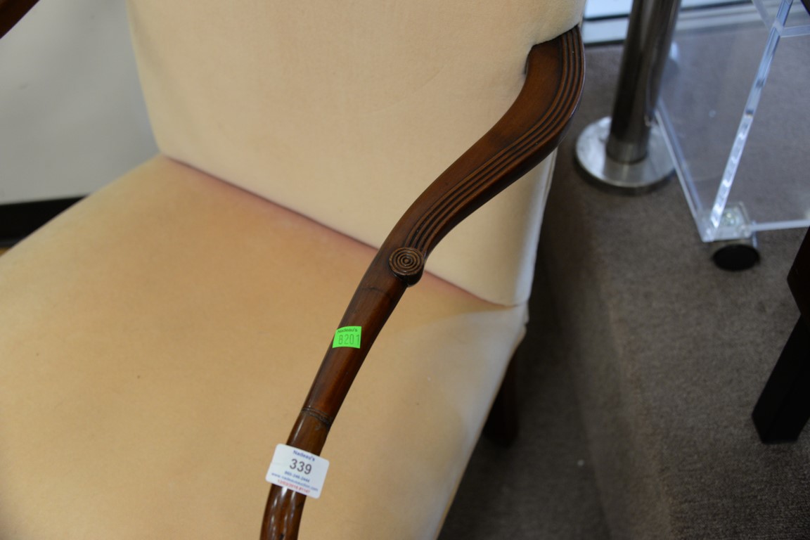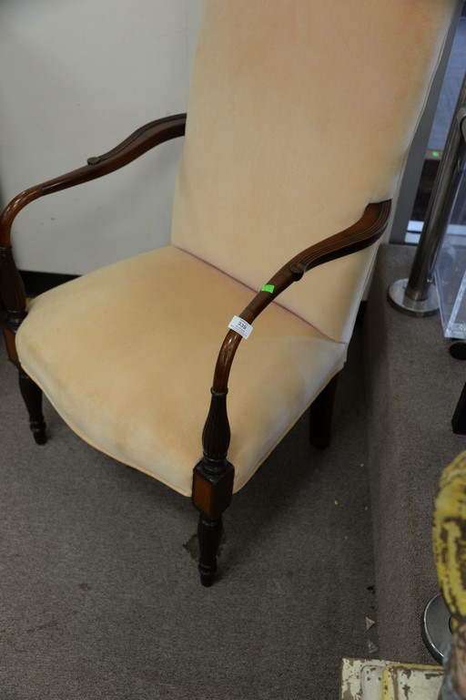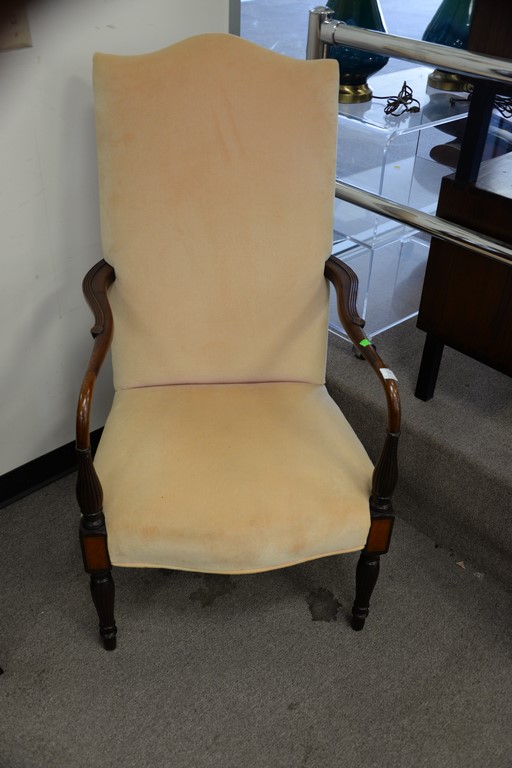 Lot 339: Custom Sheraton style lolling chair with carved arms over inlaid panel front over reeded and turned legs.