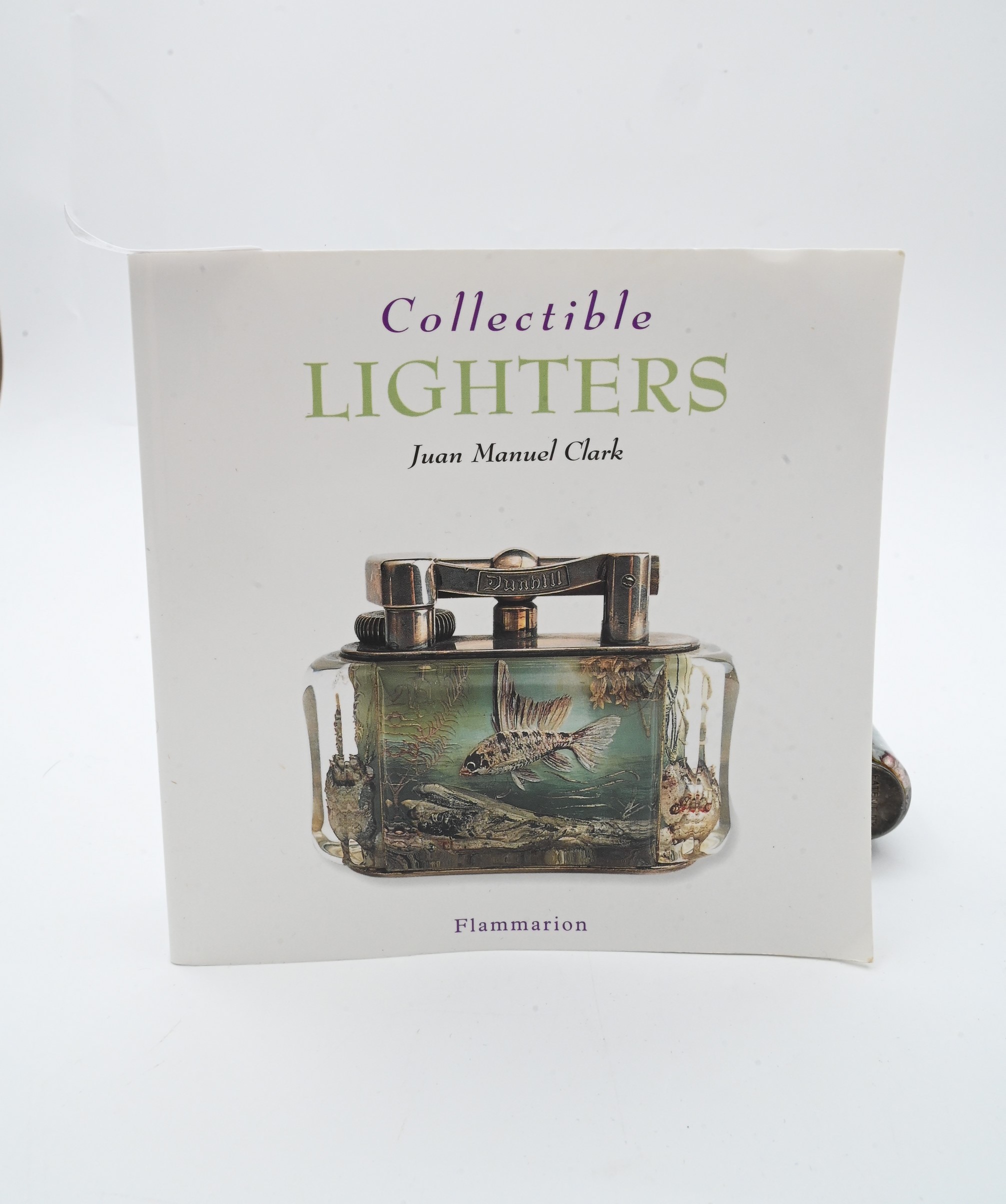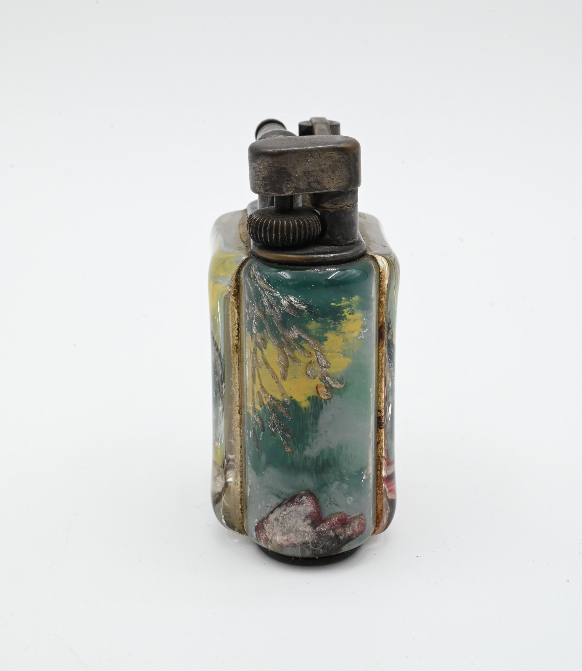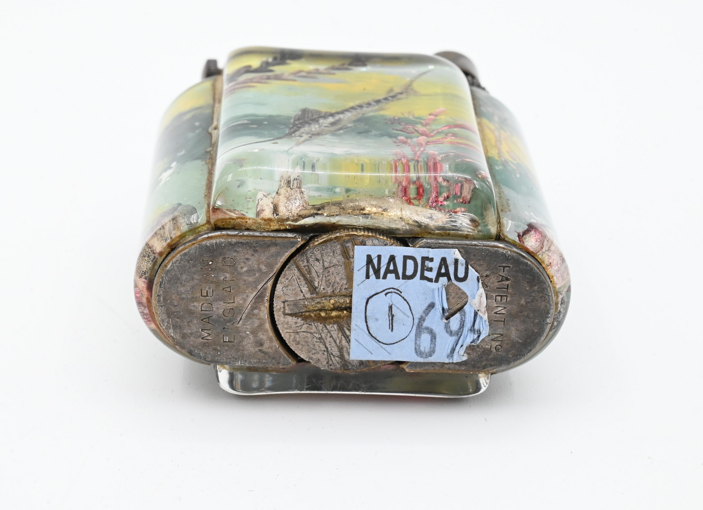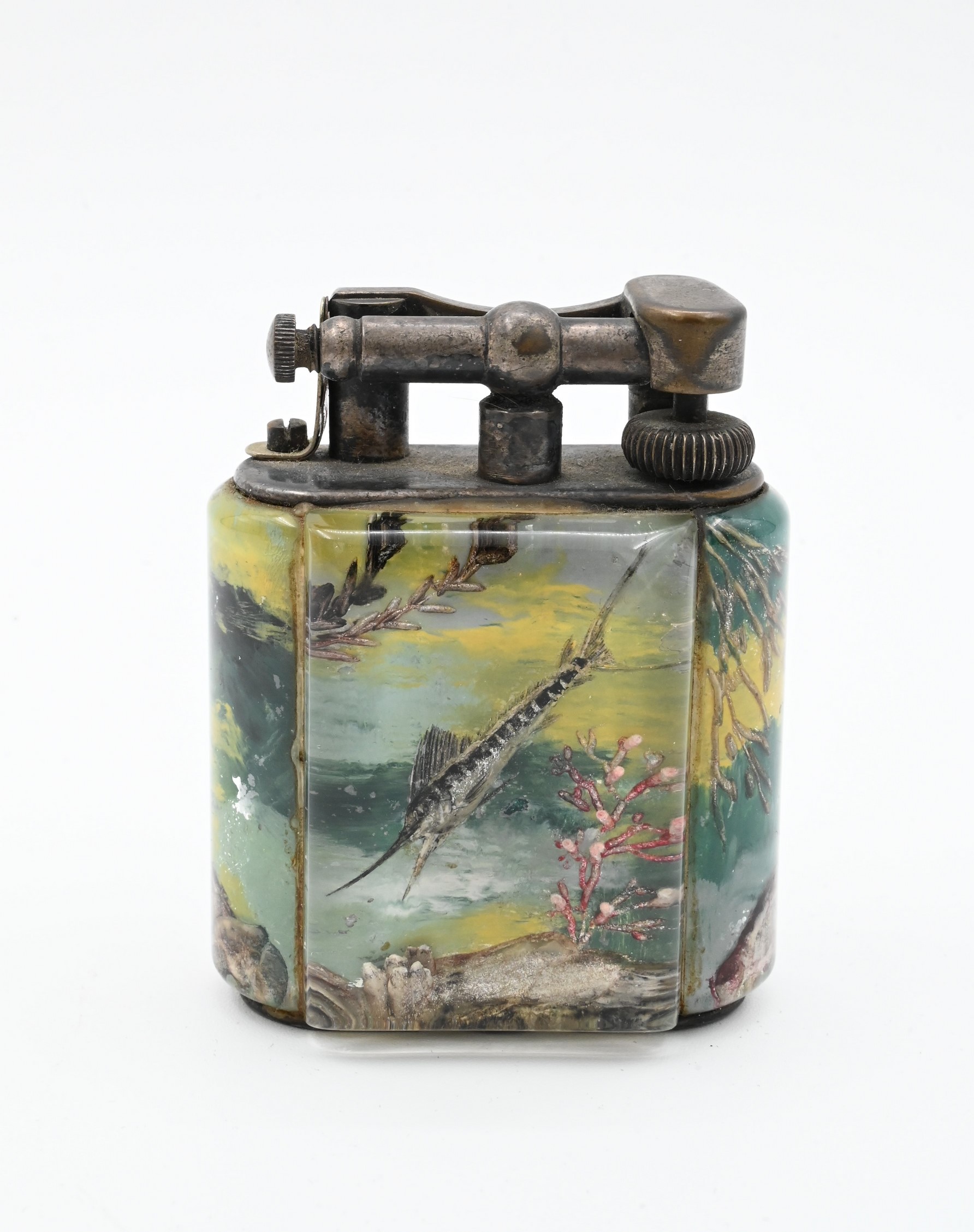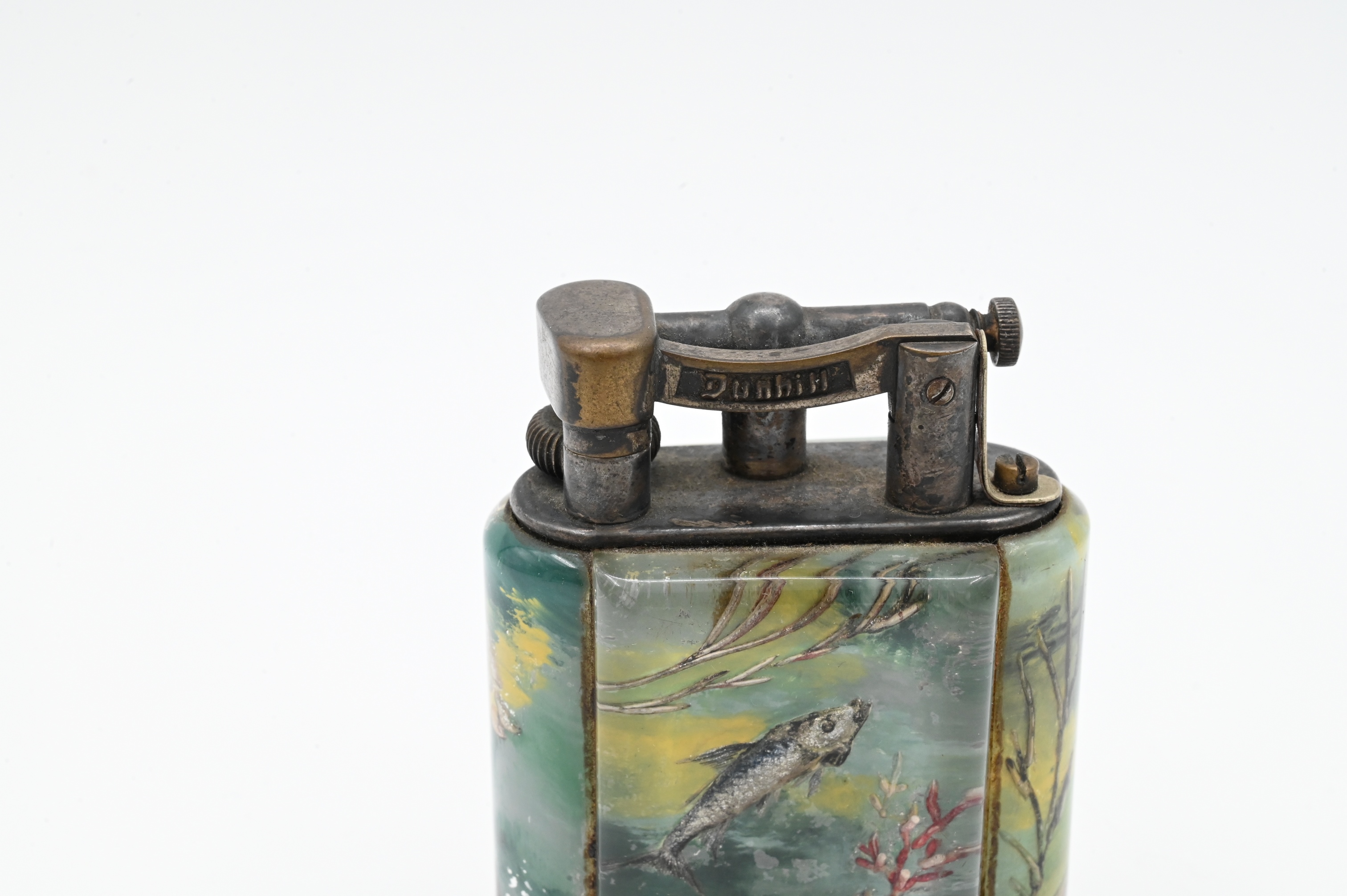 featuring a lift-arm cover marked Dunhill, having a lucite body with reverse-painted fish scenes of a marlin, marked on base made in England height 2 3/4 inches, width 2 1/4 inches.