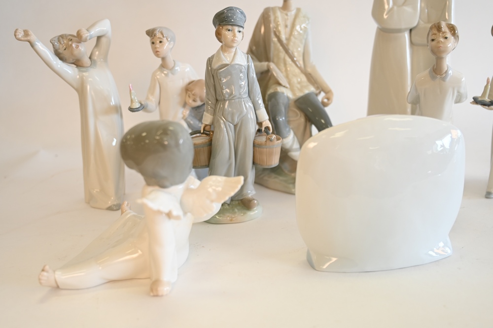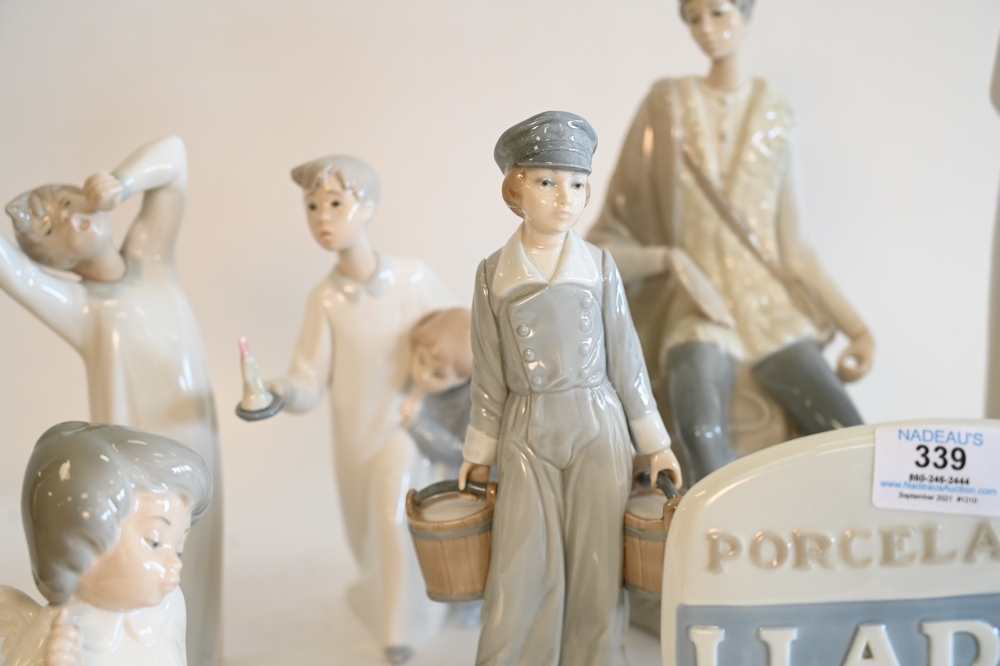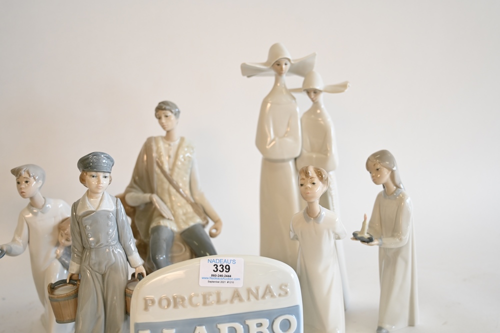 Lot 339: Eight Piece Lot of Porcelain Lladro Figures, to include several children in nightgowns, an angel, a shepherd (missing staph), a young boy carrying buckets of milk, along with two nuns, some accompanied by original box, height of tallest 13 inches.