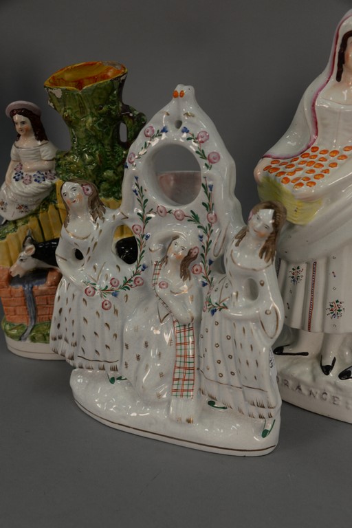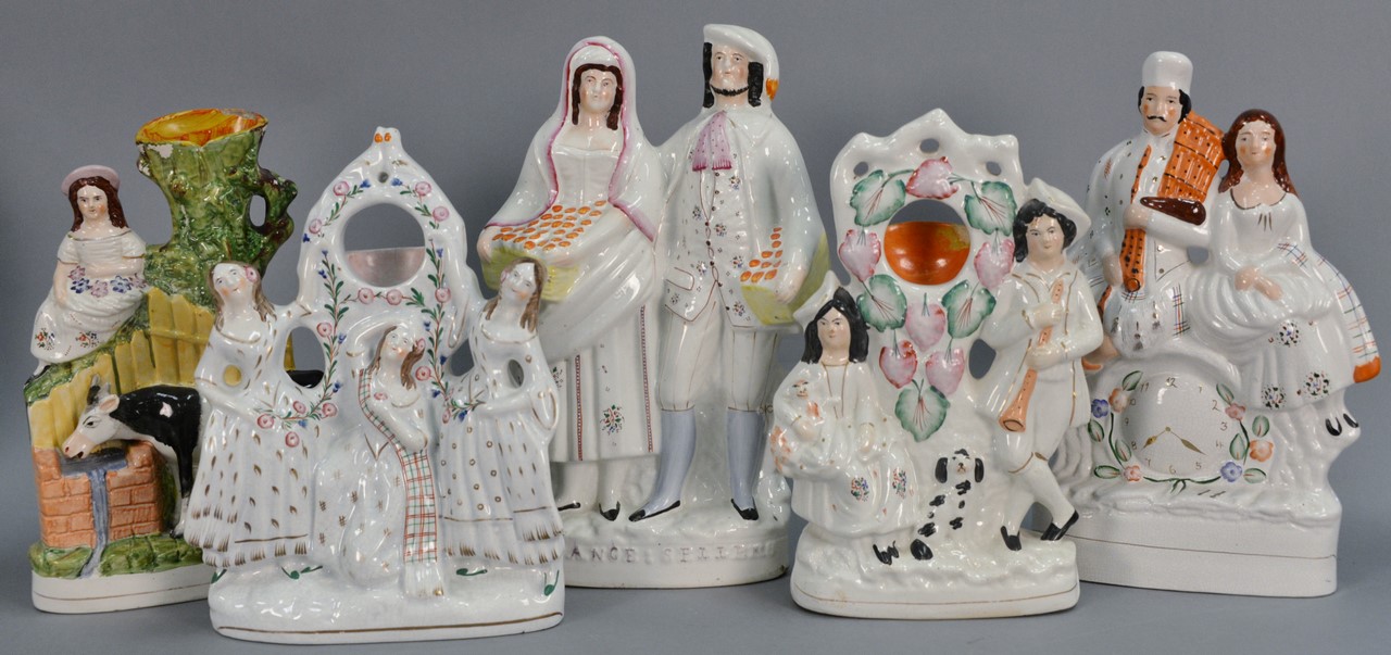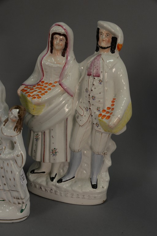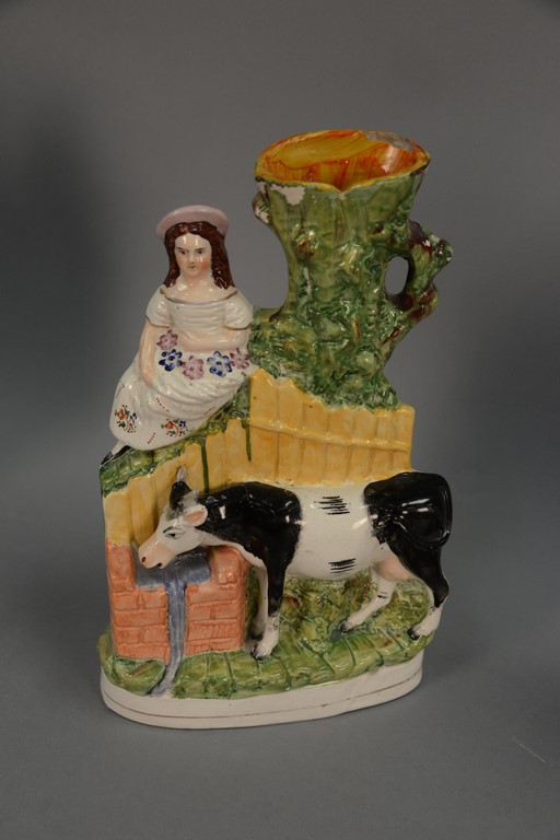 Five Staffordshire figural pieces two clock cases, one hand painted cow spill vase, a double figure sitting on a clock, and Orange Sellers. ht. 11 1/2in. to 13in.