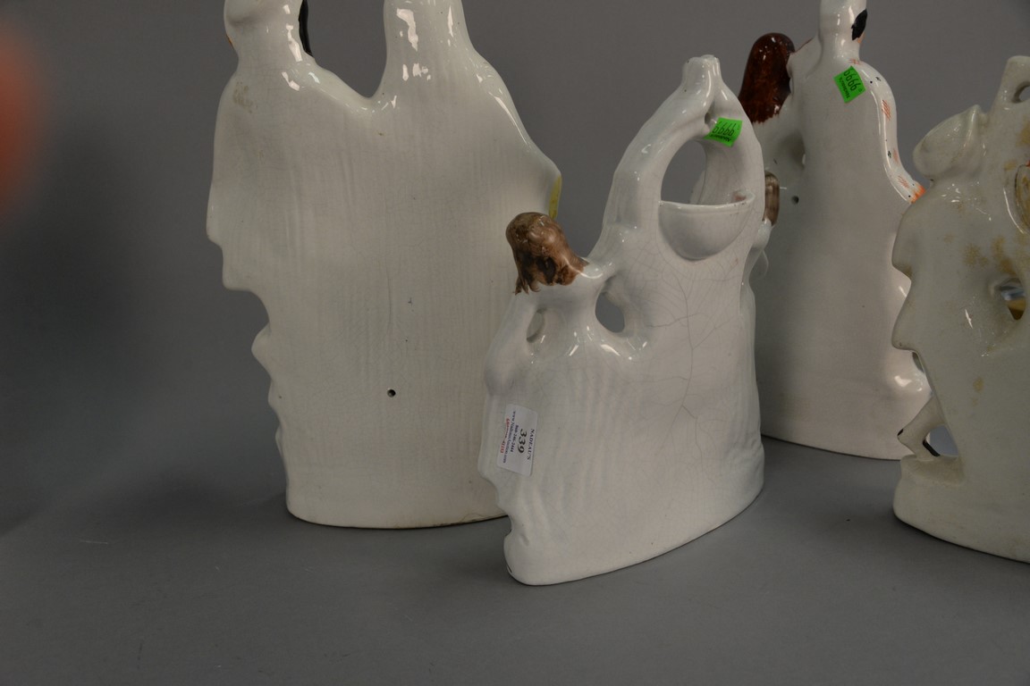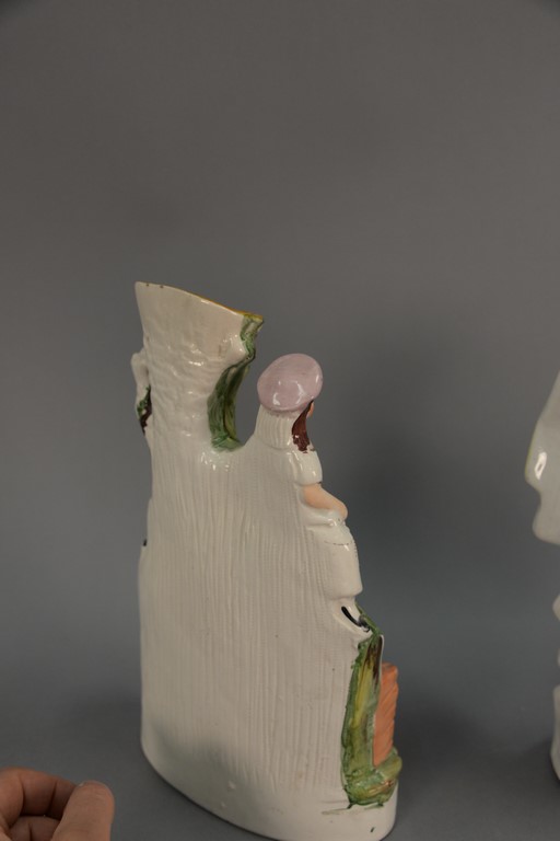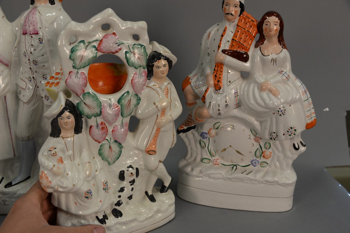 Lot 339: Five Staffordshire figural pieces two clock cases, one hand painted cow spill vase, a double figure sitting on a clock, and Orange …