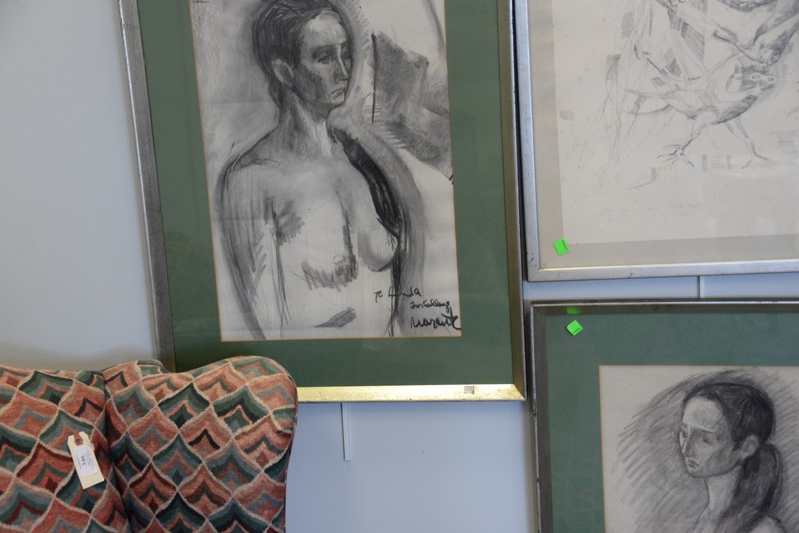 Group of five Irving Marantz 1912-1972including lithograph All Men Have Monsters signed in pencil lower right, a lithograph Two Girls, lithograph Where-What 6/30 and two pencil drawings signed Marantz nude portrait. 10 x 18 to 14 x 20