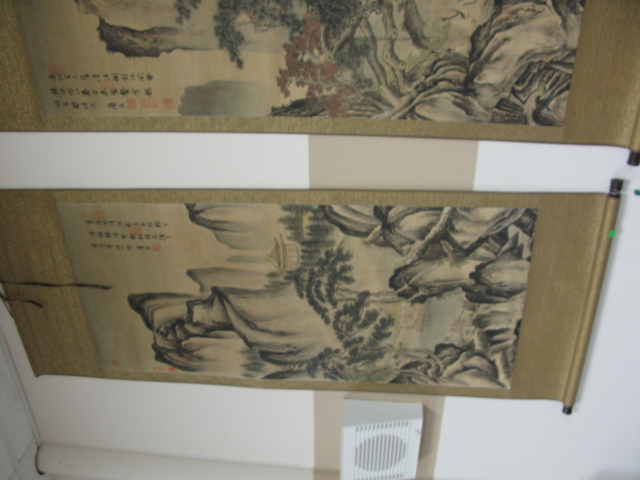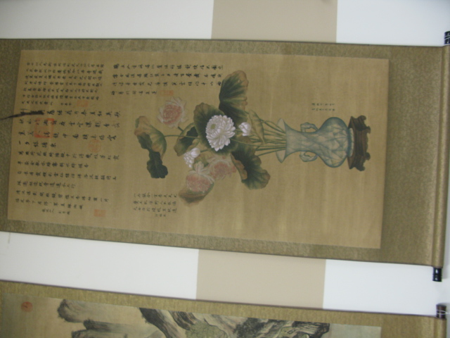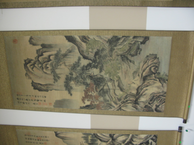 Group of three Oriental Scrolls two landscape and one still life of flowers in vase.