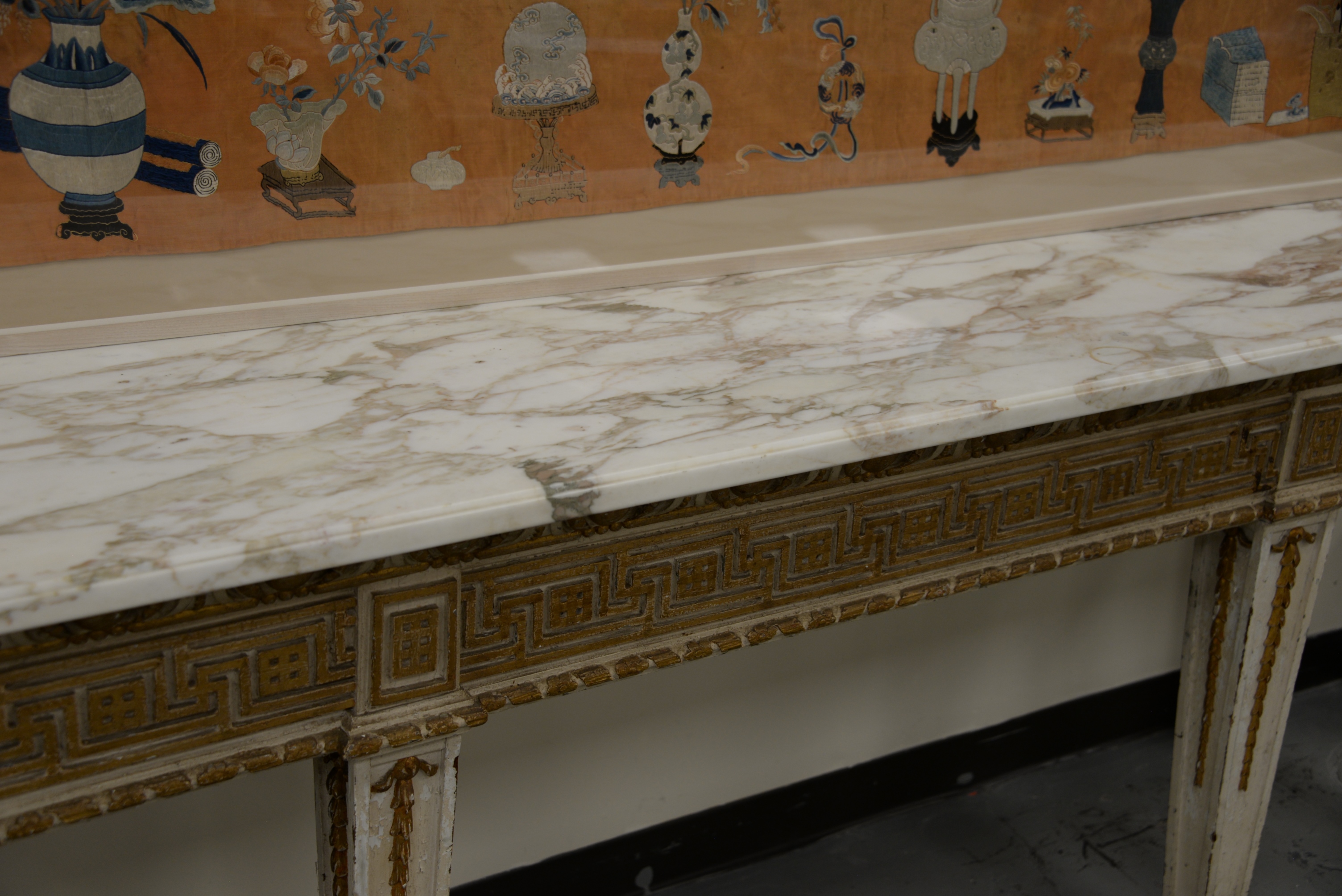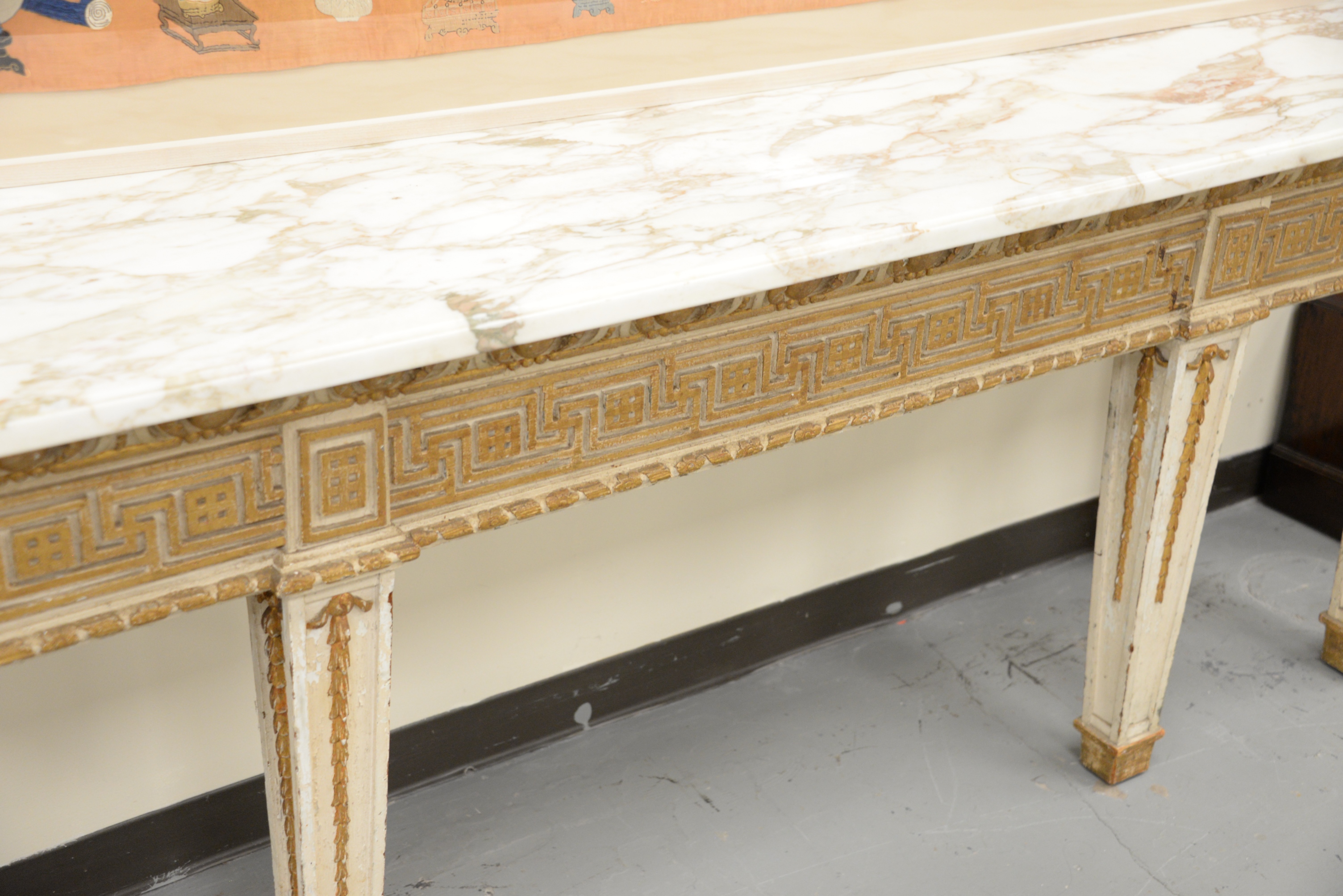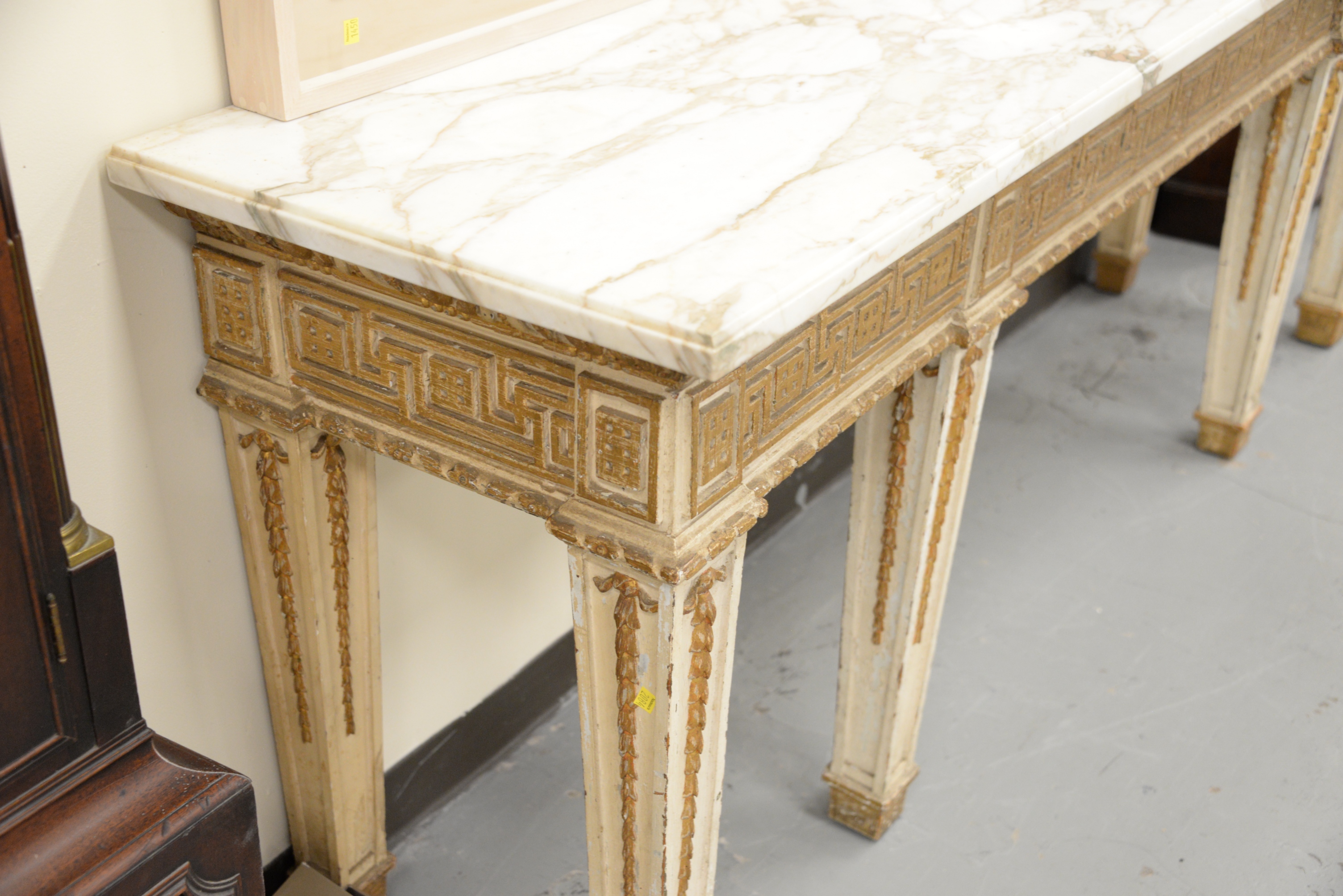 Louis XIV Style Hall Table/Server, having marble top above carved body of gilt Greek molding, on six large tapered and molded square legs, height 35 inches, length 90 inches, depth 22 inches.