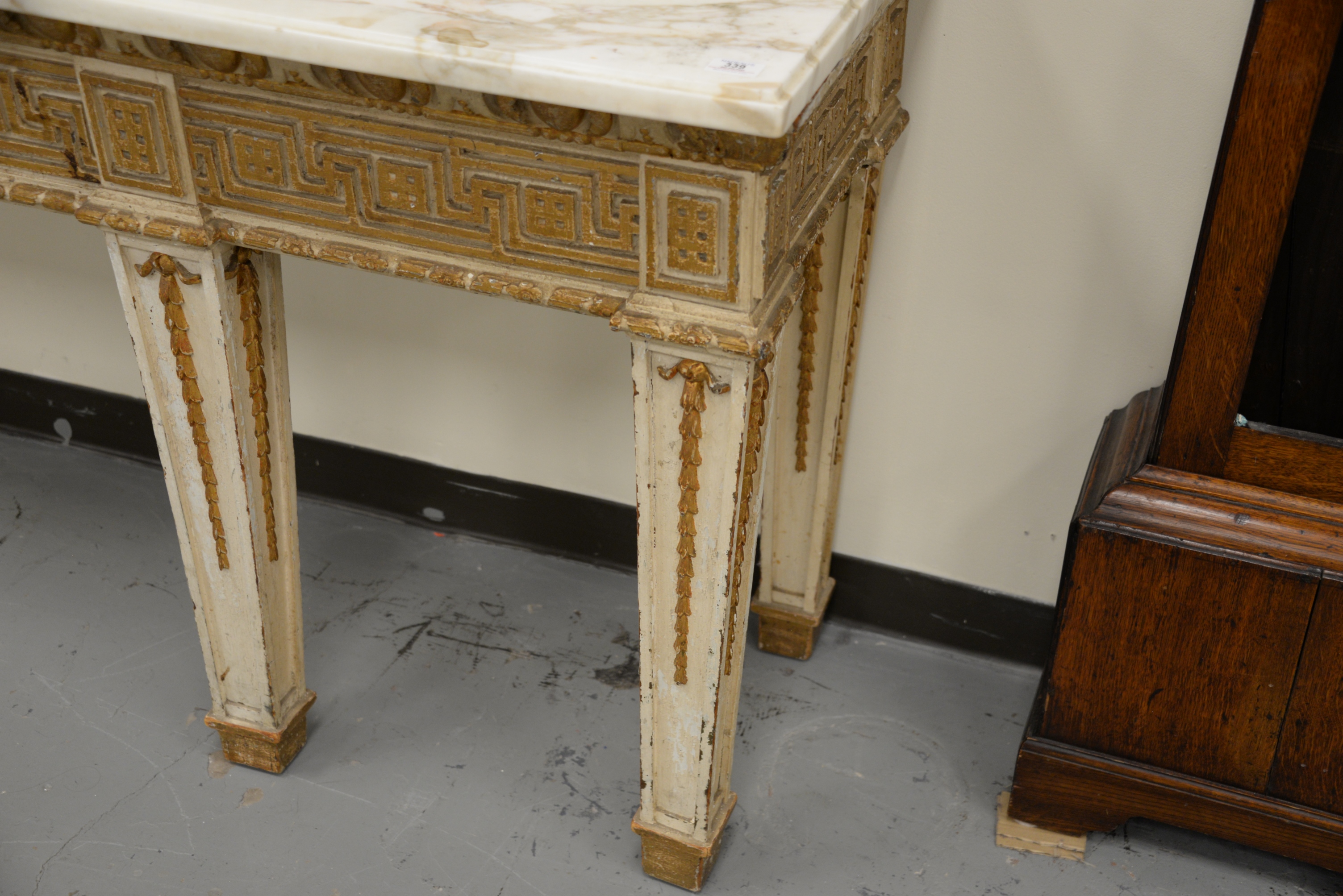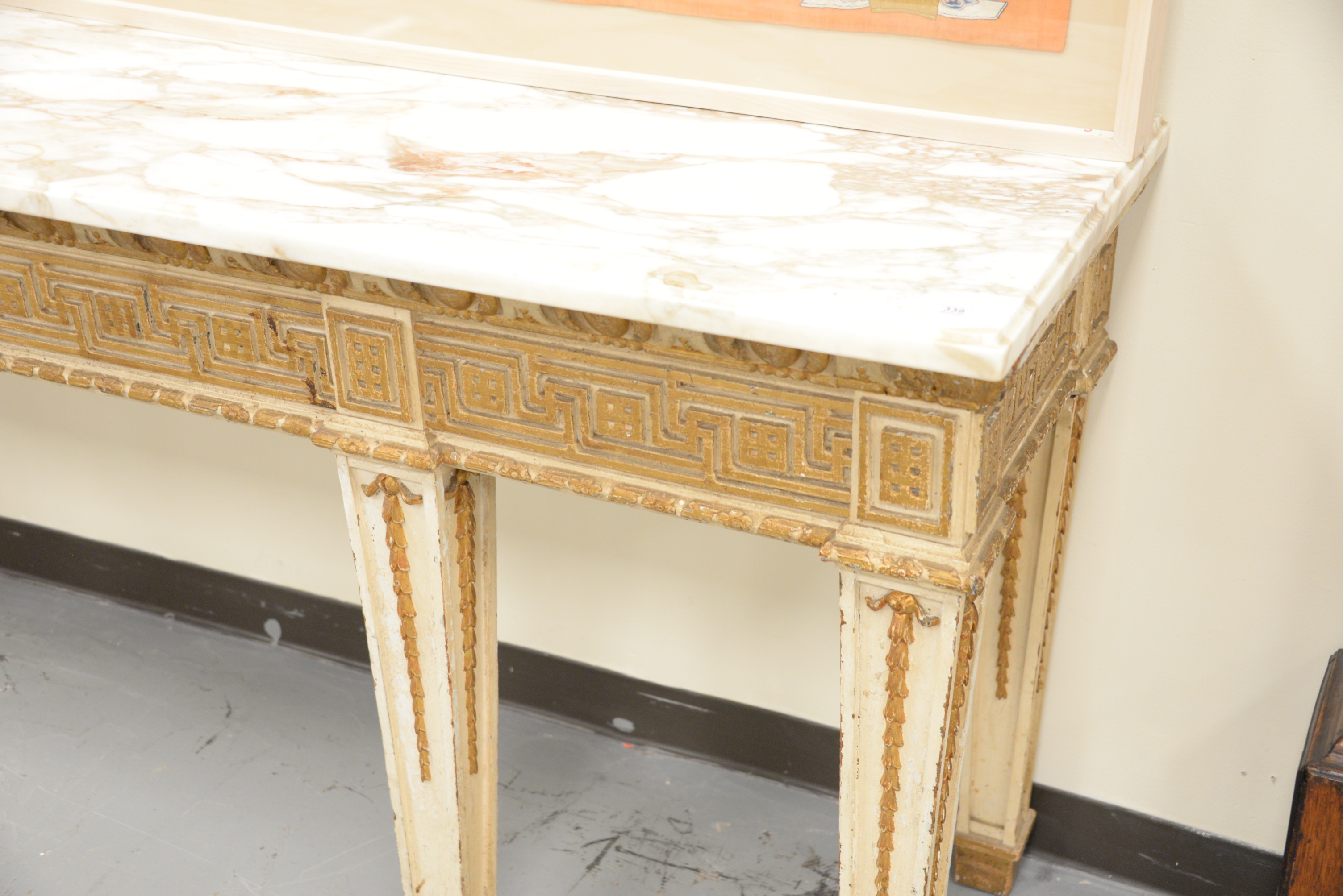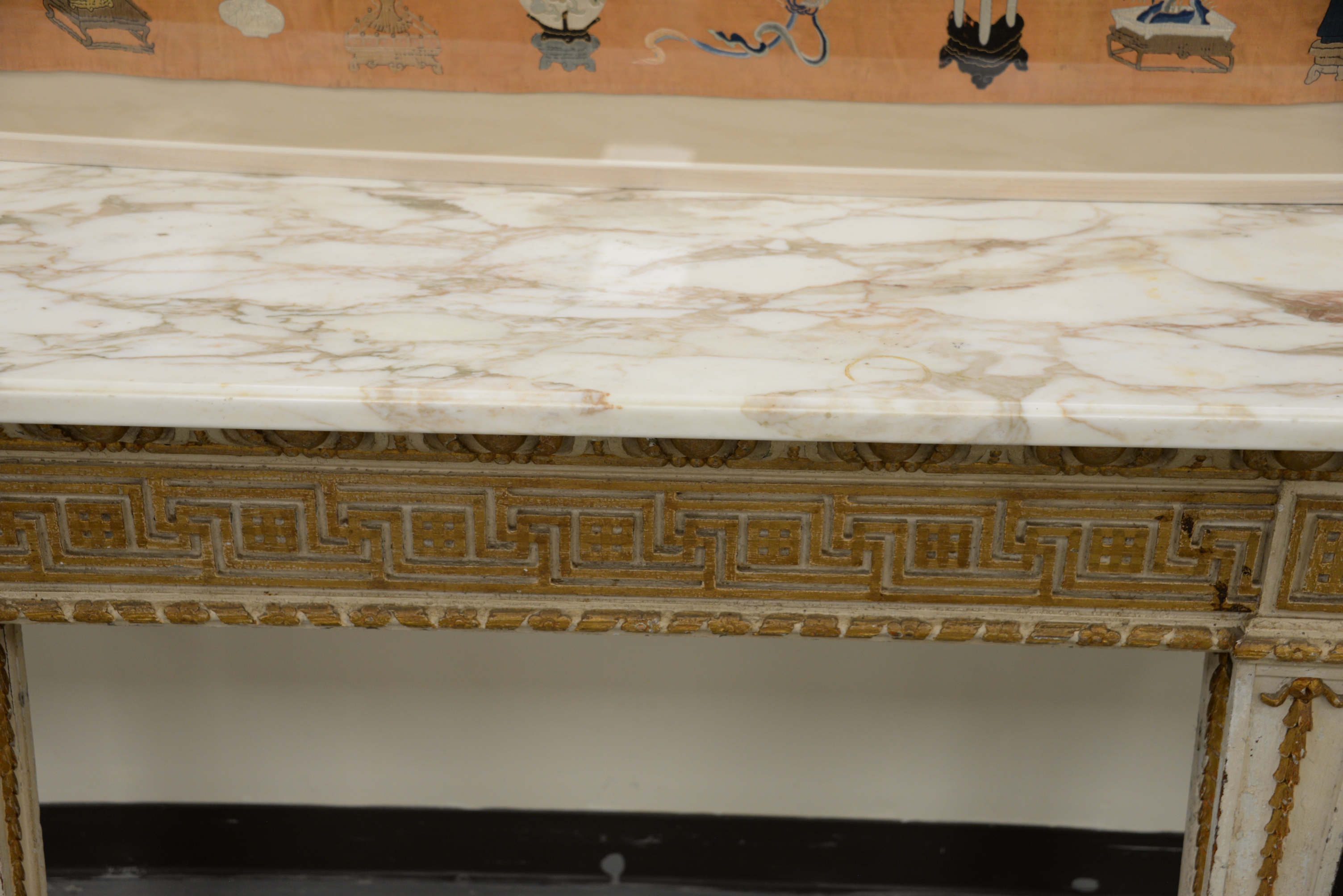 Louis XIV Style Hall Table/Server, having marble top above carved body of gilt Greek molding, on six large tapered and molded square legs, height 35 inches, length 90 inches, depth 22 inches.