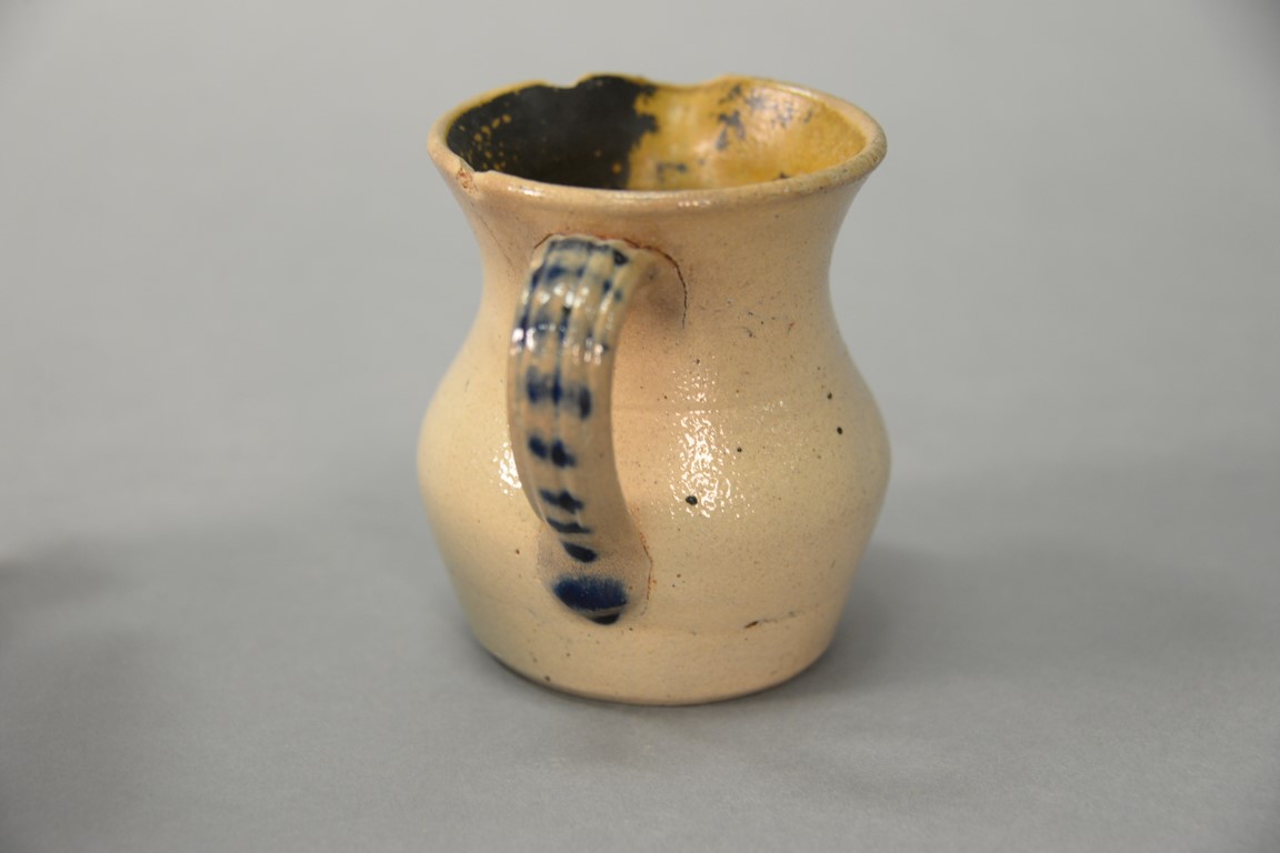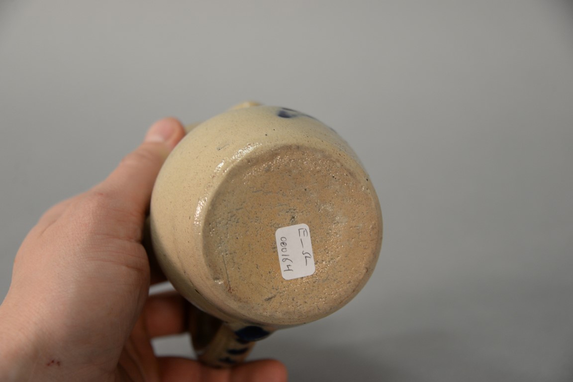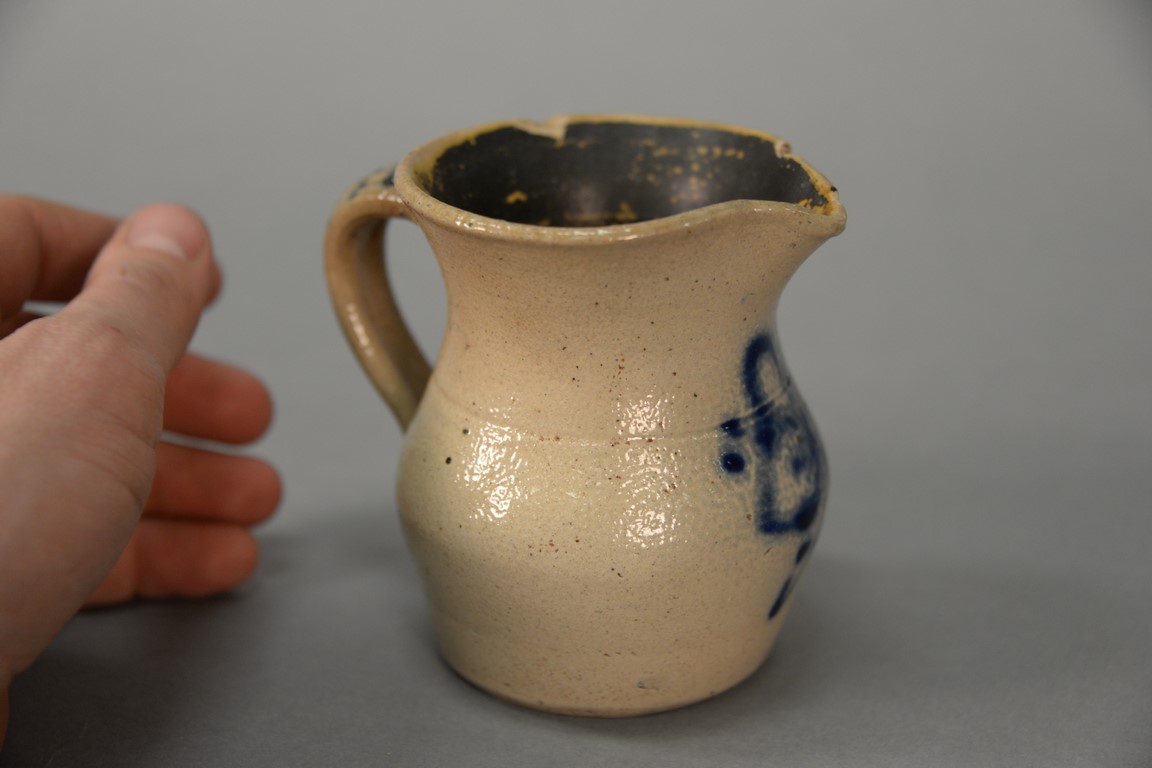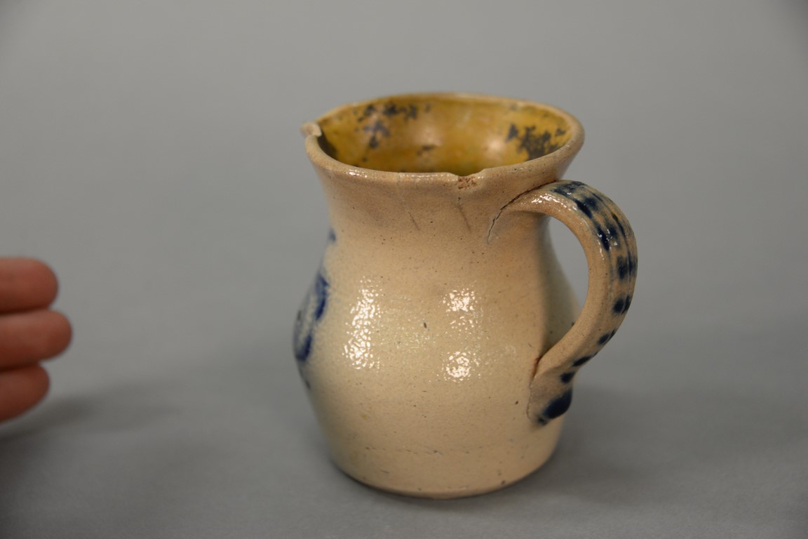 Miniature stoneware pitcher having blue floral decoration and blue spots on handle. rim chips and short hairline cracks height 4 inches Provenance: Estate of Dr. Steve Leder