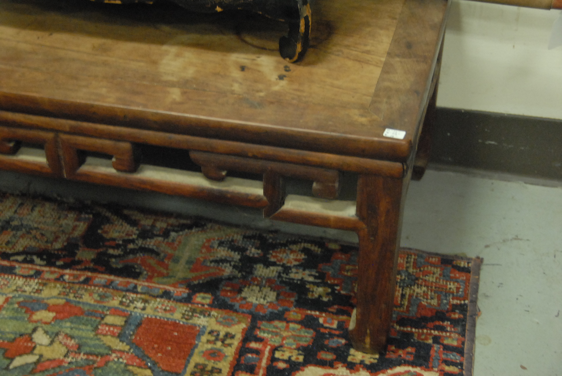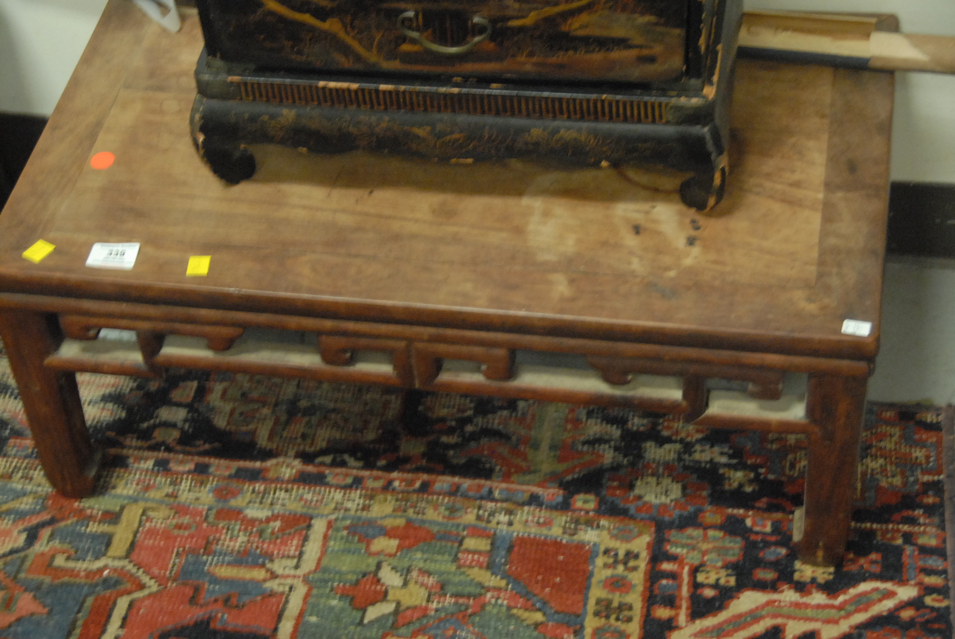 Oriental hardwood low table with key design carved skirts. ht. 12 in. wd. 28 in. dp. 16 in. Provenance: Property from The Estate of Margaret Oliphant of Old Lyme, Connecticut