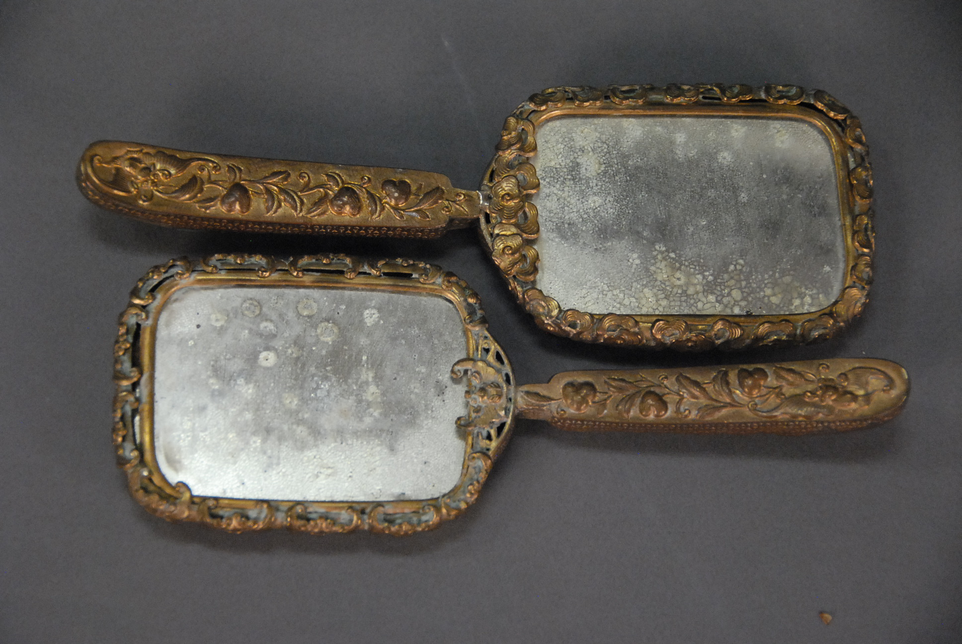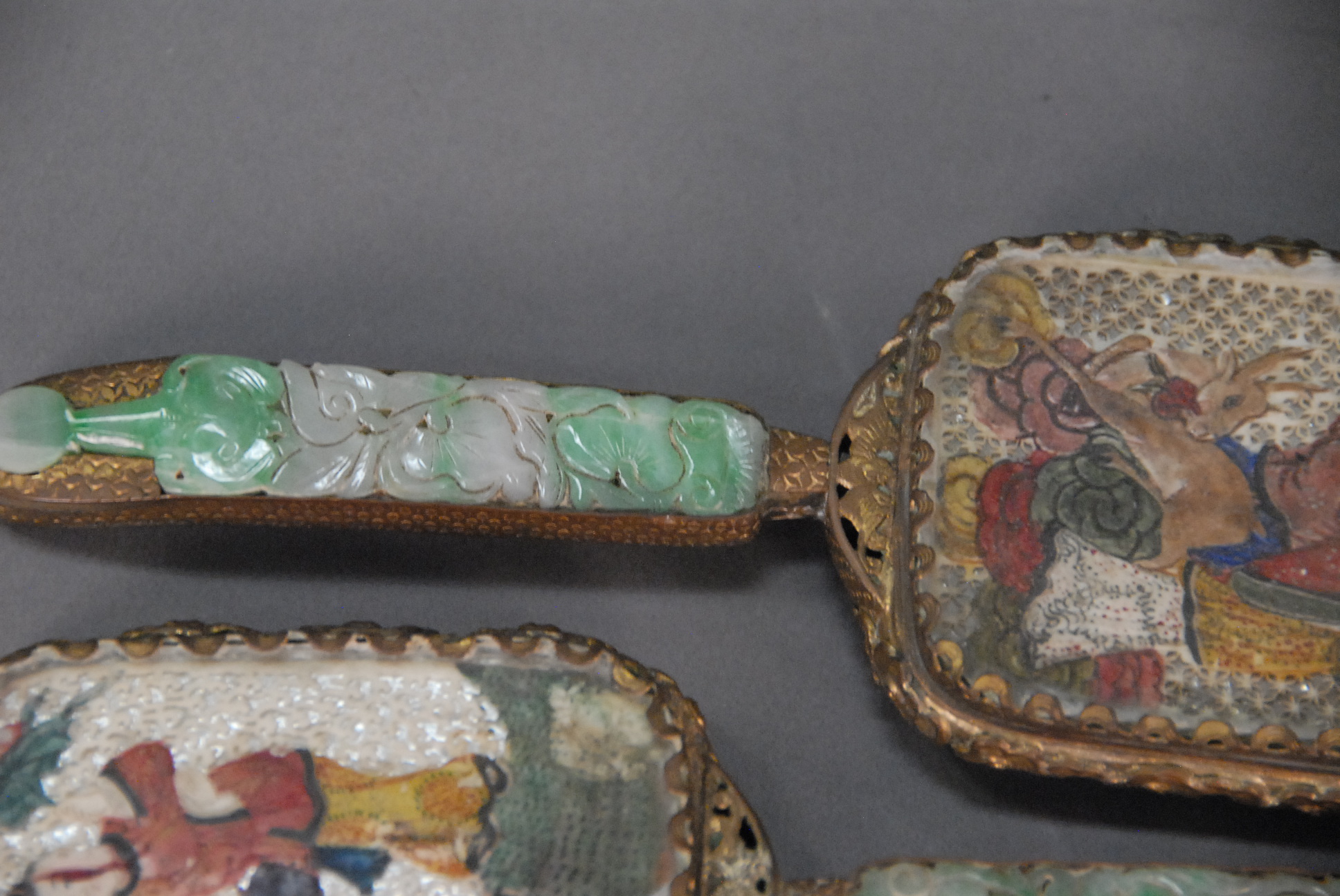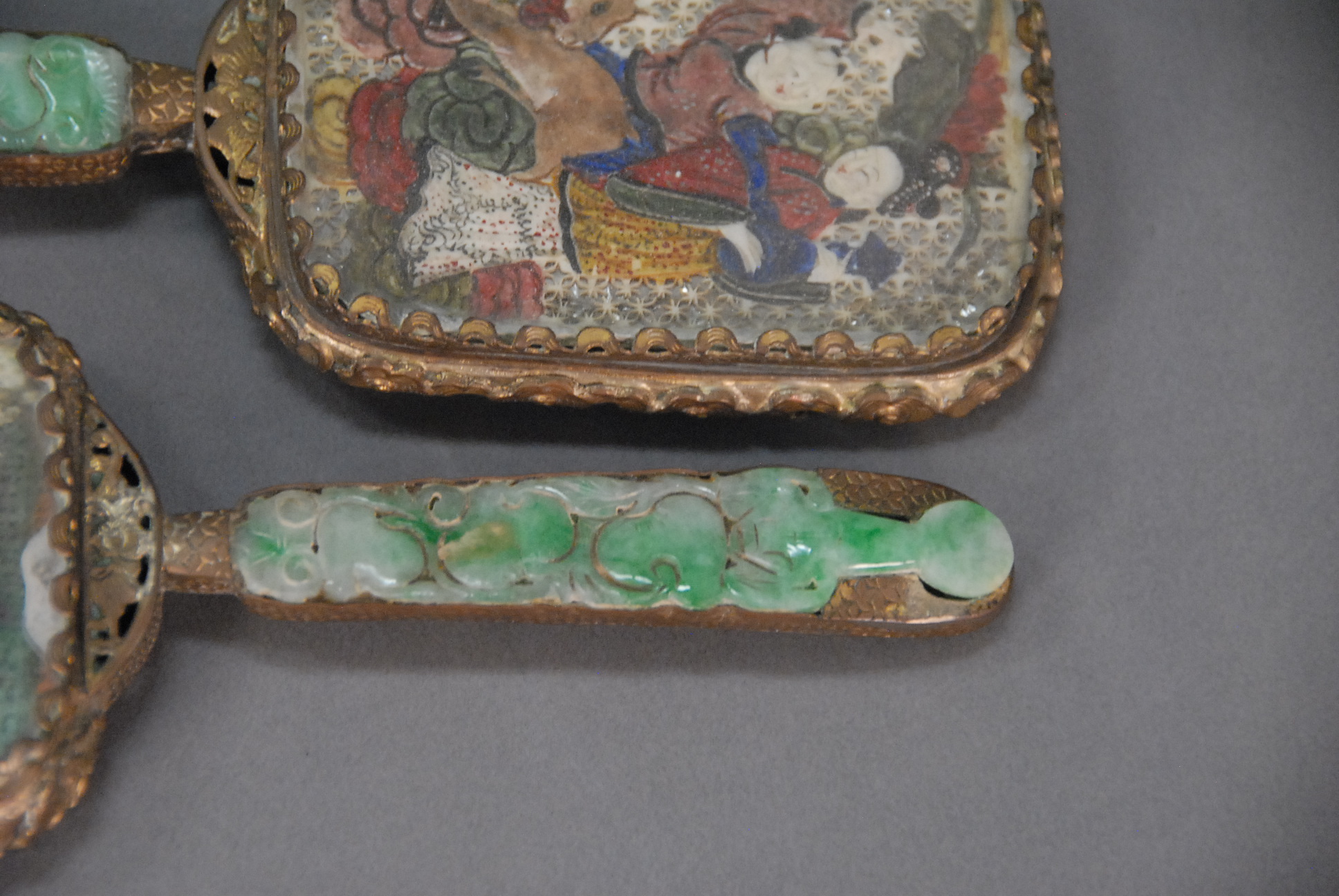 Lot 339: Pair of Chinese hand mirrors, each with painting on reticulated base, handles inlaid with carved jade, probably late 19th century. ht. 7in.