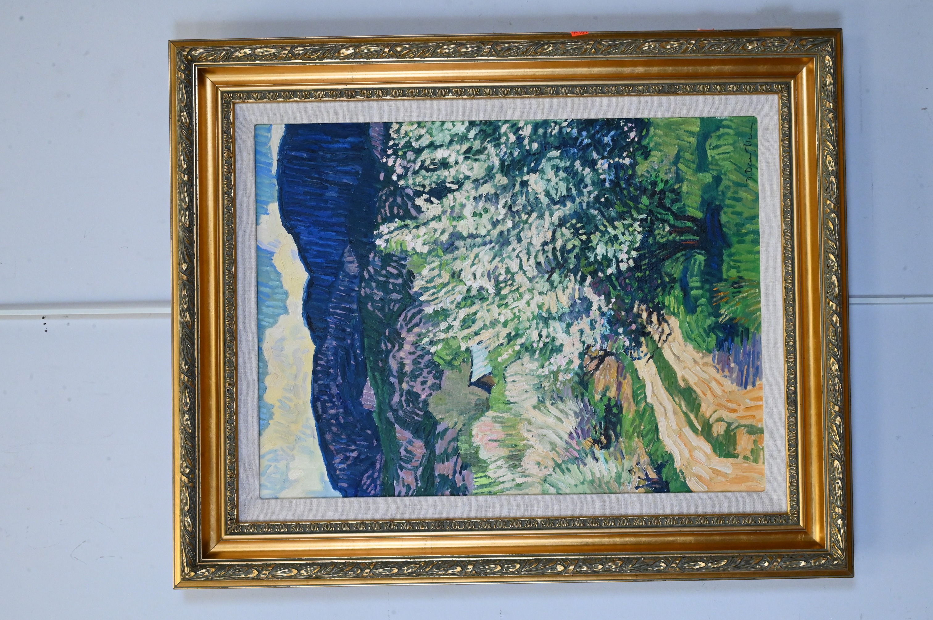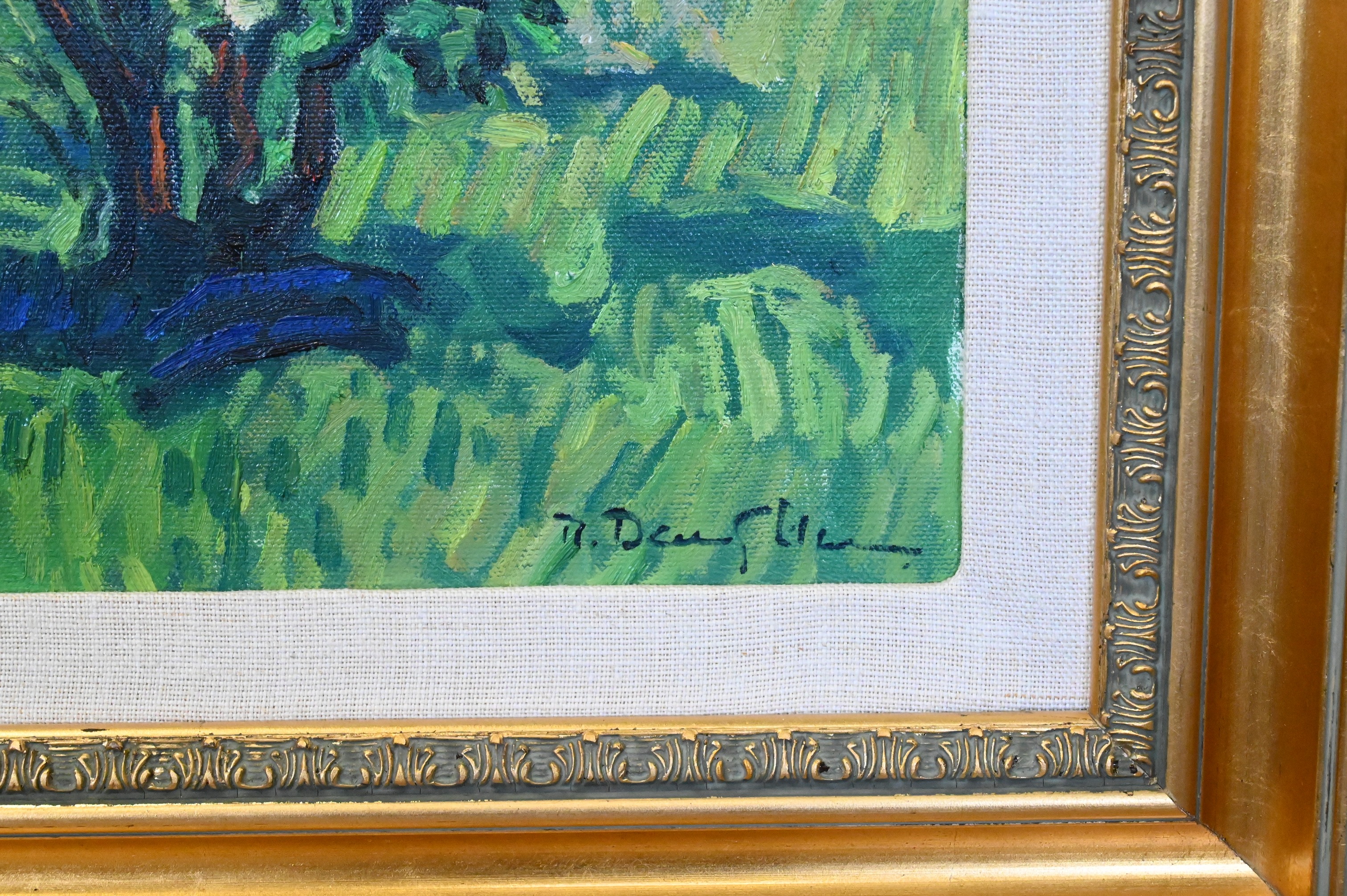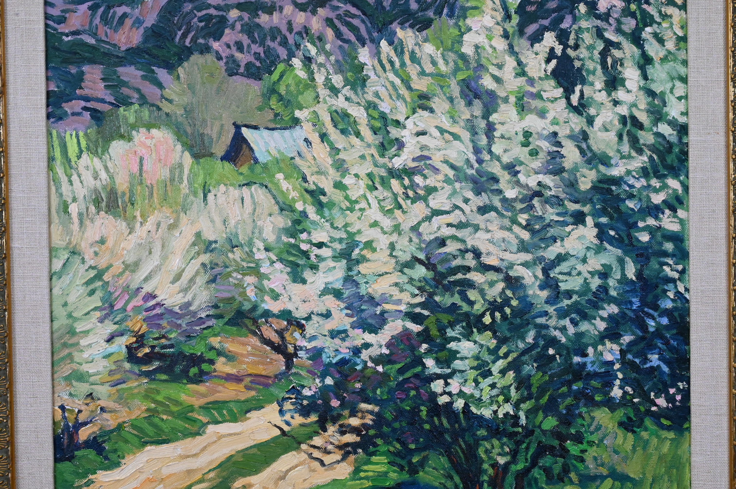 depicting a vivid Southwestern landscape with flowering trees in bloom along a dirt path leading toward distant blue mountains beneath a bright, cloud-streaked sky; painted in Daughters’ signature modern impressionist style, with bold directional brushwork, rhythmic color patterns, and an expressive palette capturing the light and atmosphere of New Mexico