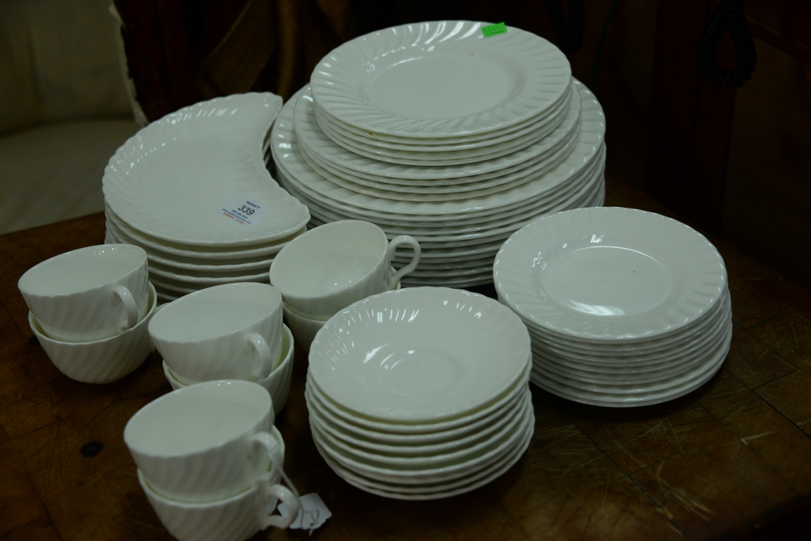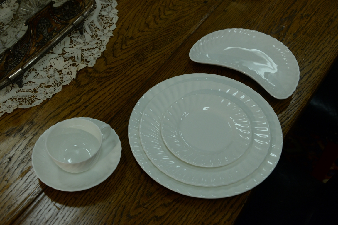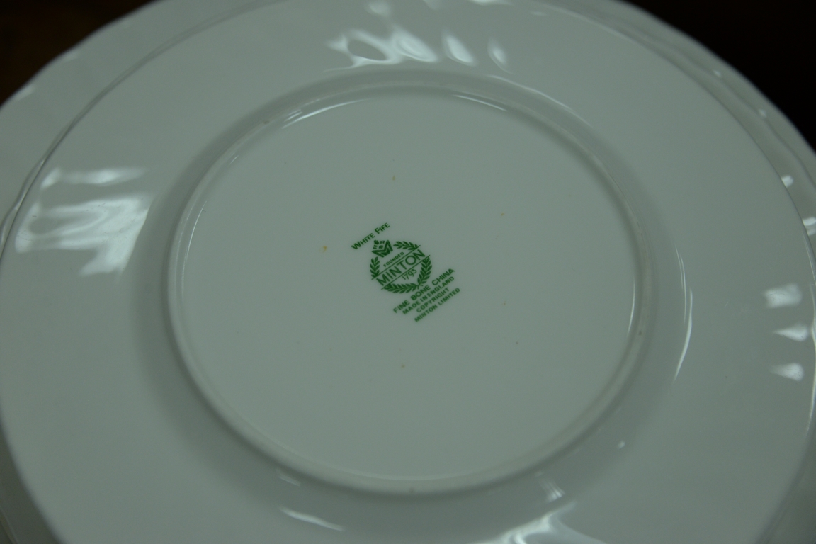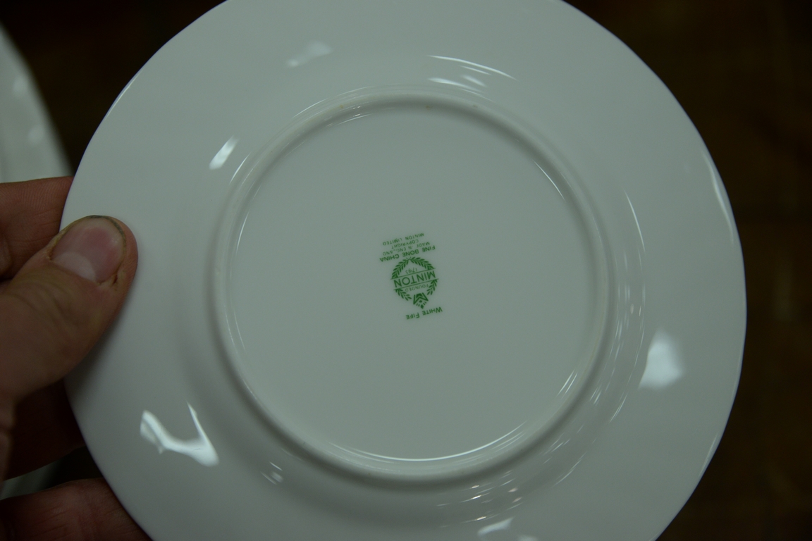Lot 339: Set of Minton white Fife dinnerware including 20 dinner plates and 3 platters, setting for 13 plus extra,108 total pieces.