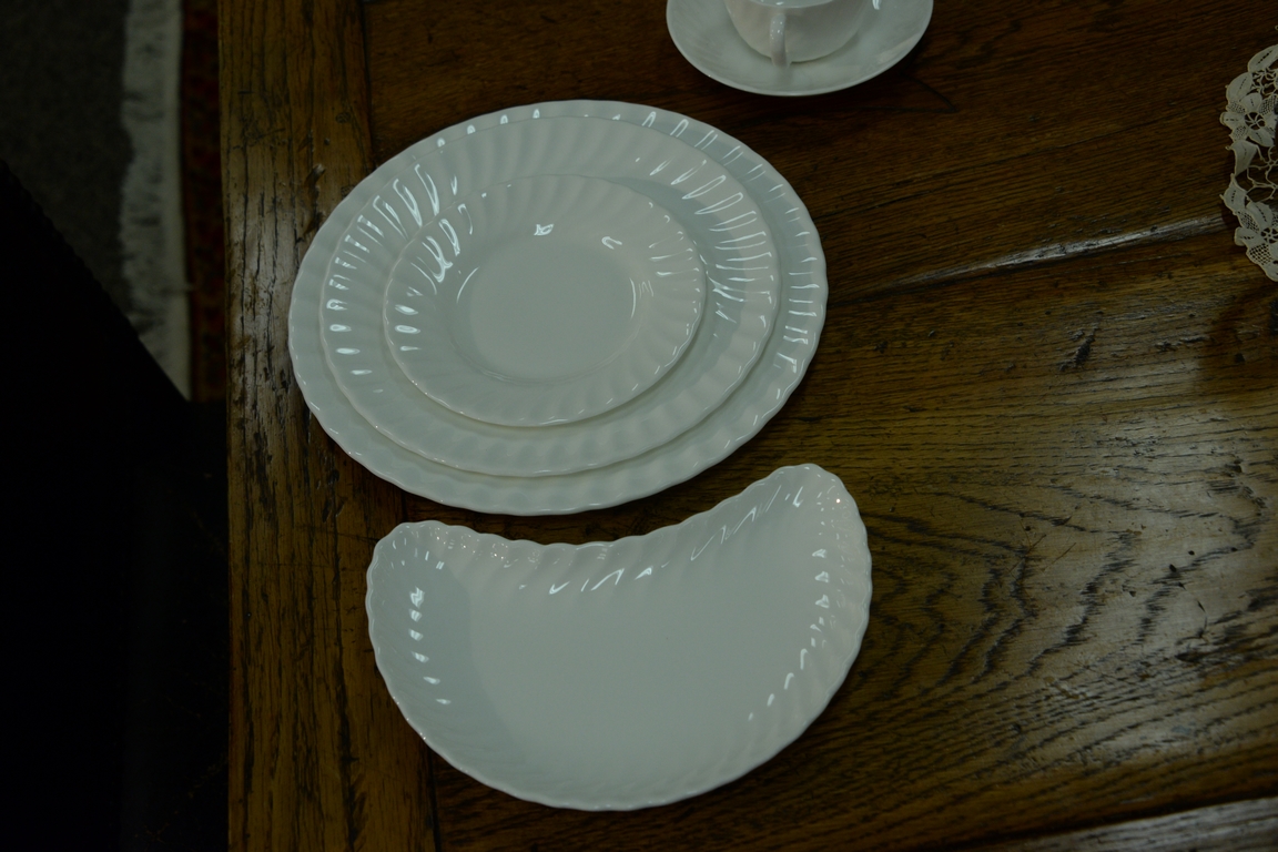 Set of Minton white Fife dinnerware including 20 dinner plates and 3 platters, setting for 13 plus extra,108 total pieces.