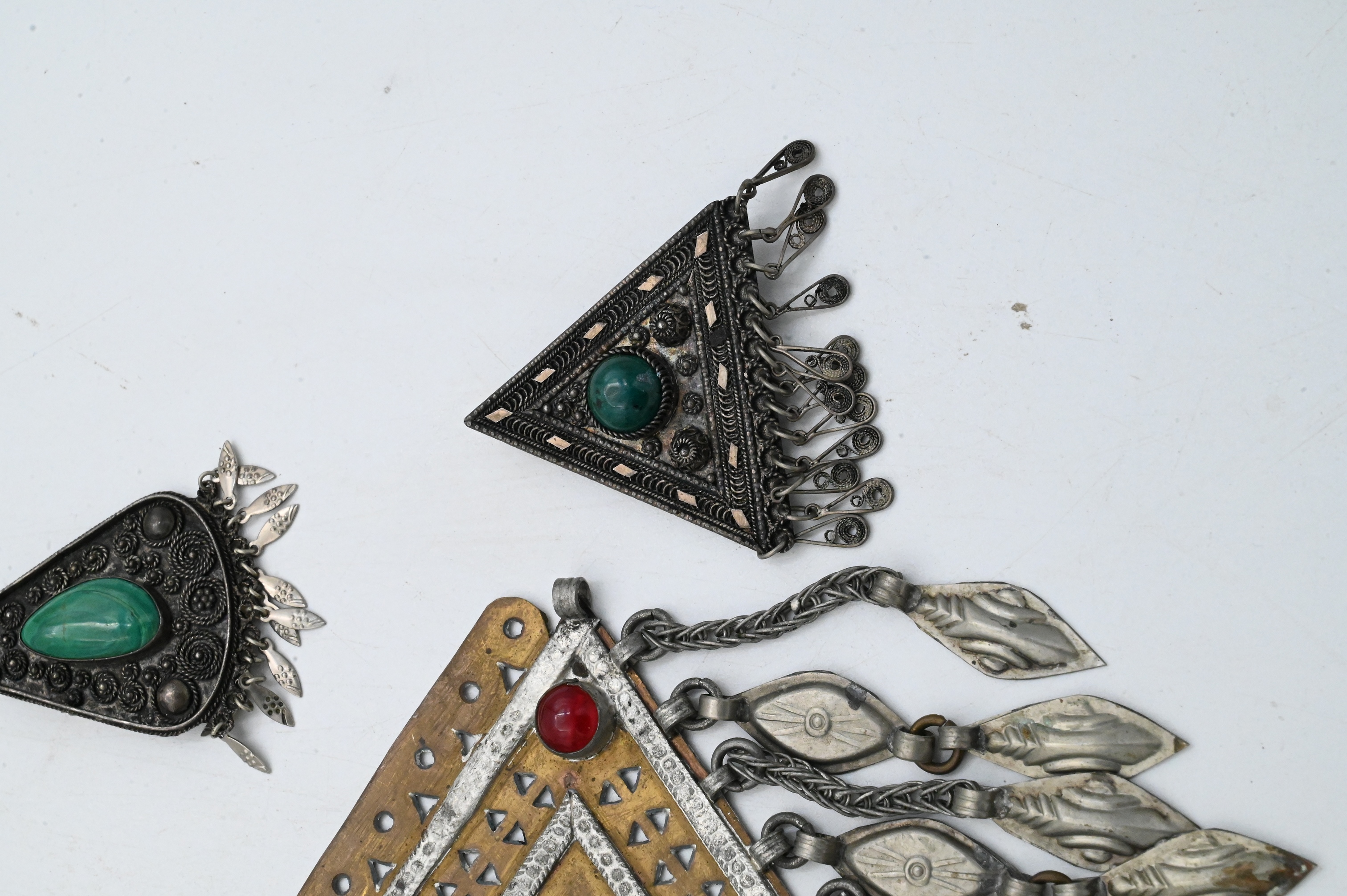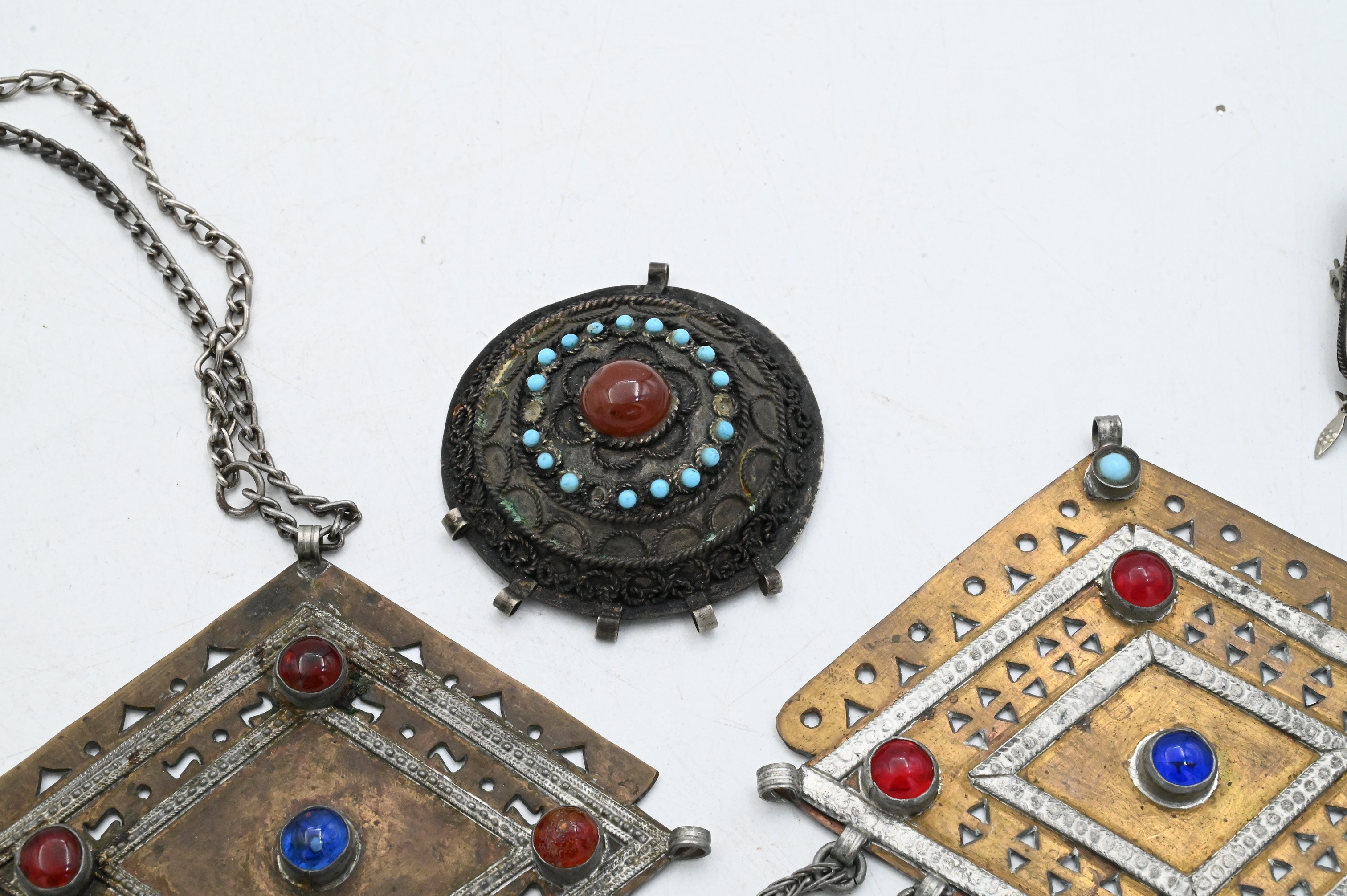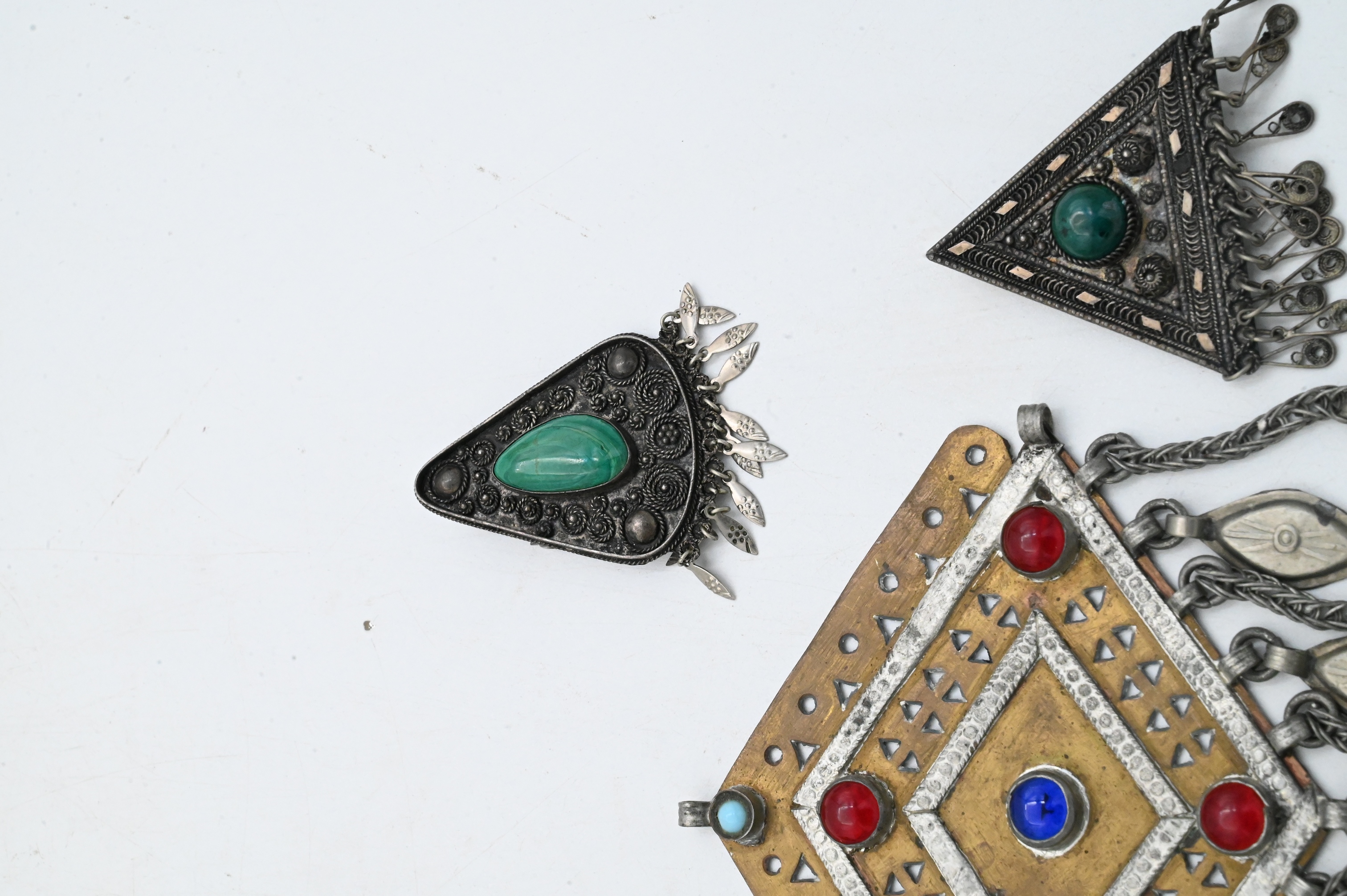to include two brooches having malachite center stone, two larger Turkish mounted with stones one of which was made into a necklace, a turquoise mounted in a teardrop shape and made into a necklace, along with a round piece having turquoise and a red center sone