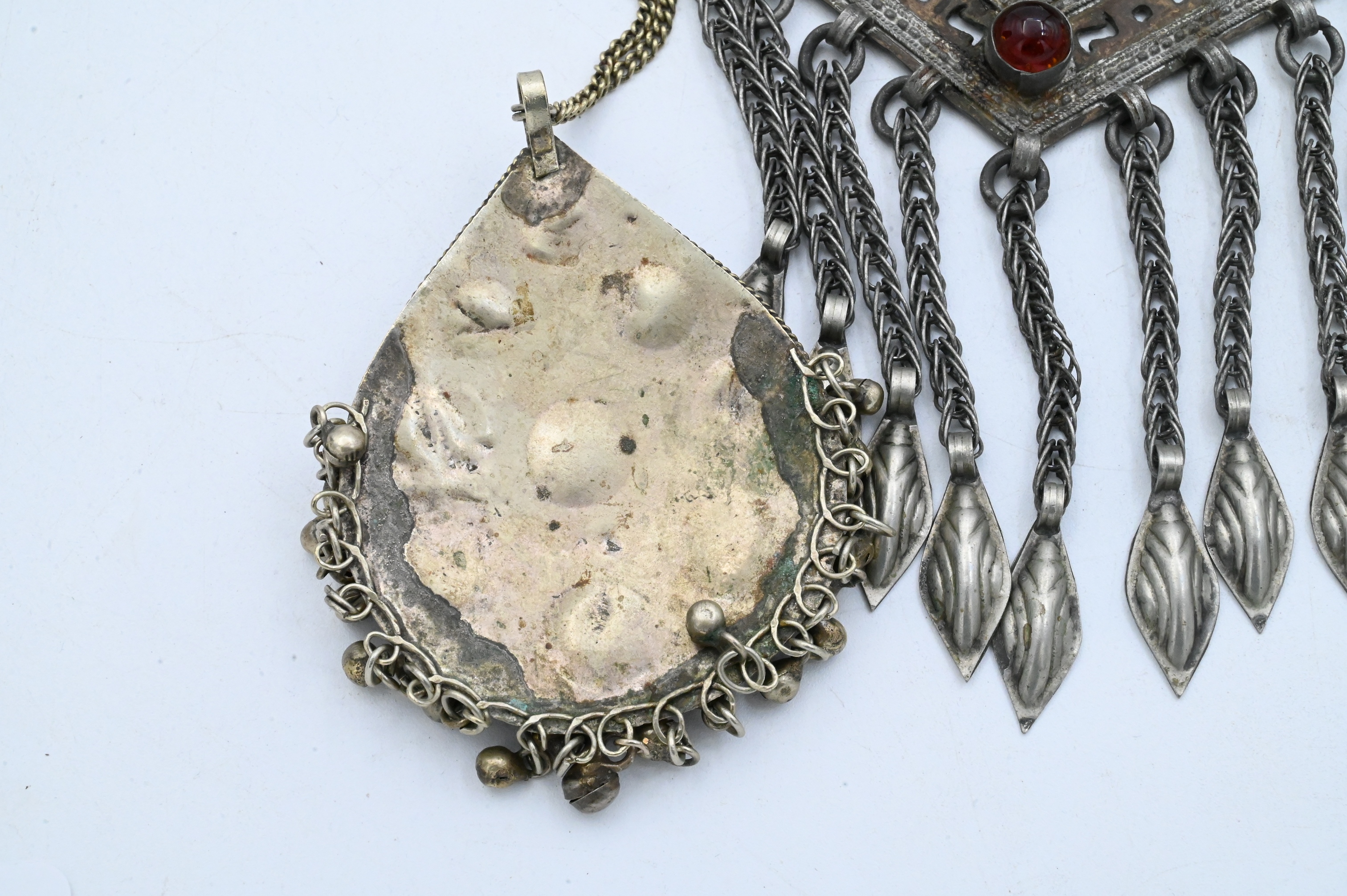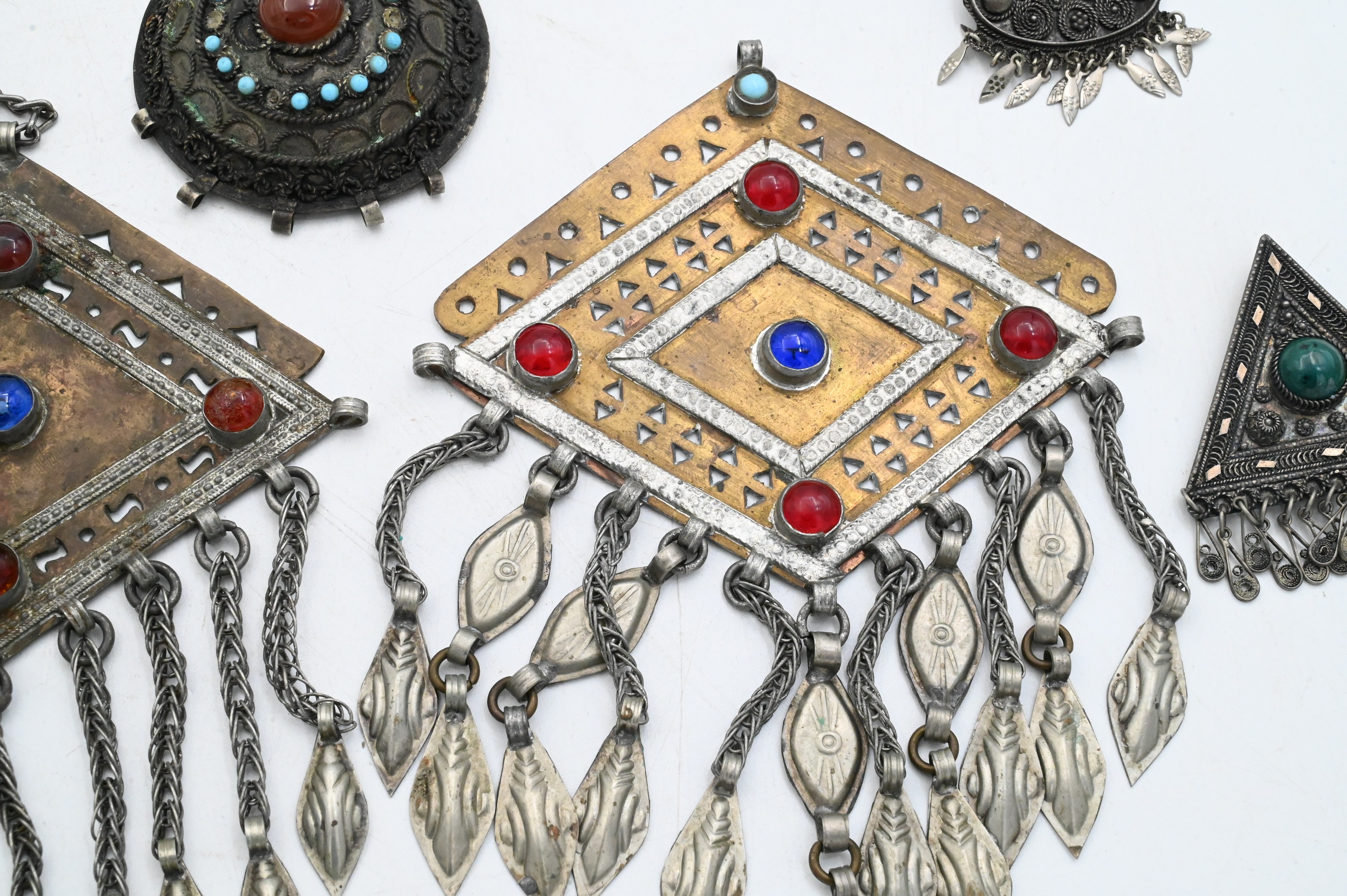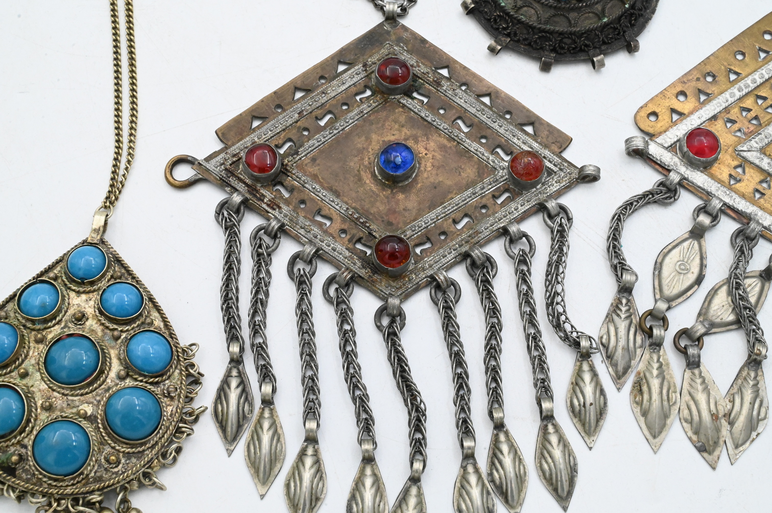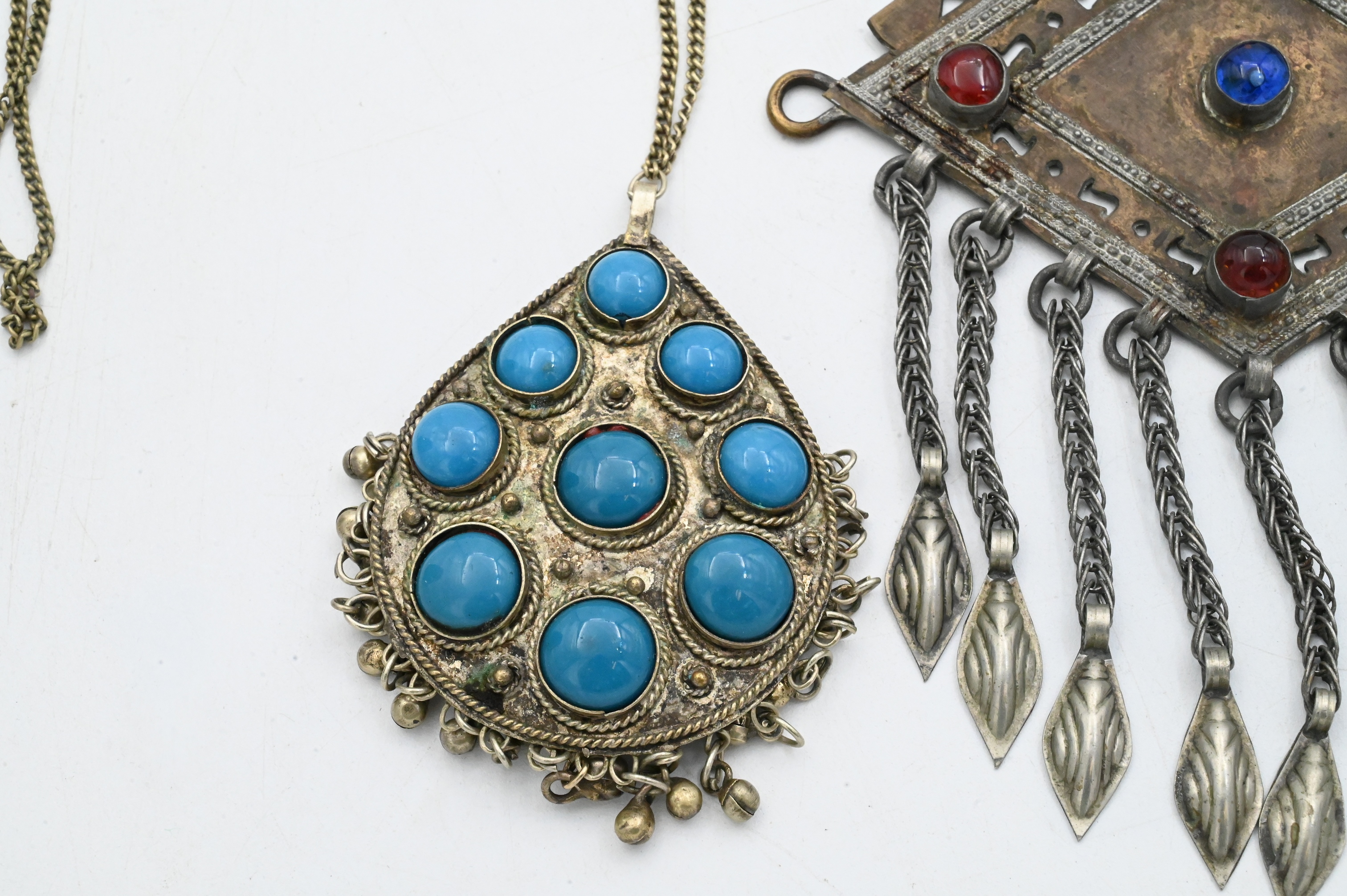 to include two brooches having malachite center stone, two larger Turkish mounted with stones one of which was made into a necklace, a turquoise mounted in a teardrop shape and made into a necklace, along with a round piece having turquoise and a red center sone