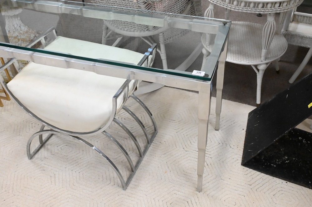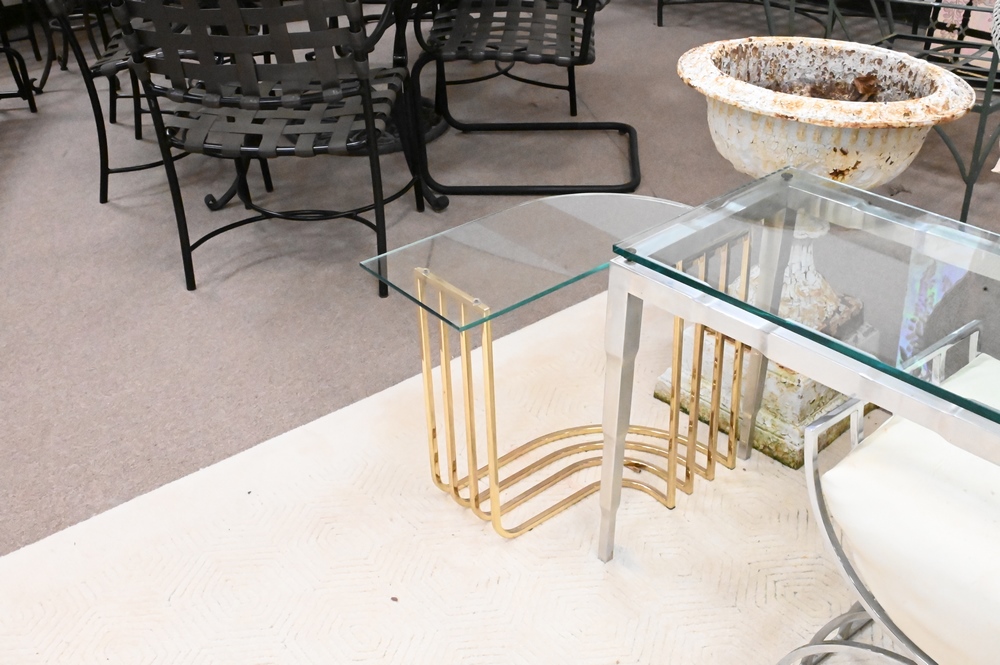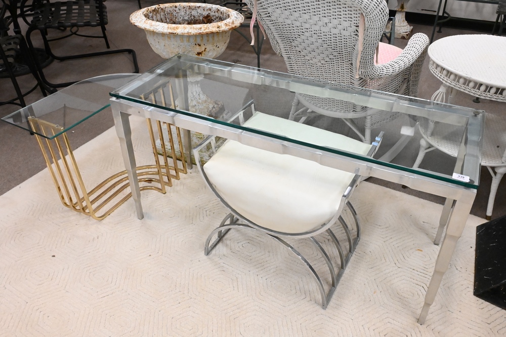 Lot 339: Three Piece Lot, to include an unusual 1970’s Bespoke metal vanity and bench, height 20 1/2 inches, width 47 inches, depth 17 inches; along with a post modern brass and glass Milo Baughman style side table, height 20 inches, width 14 inches, depth 22 1/2 inches.