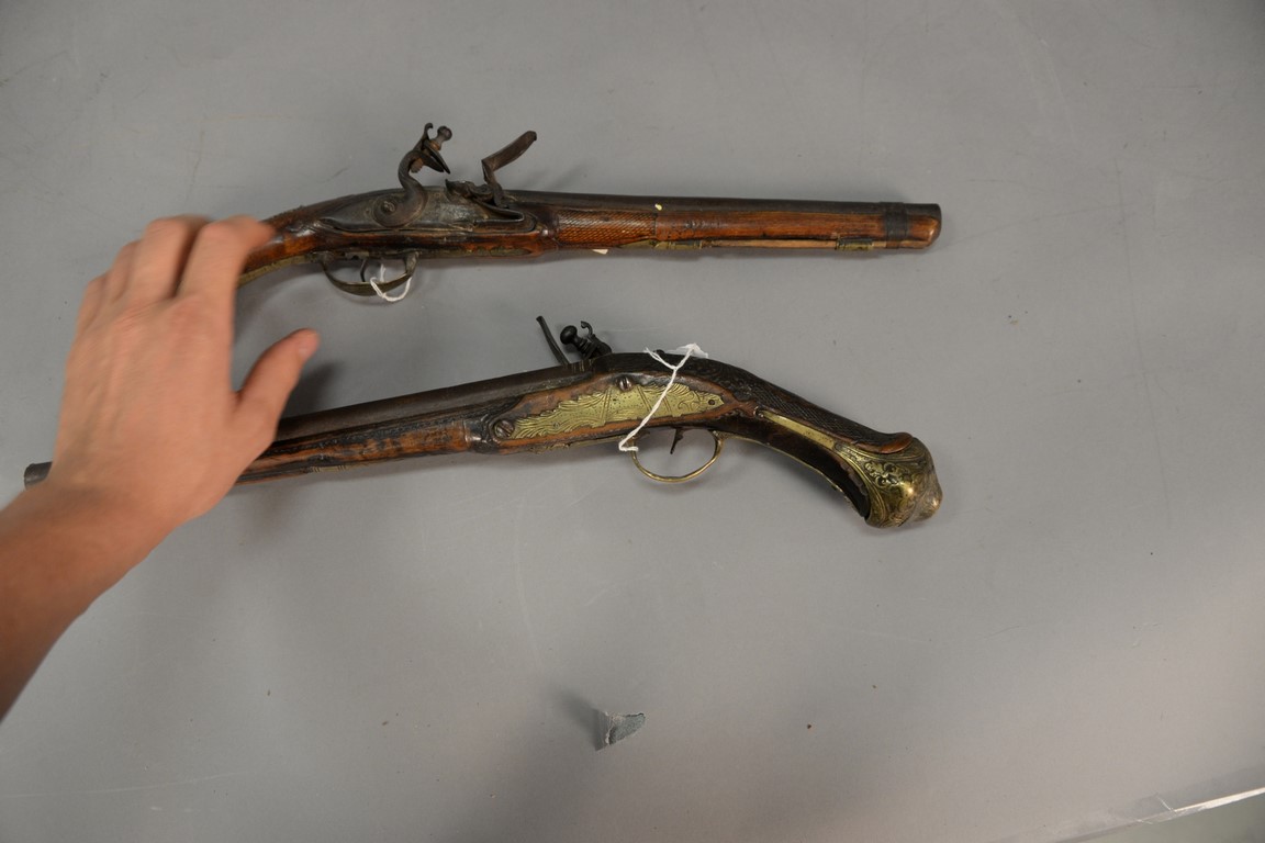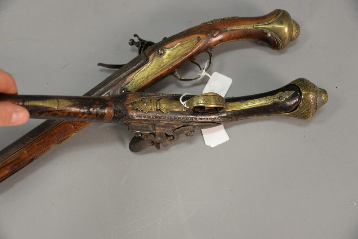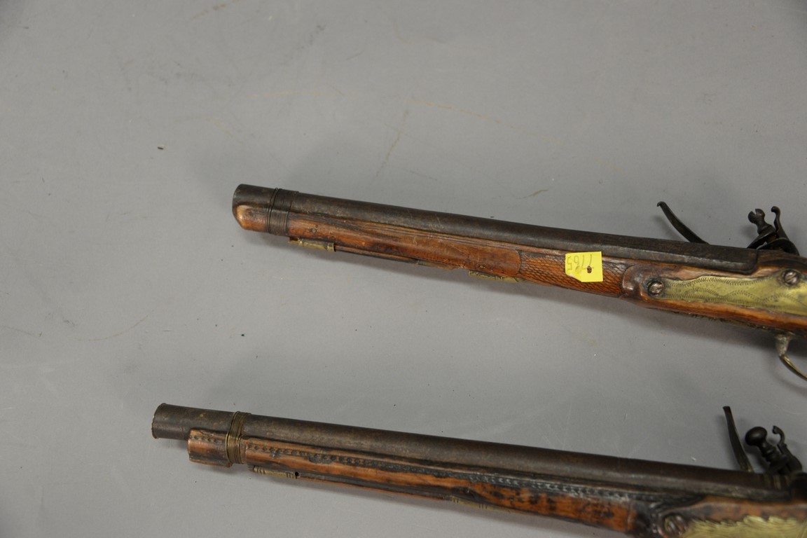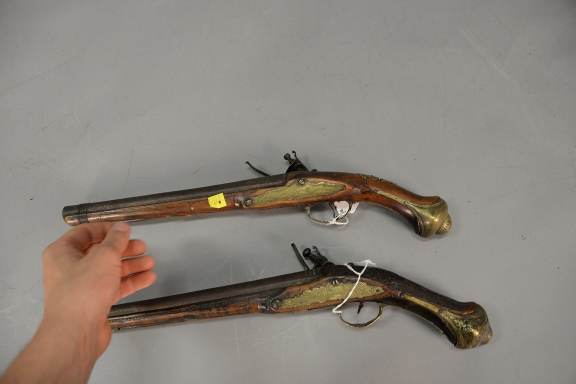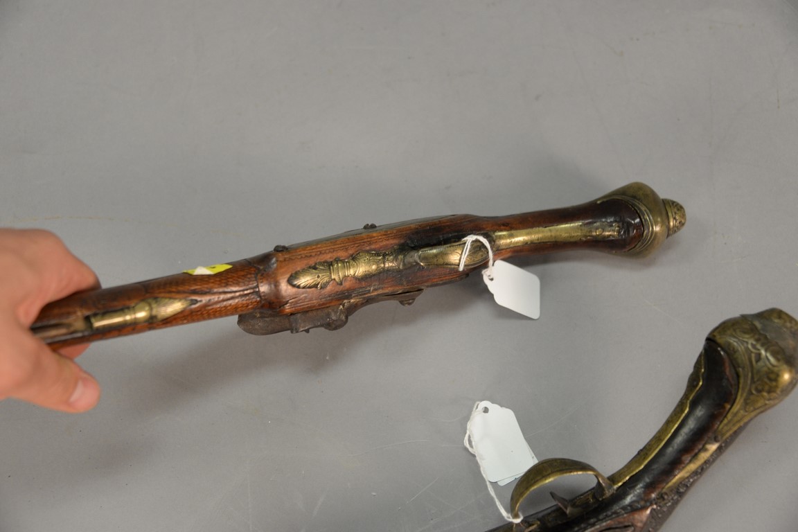 Two flintlock pistols with inset brass plaques and carved wood stock. lg. 19in. & 20in.