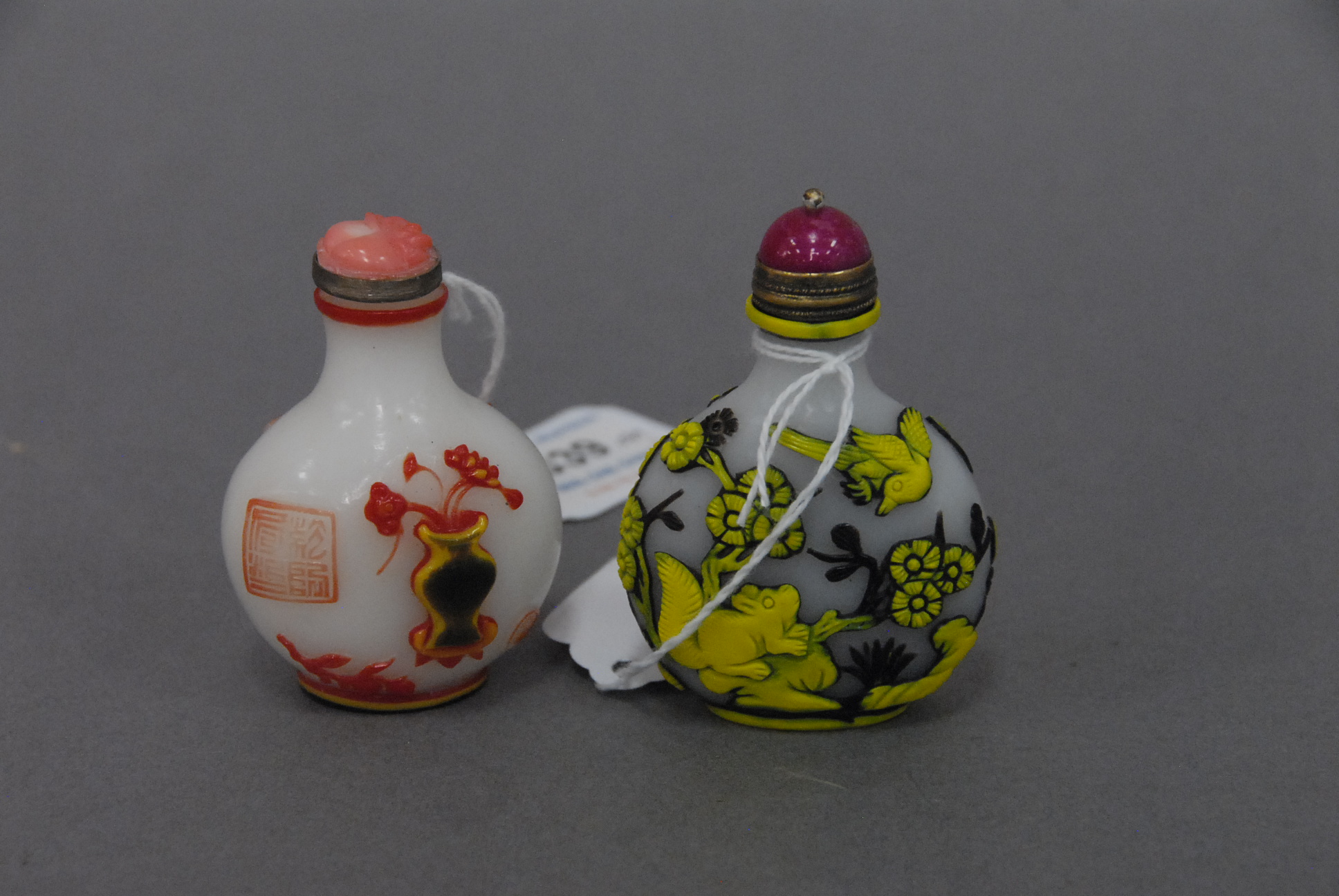 Two snuff bottles milk glass snuff bottle green, yellow and red glass overlay signed Qing Dynasty with pink glass top, ht 2 1/2 and carved milk glass snuff bottle with two color glass overlay of brown and yellow tree branches, birds, blossoming flowers and a squirrel, having red glass top, ht 2 3/4.