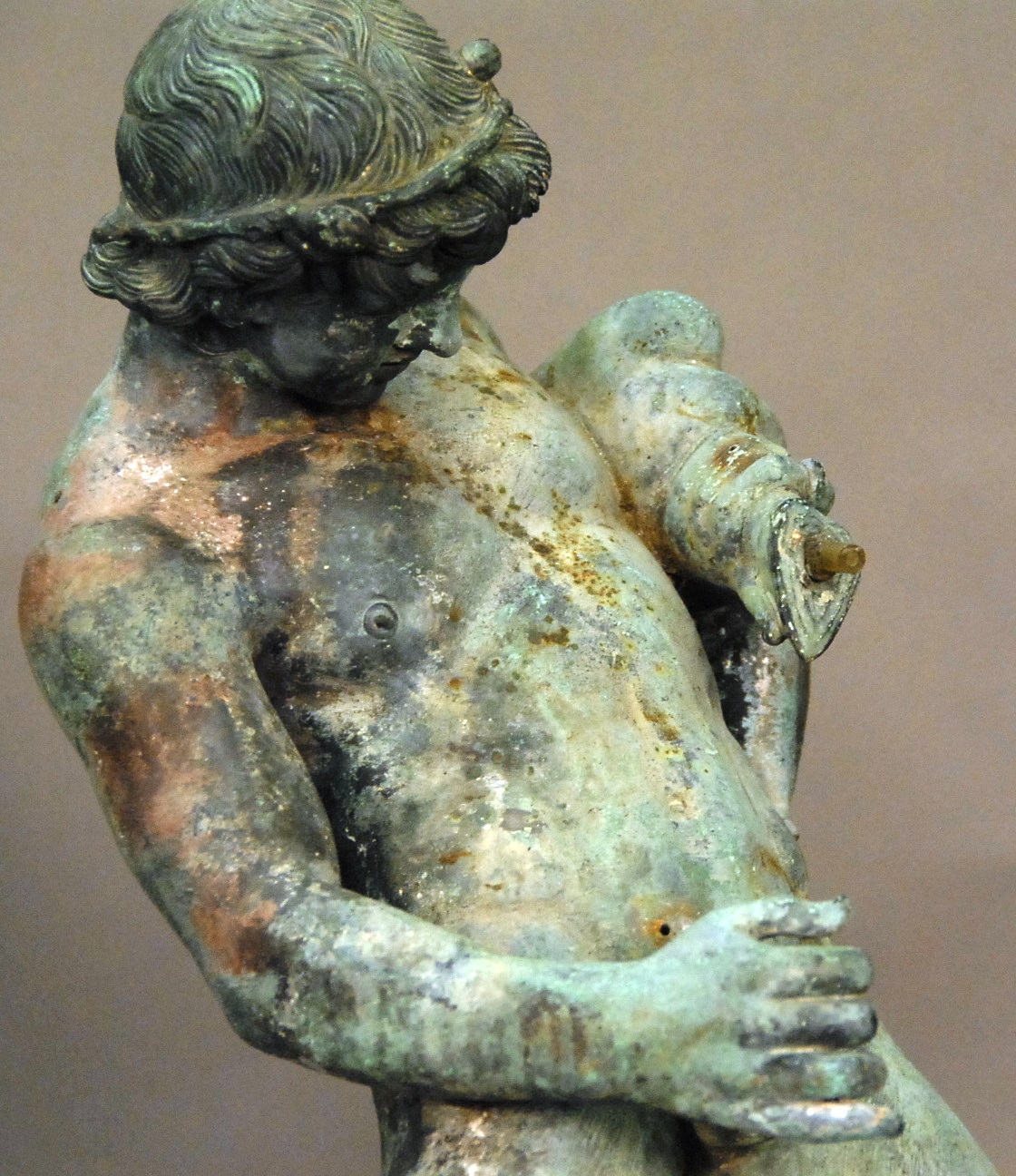 Bronze sculpture of man holding a pig who’s foot is a fountain on rectangular white marble base.