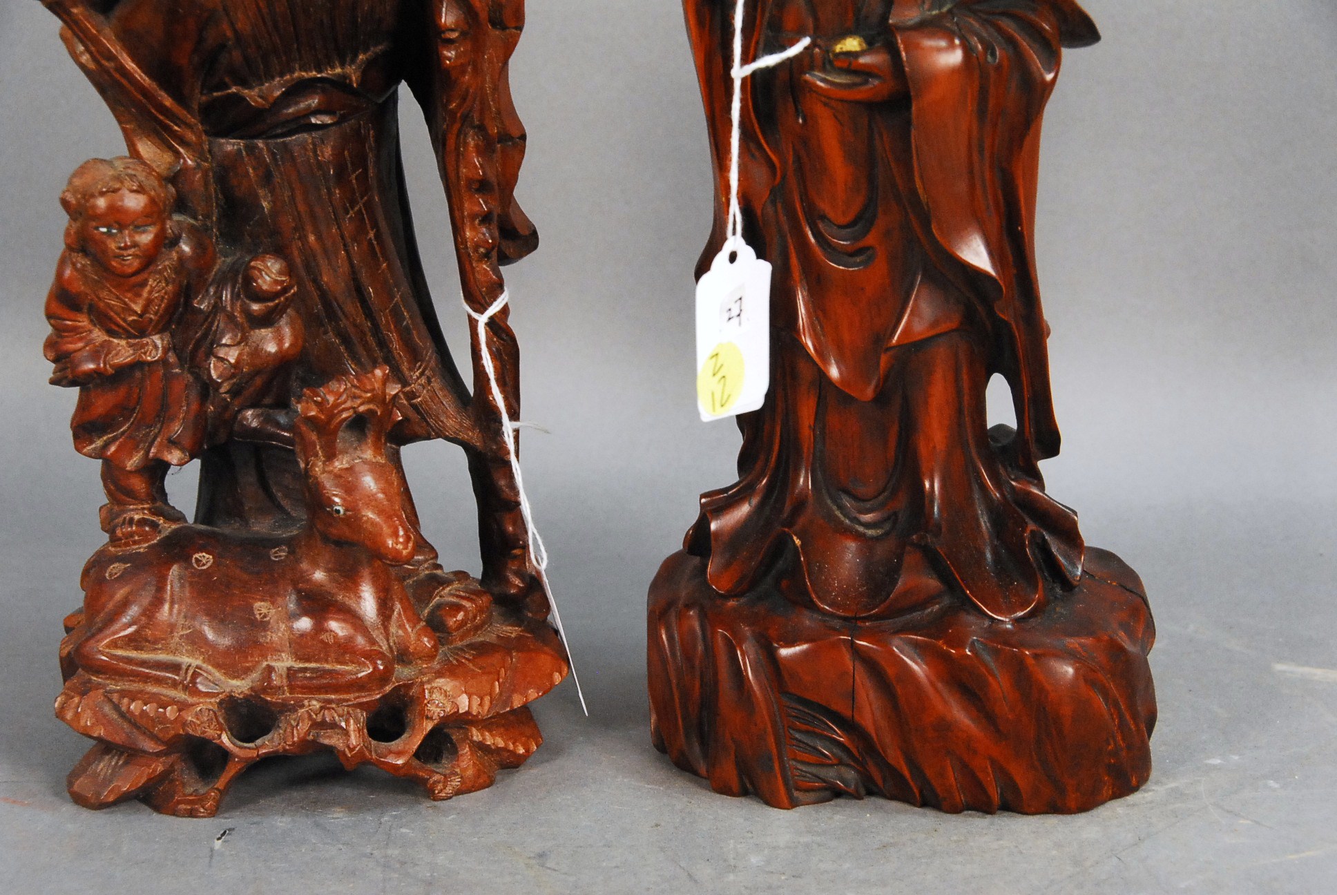 Carved hardwood figure of a guanyin, standing on a carved wood base, with gold face, ht 13 and carved hardwood figure of a scholar with walking stick having two children and a deer with him, ht 12 1/4.