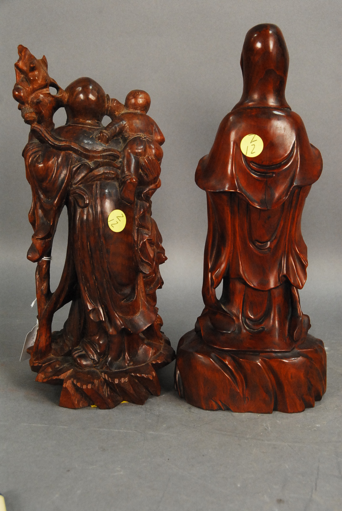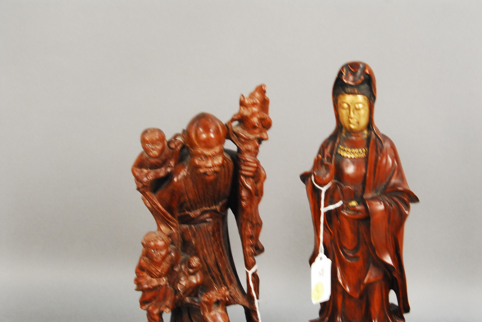 Lot 34: Carved hardwood figure of a guanyin, standing on a carved wood base, with gold face, ht 13 and carved hardwood figure of a scholar …