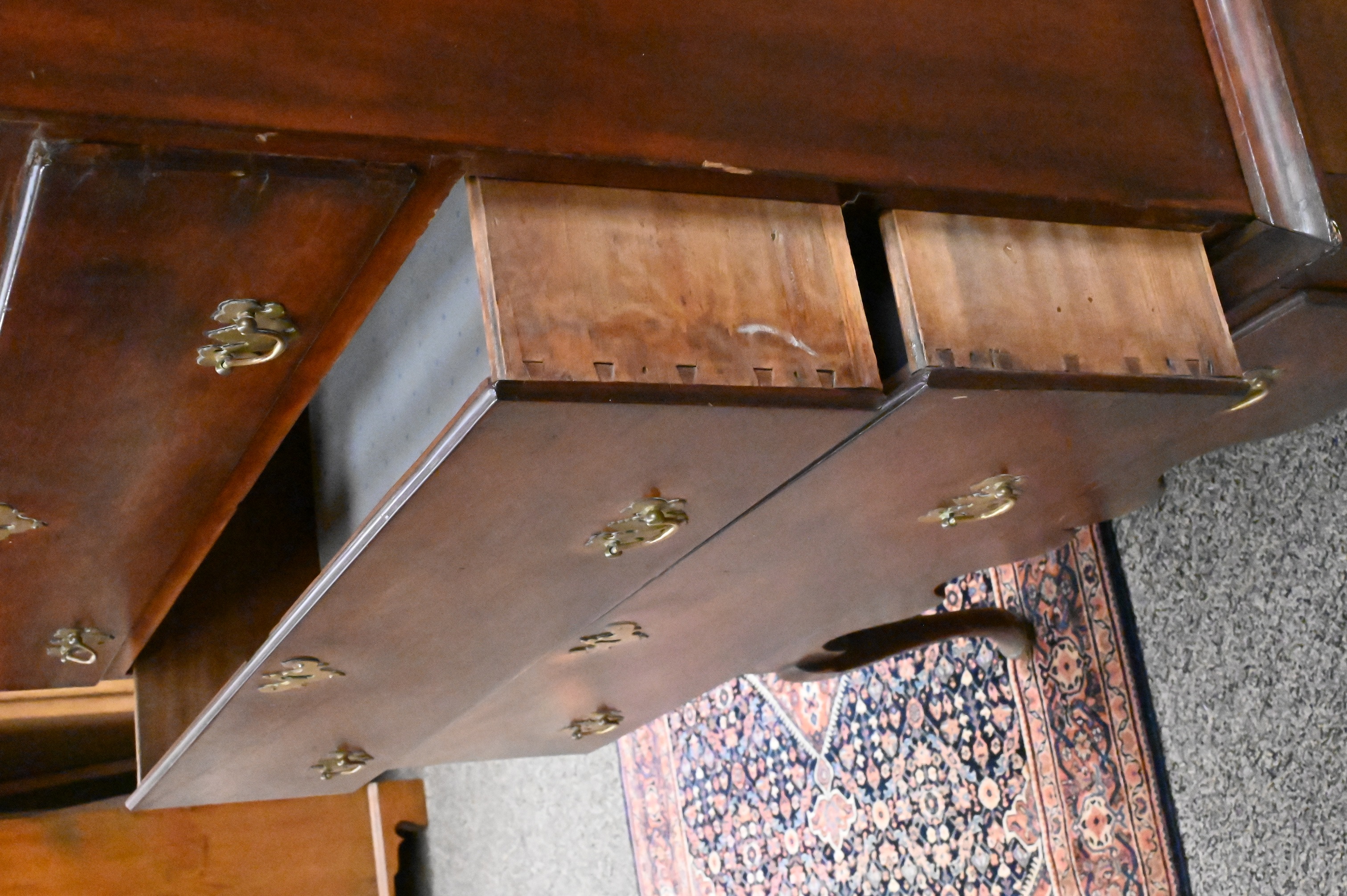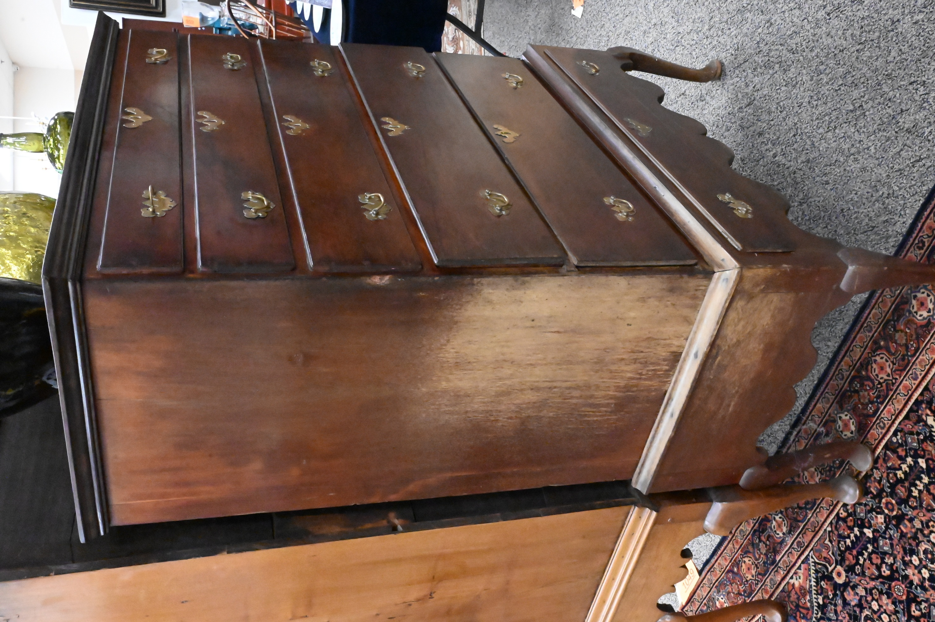 A two-part lift-top blanket chest in cherry, the upper section with three false drawers over two working drawers, the hinged top opening to a deep well interior. The lower section fitted with a single long drawer, raised on cabriole legs ending in pad feet with shaped apron. Retains some original brasses, with others later.
