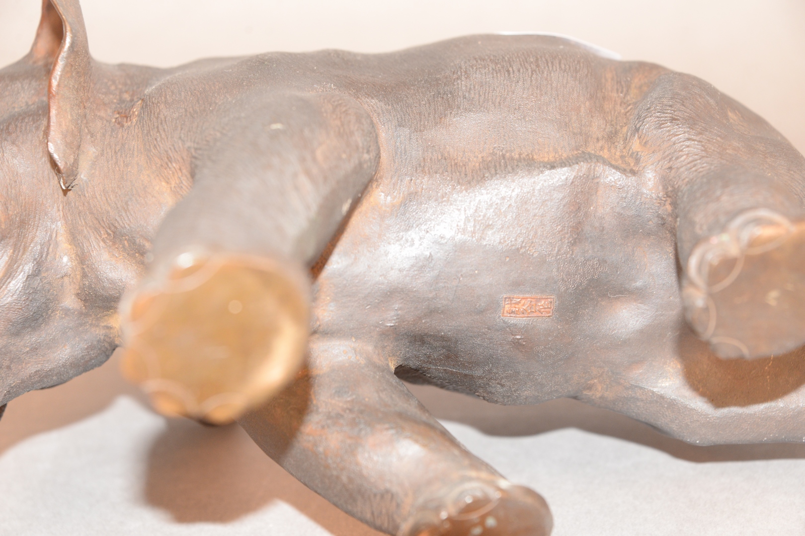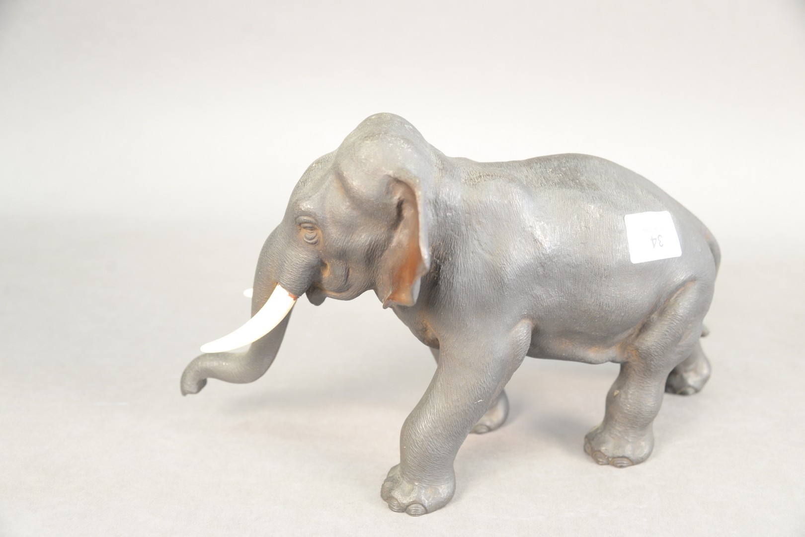 Lot 34: Chinese Bronze Elephant Sculpture, having white tusks, marked with three characters to the underside, height 8 inches, length 12 1/2 inches, width 7 inches. Provenance: Estate of James Wadhams.