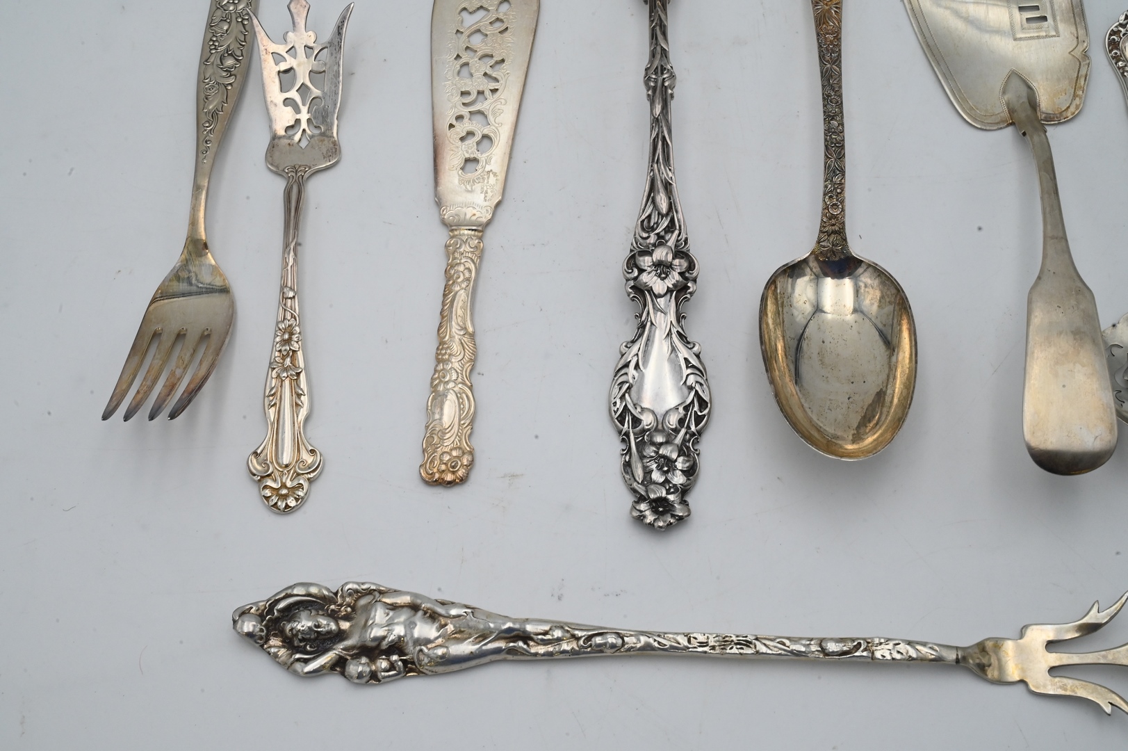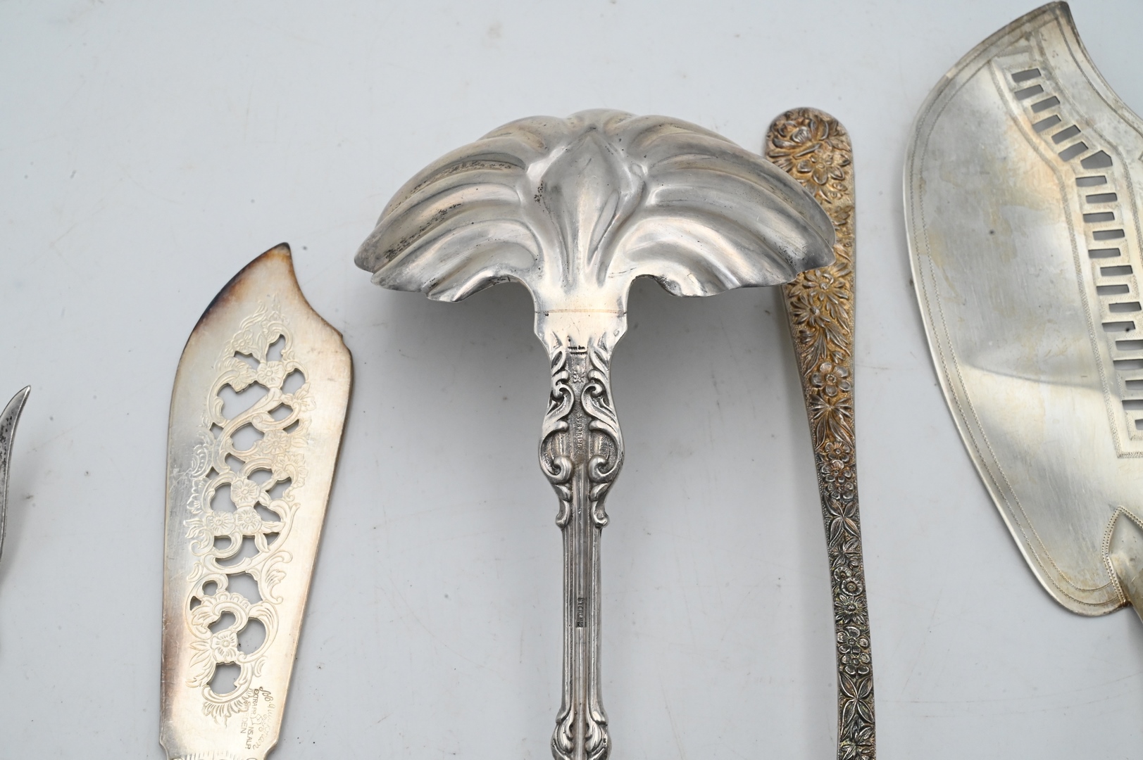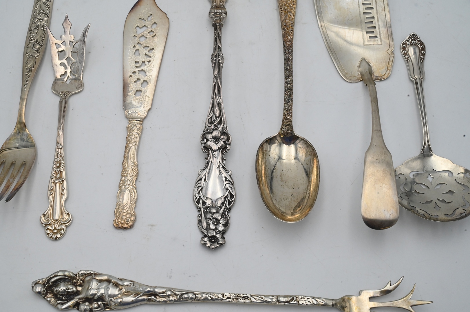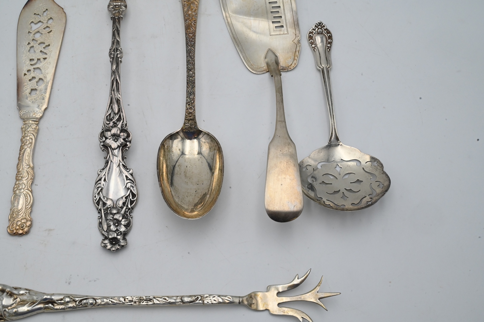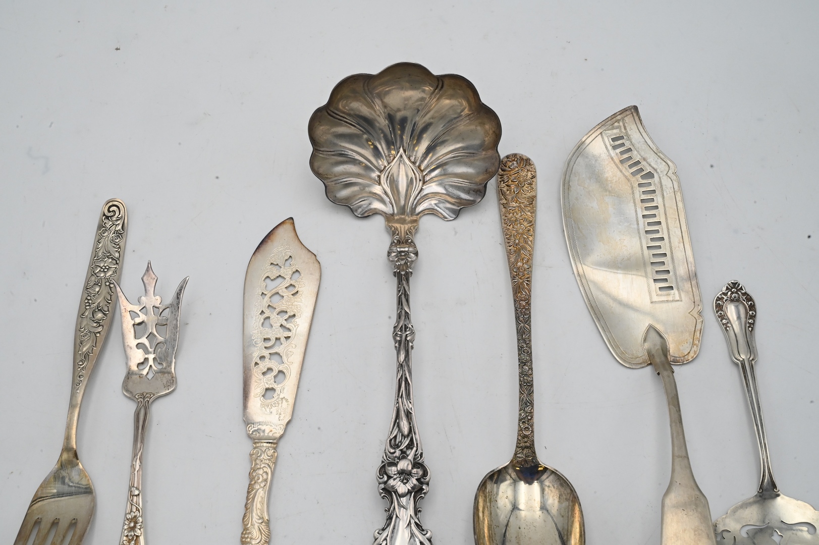 Eight Piece Group of Assorted Sterling Silver Serving, to include a large S. Kirk & Son spoon; along with an English ladle; longest 12 inches, 28.5 t.oz.