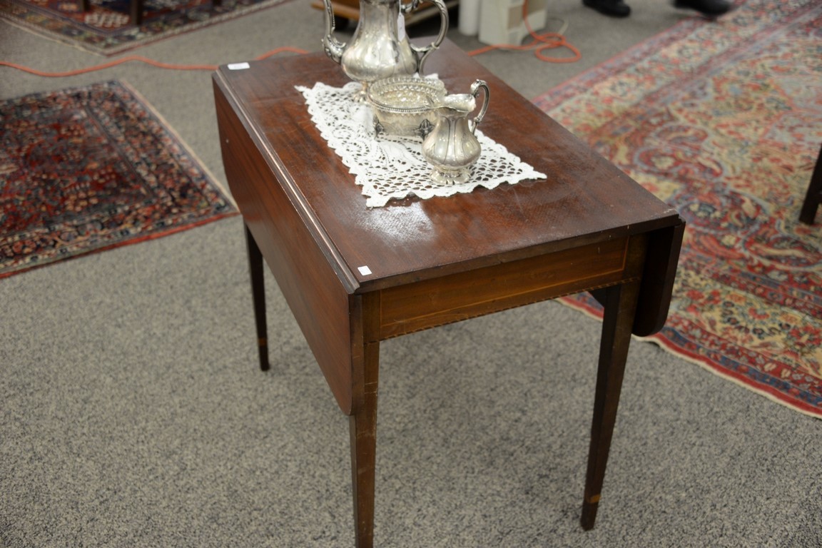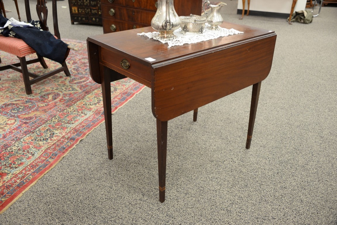 Lot 34: Federal mahogany drop leaf Pembroke table with drawer and inlay set on square tapered legs. ht. 29in., top closed: 19 x 33, top op…