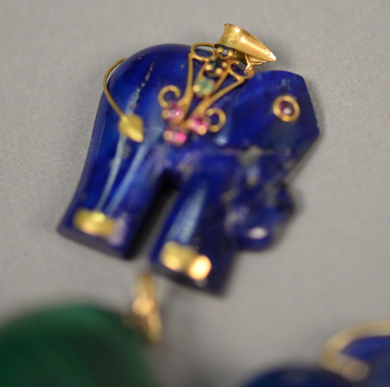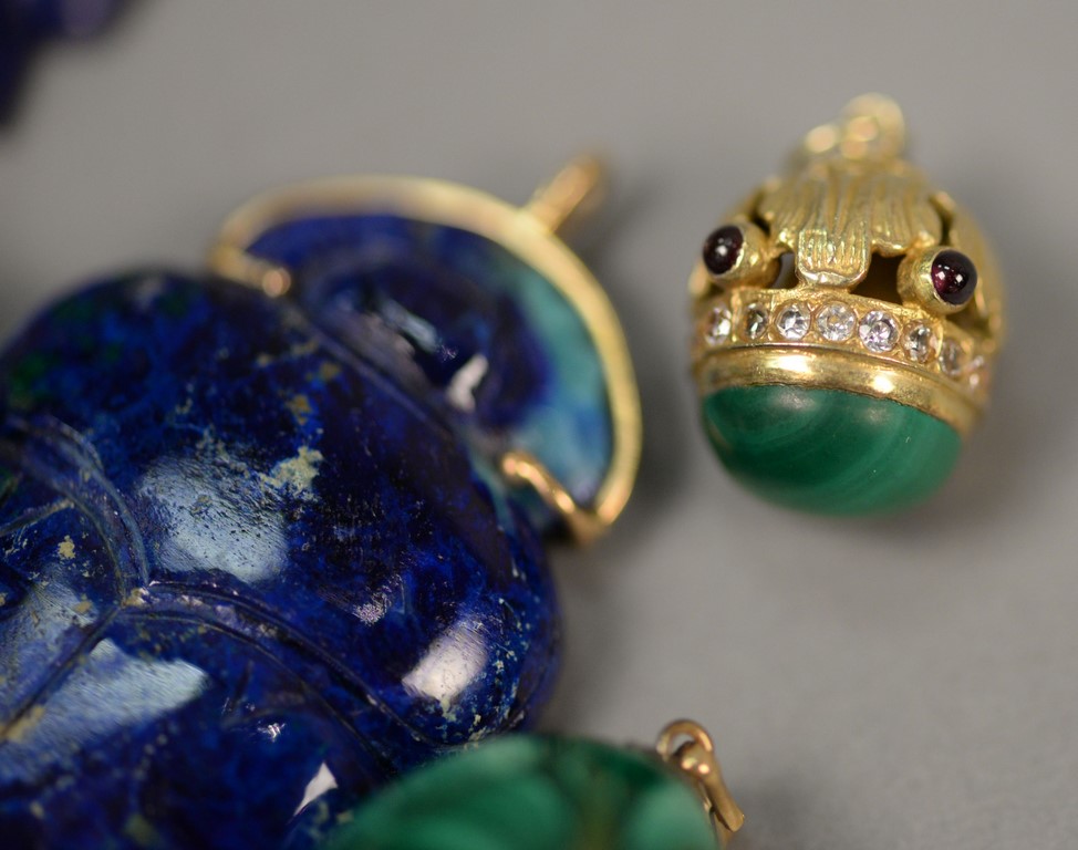 Lot 34: Five pendants including two carved lapis elephant and scarab, three with malachite and one pendant having gold with diamonds. 3/4 in. – 2 in.