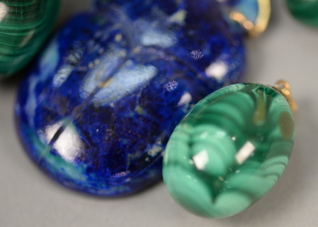 Five pendants including two carved lapis elephant and scarab, three with malachite and one pendant having gold with diamonds. 3/4 in. – 2 in.