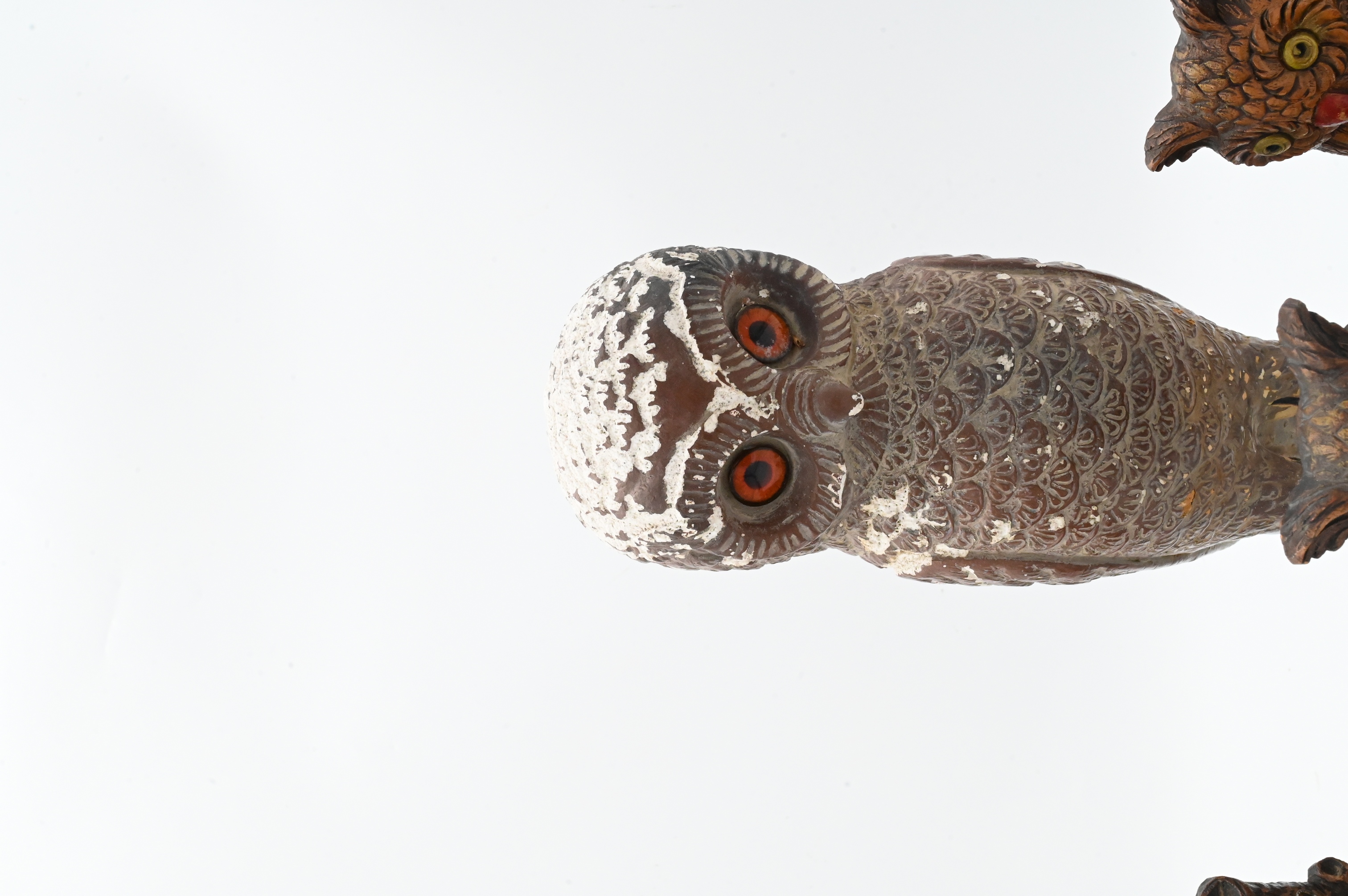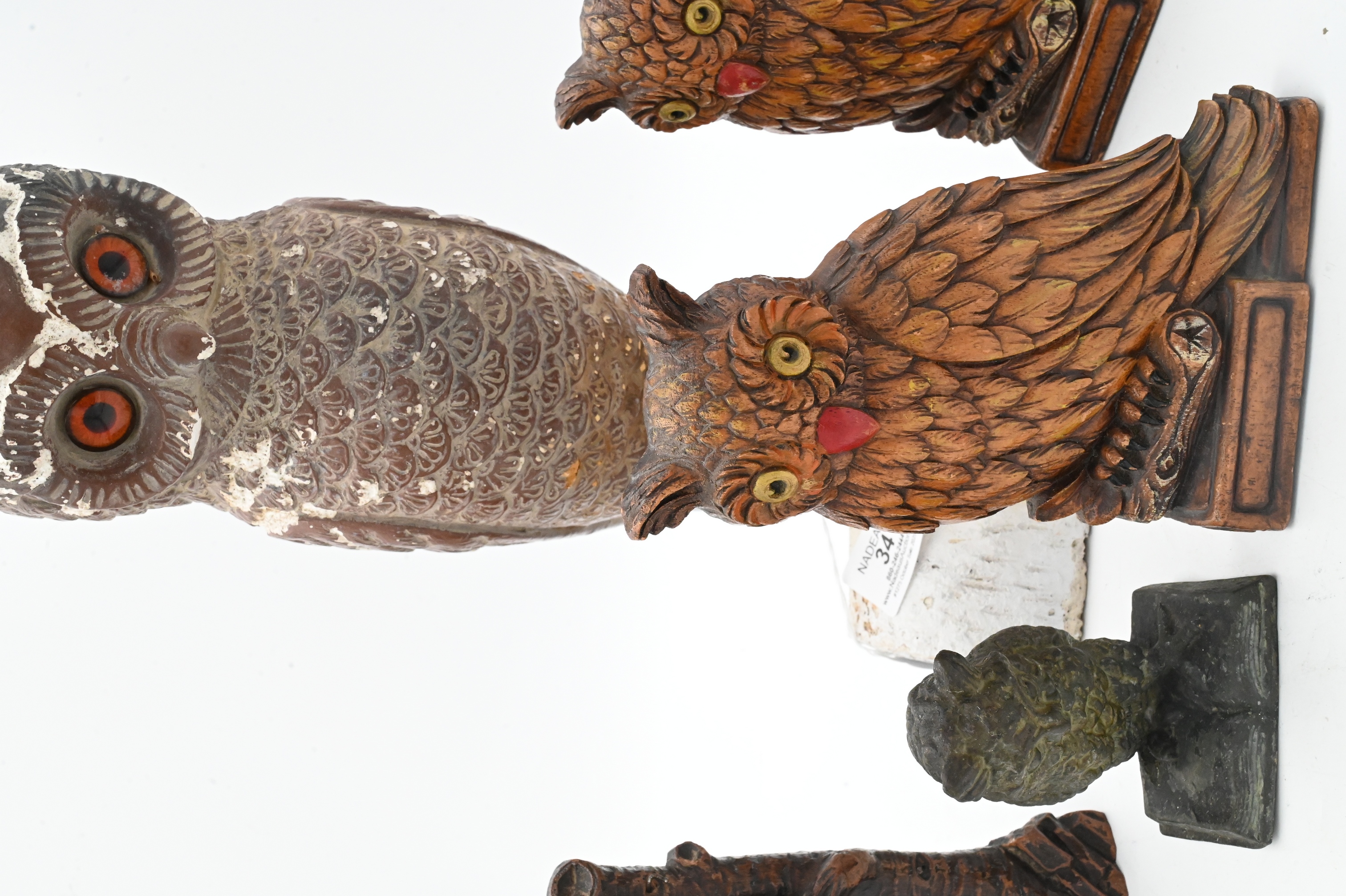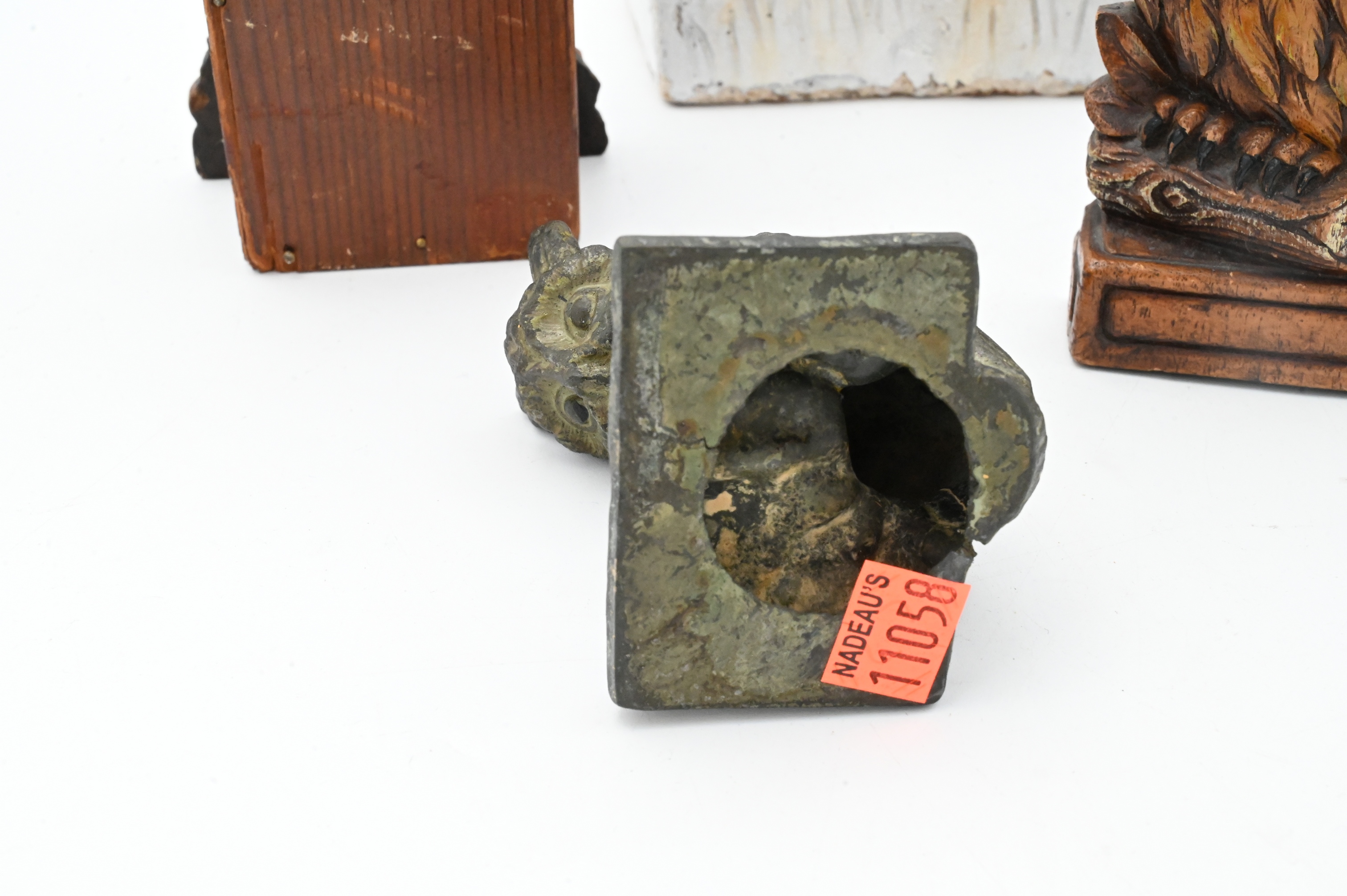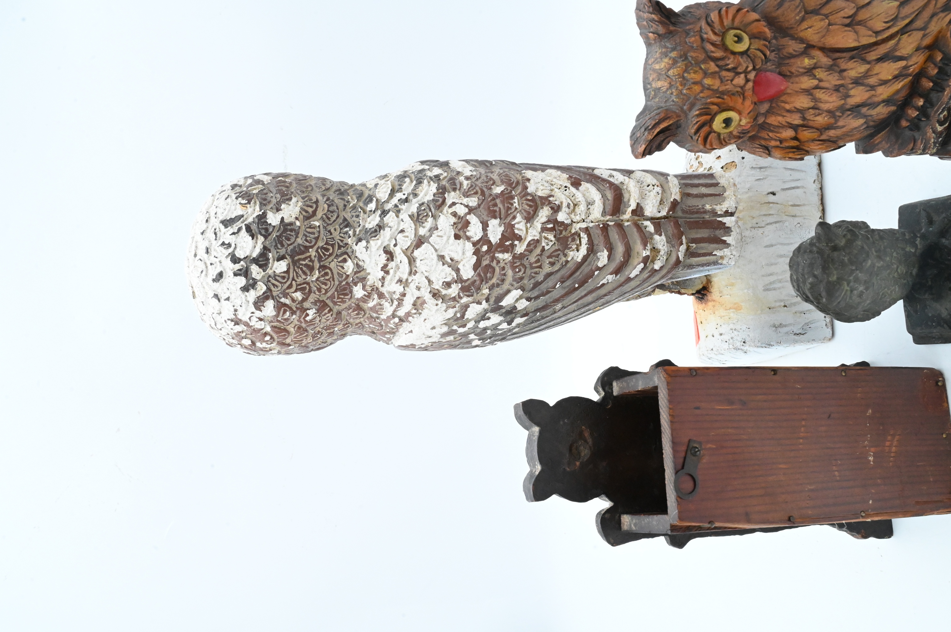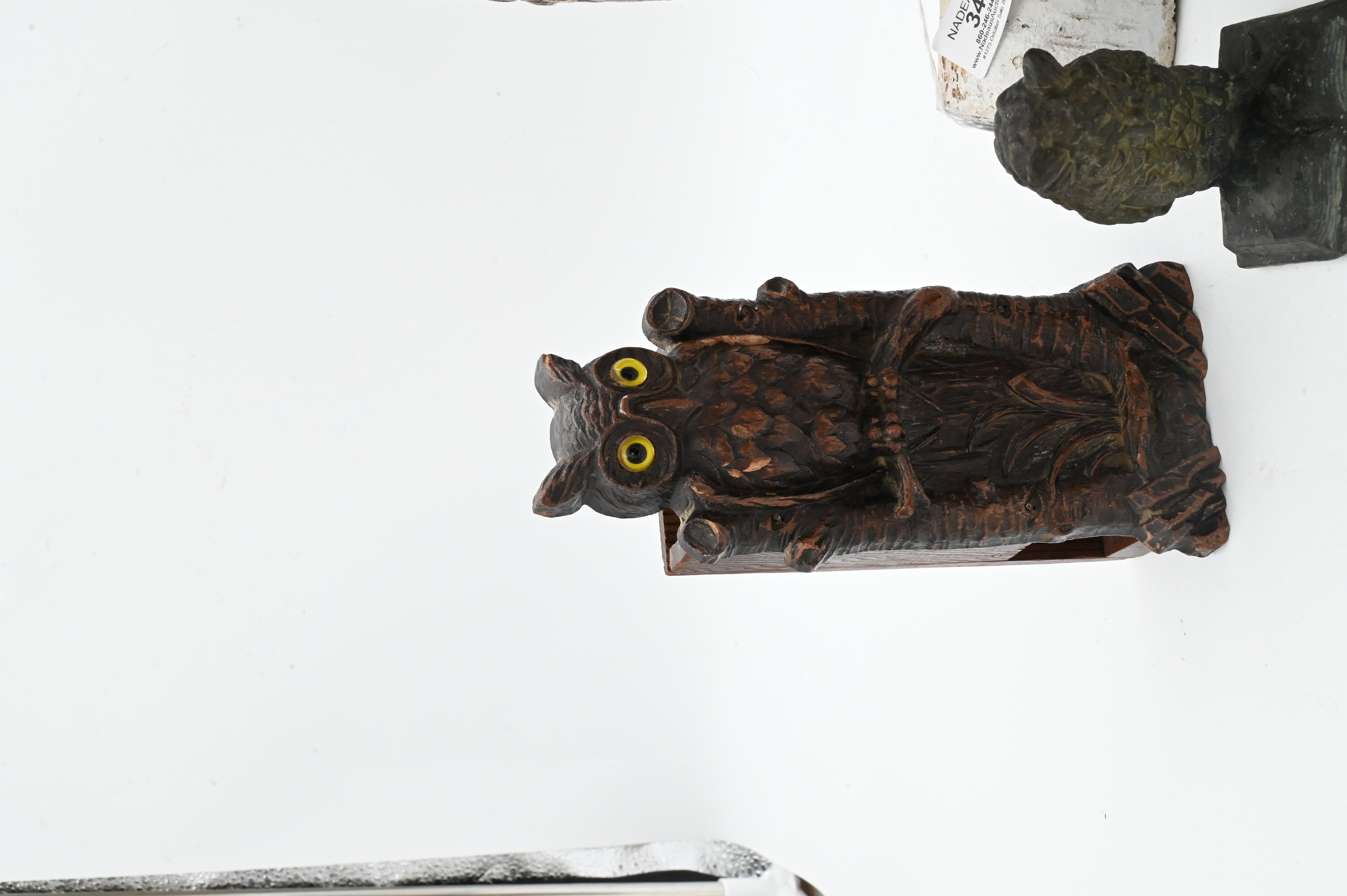 pair of carved and painted bookends, black forest carved pipe of match holder with glass eyes, cast iron owl on book along with Austin Productions 1965 owl model with orange glass eyes