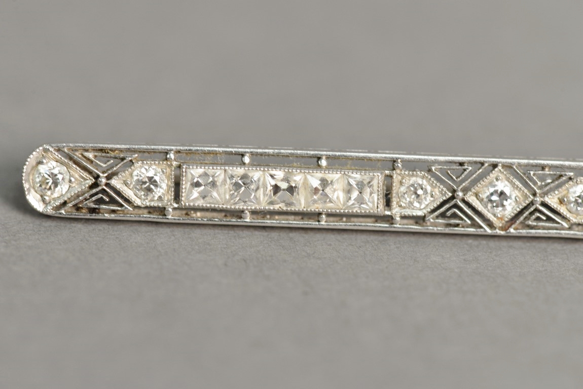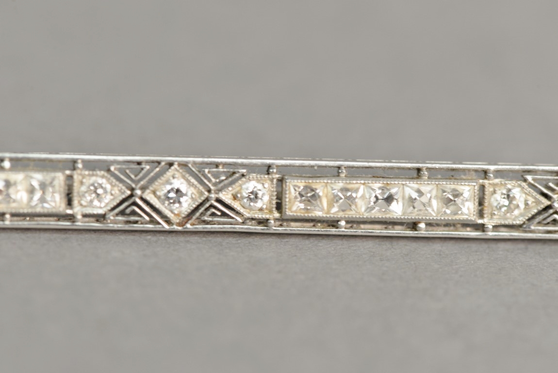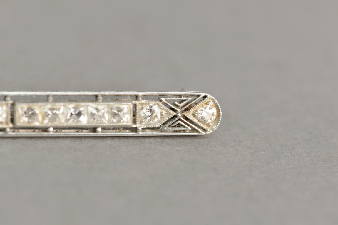 Lot 34: Gold and diamond bar pin set with seventeen diamonds including seven round cut and ten square cut. 7.8 grams total weight
