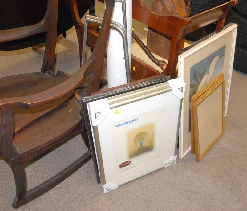 Group lot gossip bench, small curio, Victorian clock, several frames, and rocker.