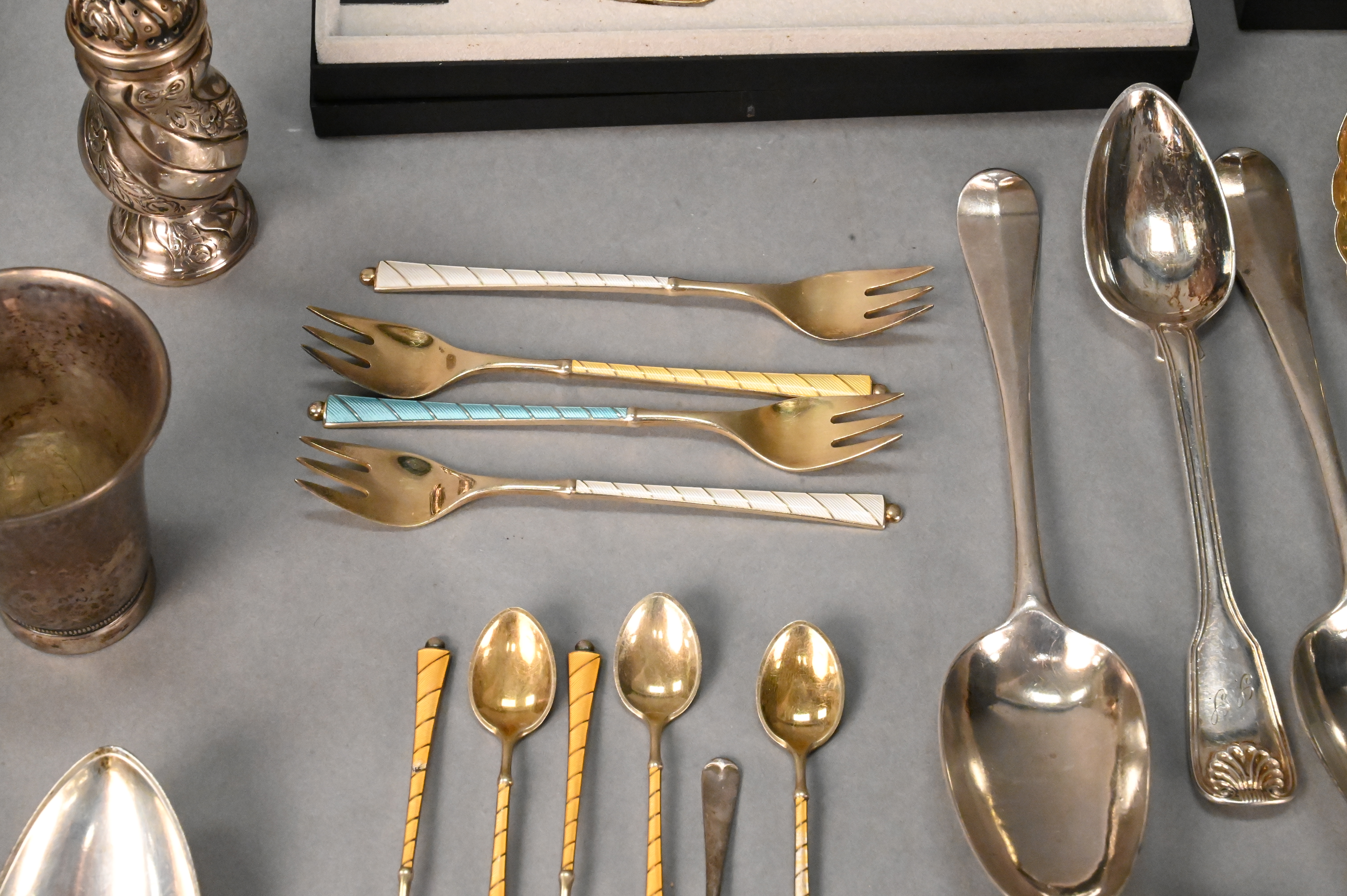 to include two 1981 Georg Jensen annual spoon and knife set, enameled spoons and forks, and several sized spoons having Swedish hallmarks