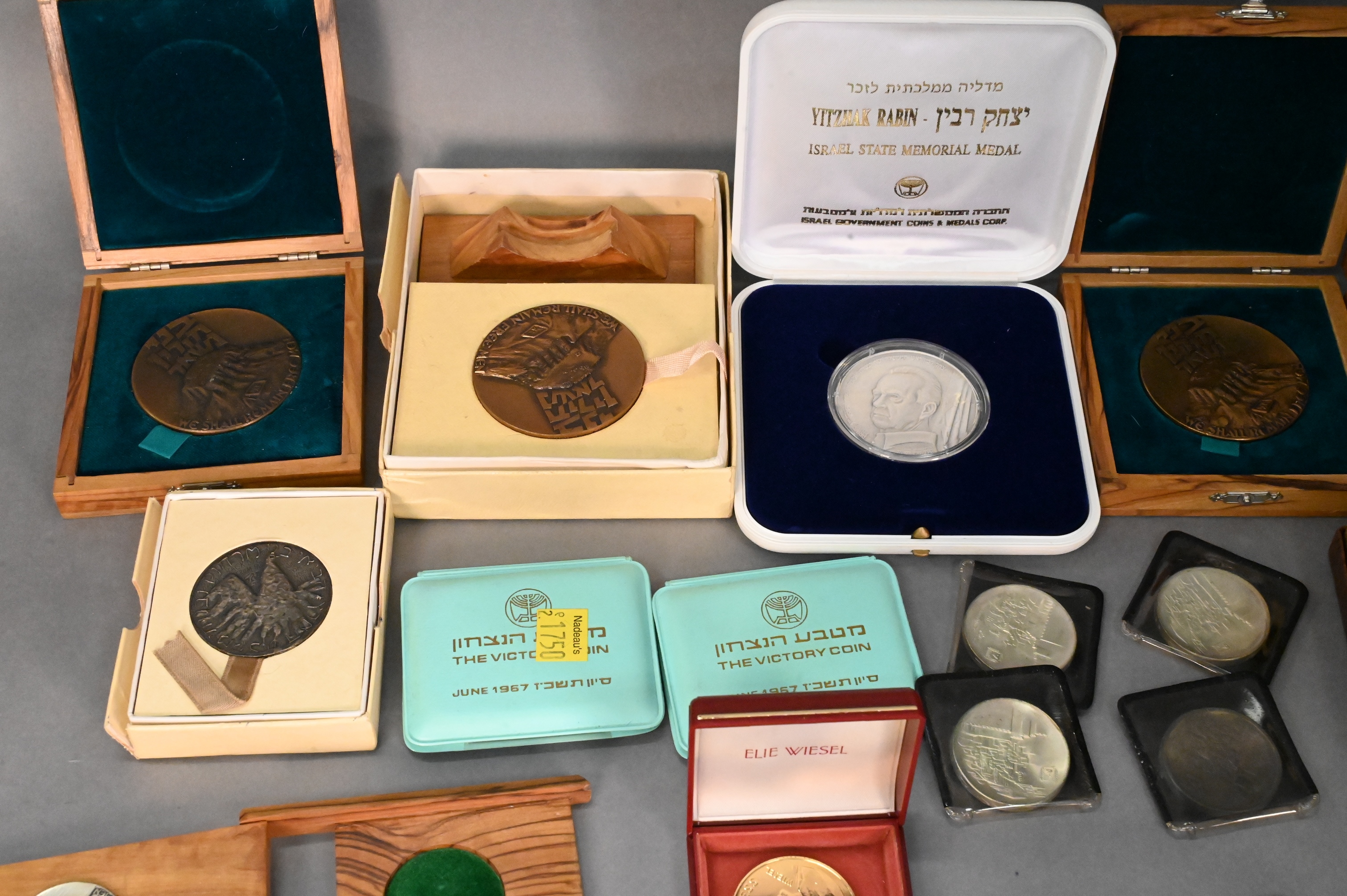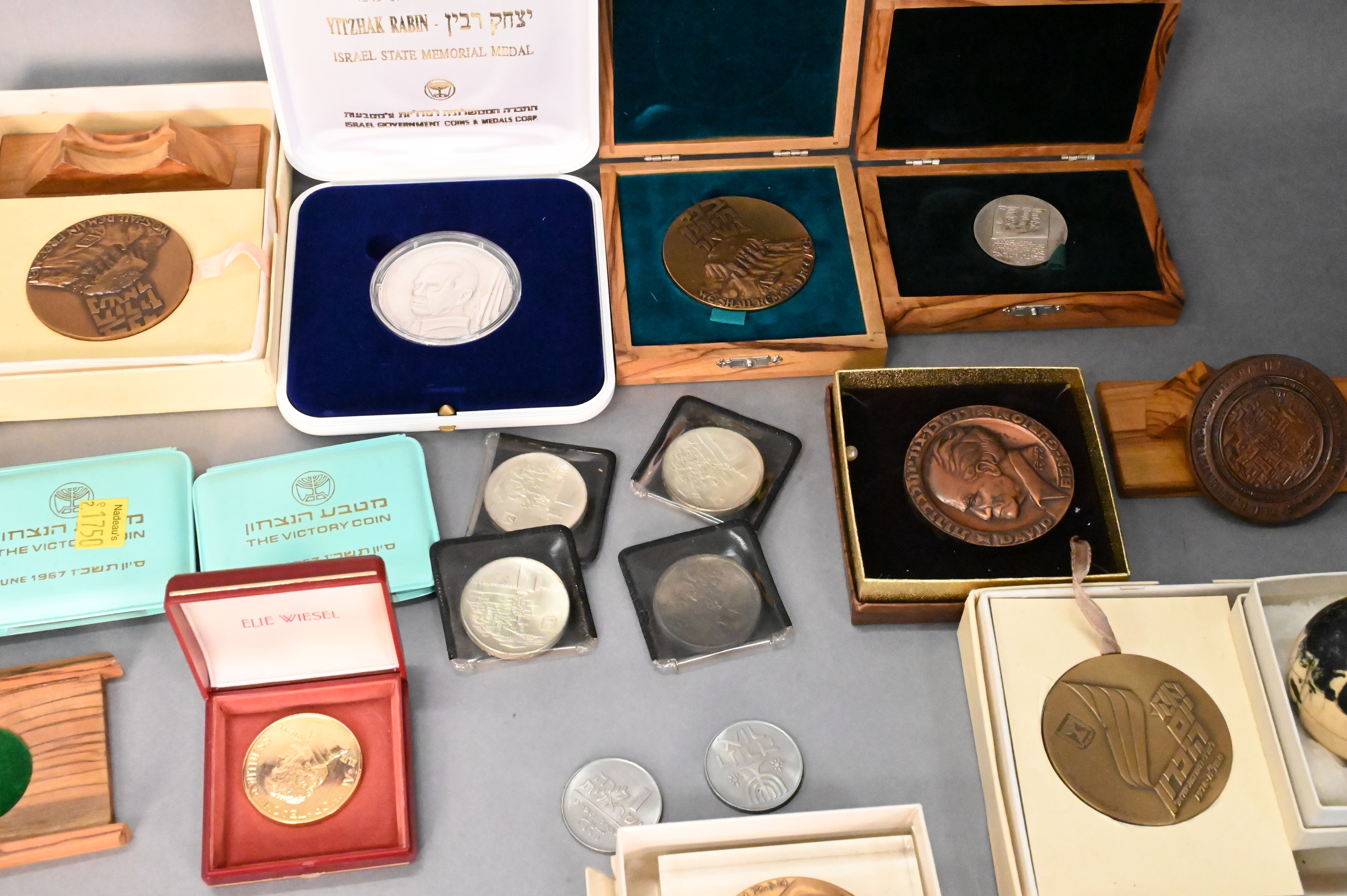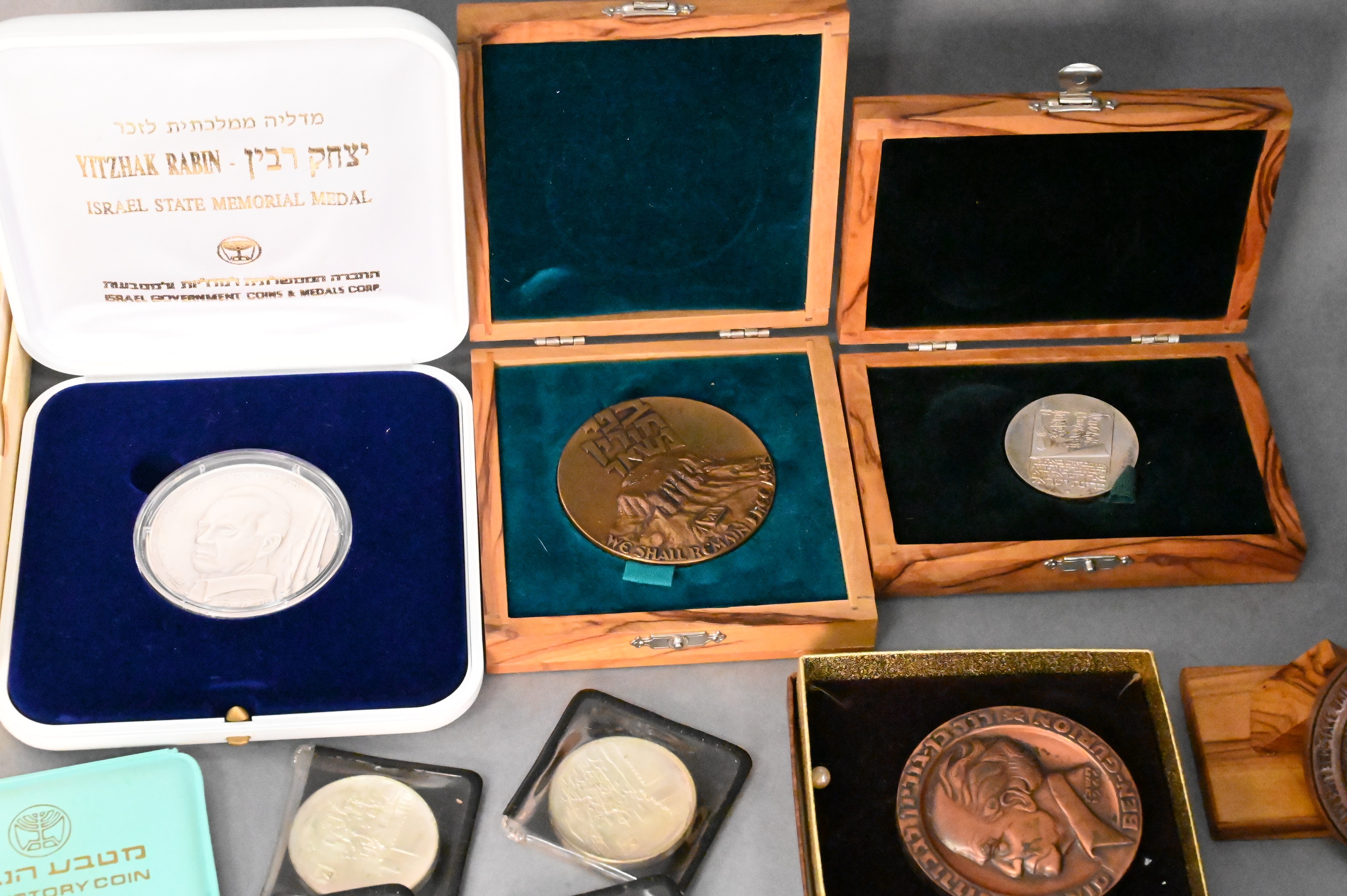 To include 4 Masada three in bronze and one in .935 sterling silver, 4 Jerusalem Israel’s 20th Anniversary 1948-1968 (.900) , two The Victory Coin 1967 (.935 sterling), 1973 Israel 10 Lirot Menorah 25th Anniversary (.900), Israel museum le musee d’israel (.935 sterling), “Bring Back My Sons…and Daughters” (.935 sterling), and Yitzhak Rabin 60g 999.9 fine silver medal, along with various bronze medals and sets, some with cases/boxes, total silver weight 12.7ozt.