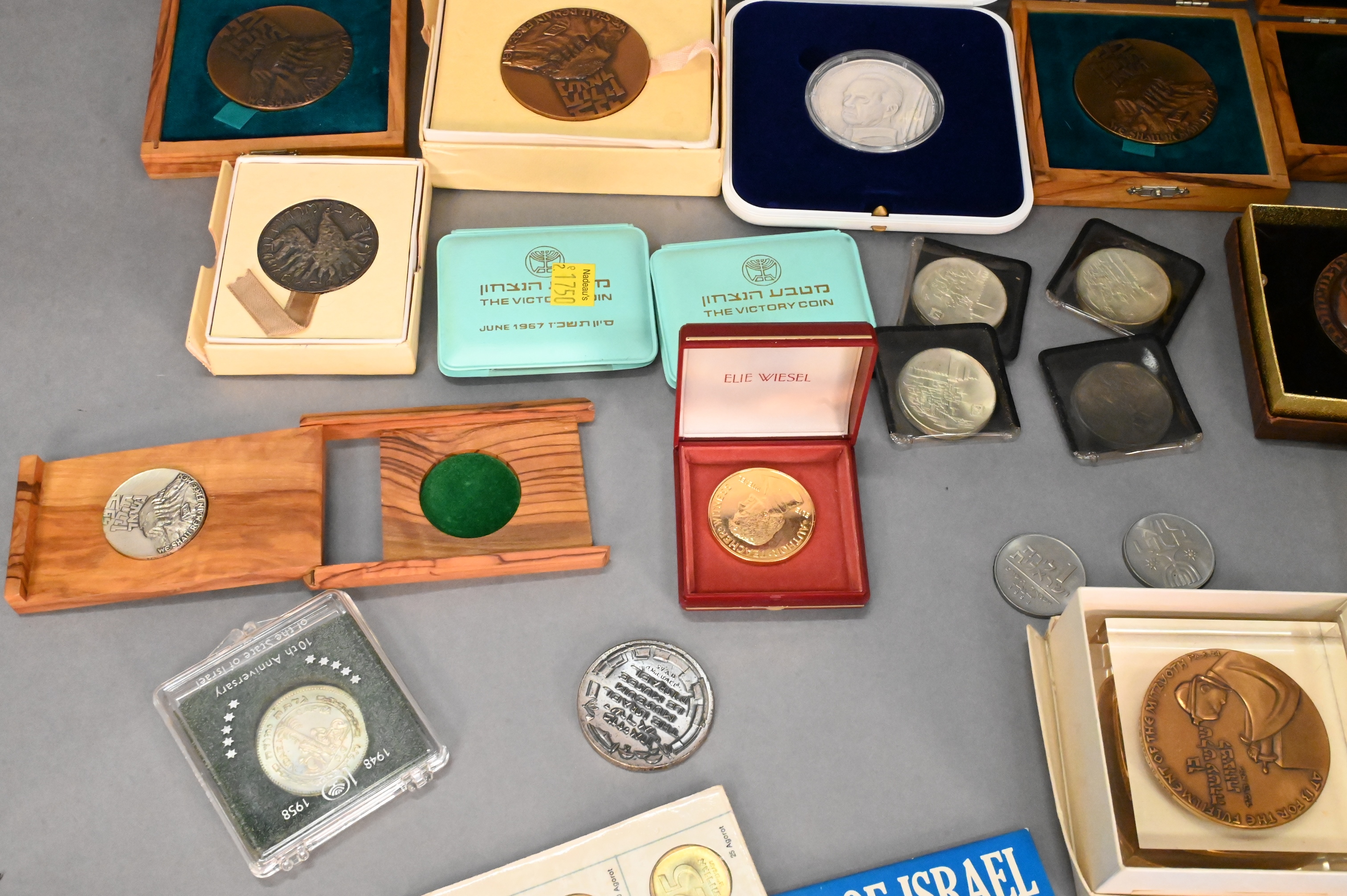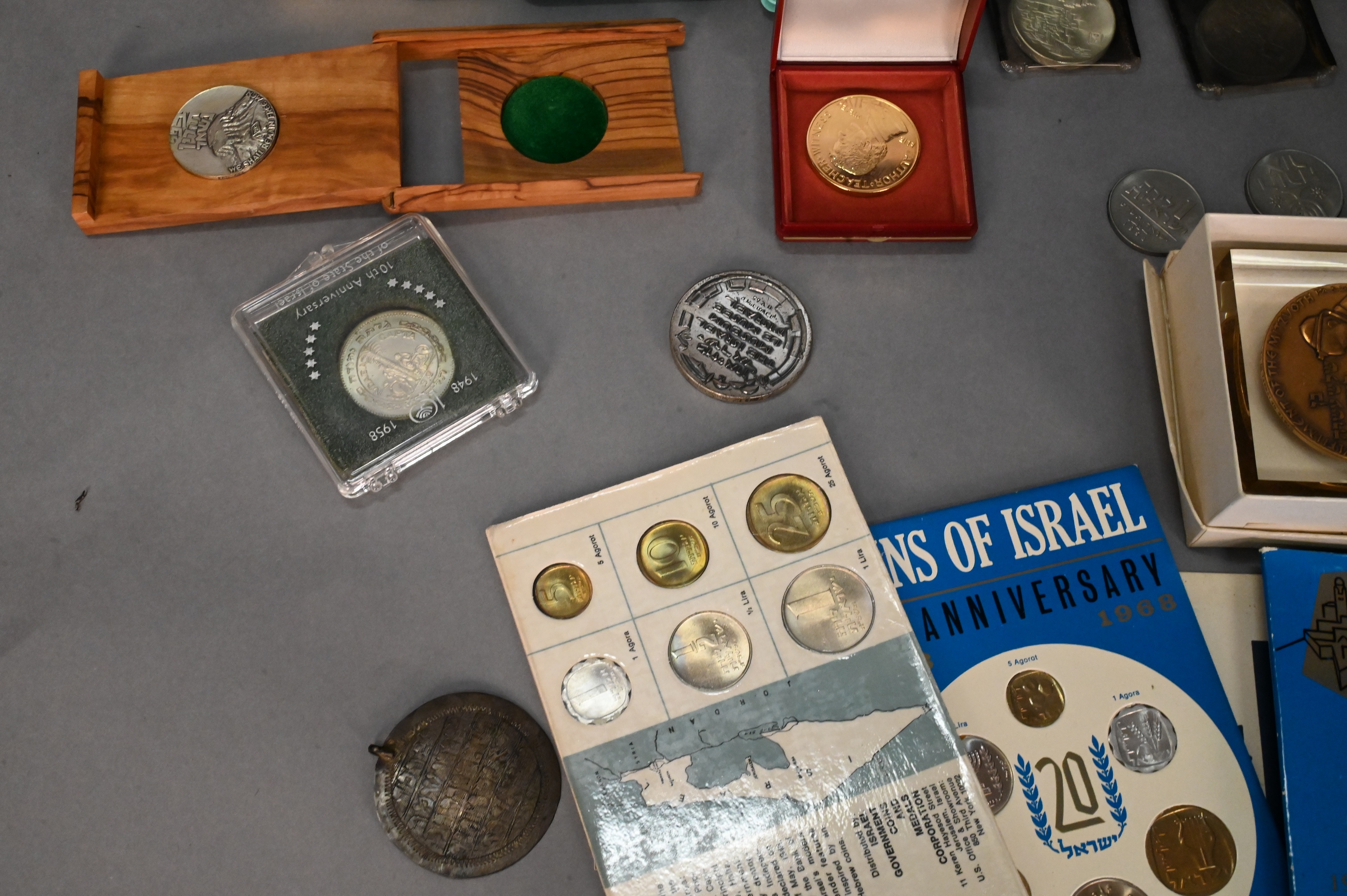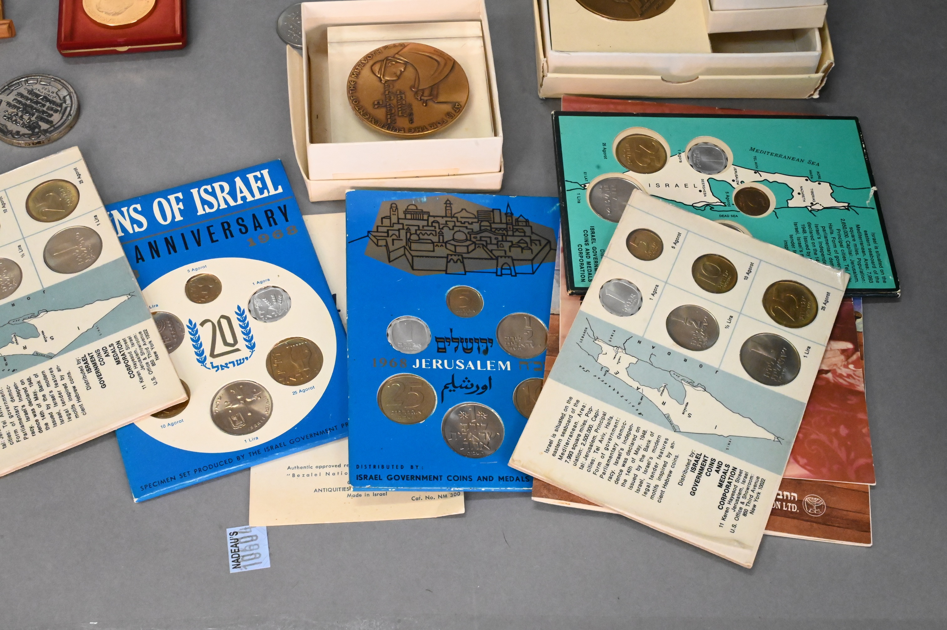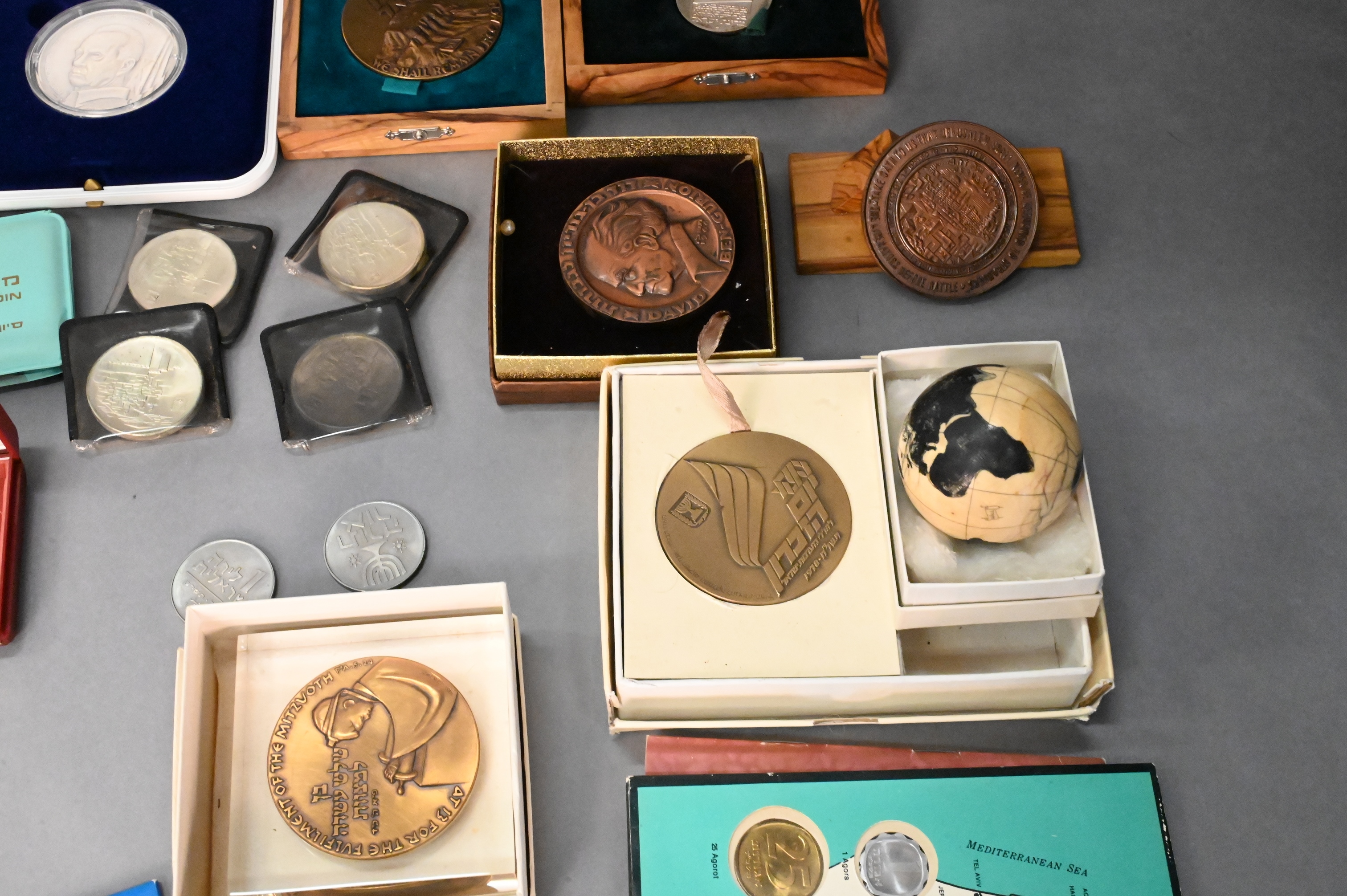 To include 4 Masada three in bronze and one in .935 sterling silver, 4 Jerusalem Israel’s 20th Anniversary 1948-1968 (.900) , two The Victory Coin 1967 (.935 sterling), 1973 Israel 10 Lirot Menorah 25th Anniversary (.900), Israel museum le musee d’israel (.935 sterling), “Bring Back My Sons…and Daughters” (.935 sterling), and Yitzhak Rabin 60g 999.9 fine silver medal, along with various bronze medals and sets, some with cases/boxes, total silver weight 12.7ozt.